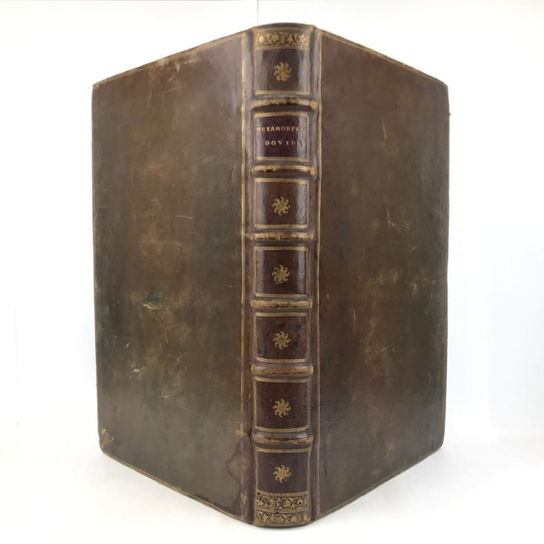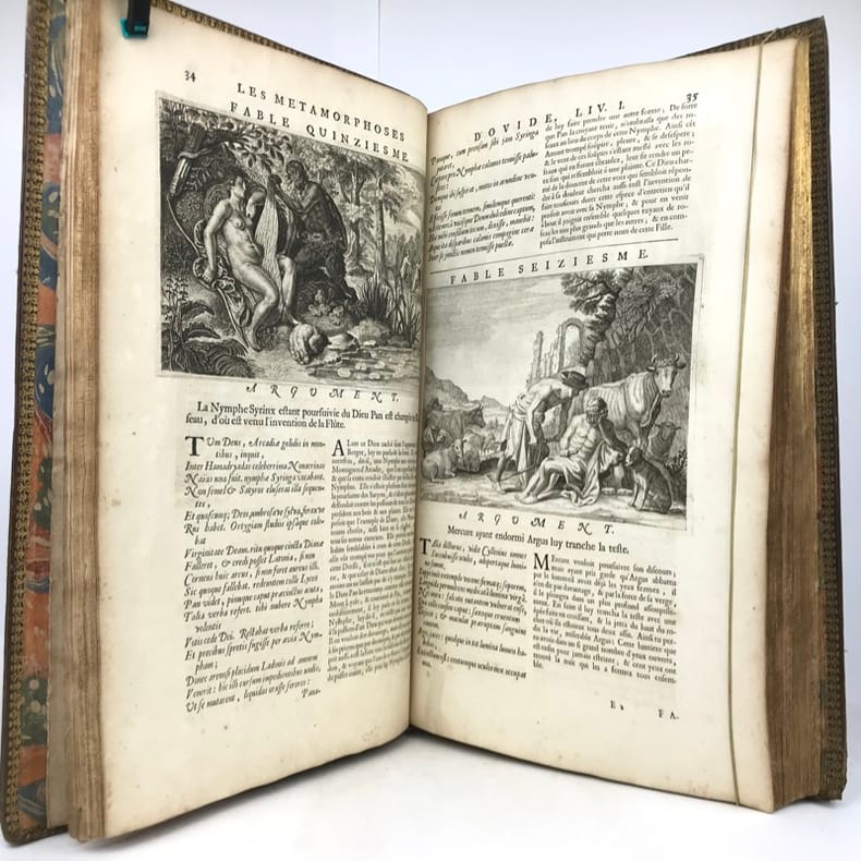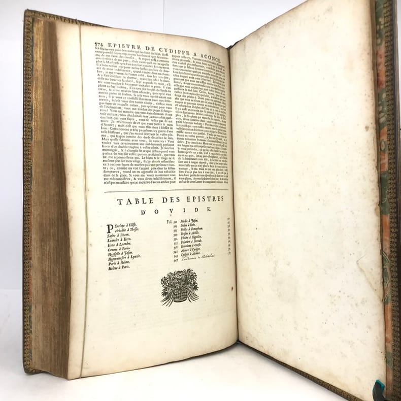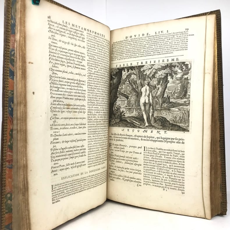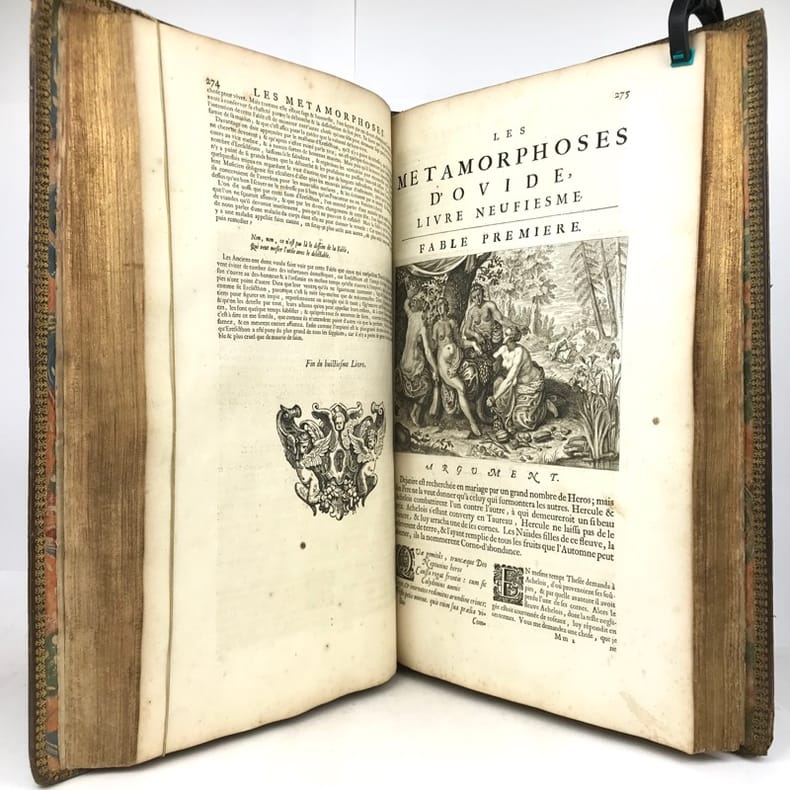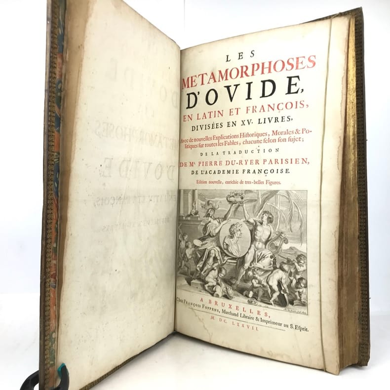 1 volume in-plano (45,5 x 27,5 cm), maroquin brun (reliure postérieure du XVIIIe siècle), dos à nerfs orné, double filet doré encadrant les plats et sur les coupes, roulette doré sur les chasses, tranches dorées, titre en rouge et noir, [16]-574 pages (complet). Coins usés, mors, plat inférieur et coupes frottés, quelques taches sur les plats, mouillures angulaires en queue des trois premiers feuillets et des deux derniers, feuillet *8 restauré (un “B” ajouté postérieurement), rousseurs. État correct.Édition richement illustrée d’une vignette sur le titre et de 124 figures dans le texte gravées par Peter Paul et Martin Bouché, Frederick Bouttat et Peter Clouwet, d’après Abraham van Diepenbeeck, Hendrick Abbé et d'autres, travaillant tous à Anvers.“C'est un des [ouvrages les] plus galamment illustrés de tout le XVIIIe siècle”. (Cohen, 769)Nous retrouvons le texte original latin des Métamorphoses d’Ovide, dont la composition débute probablement en l'an 1, face à sa traduction française, ici réalisée par Pierre Du Ryer (1605-1658), historiographe et traducteur français. Des Épîtres ont également été traduits à la fin de l’ouvrage.Plaisant exemplaire, en maroquin ancien.