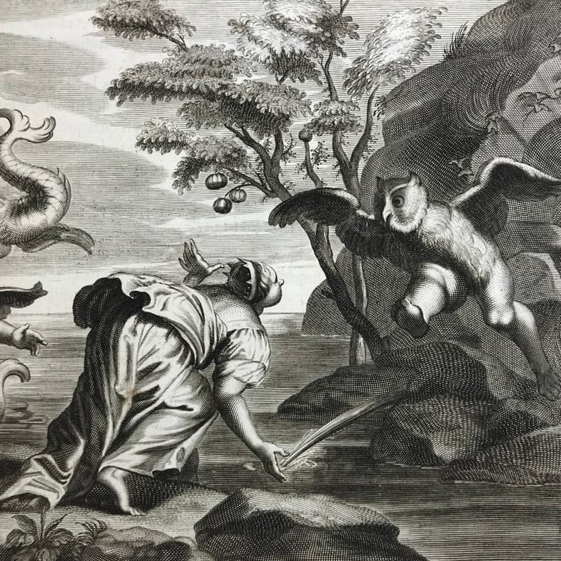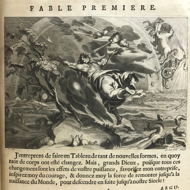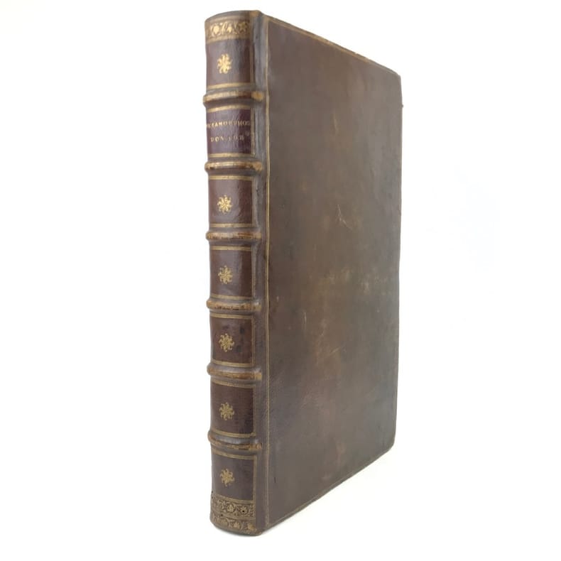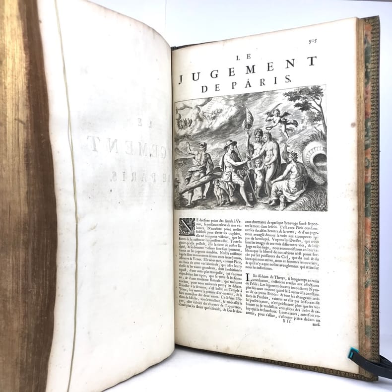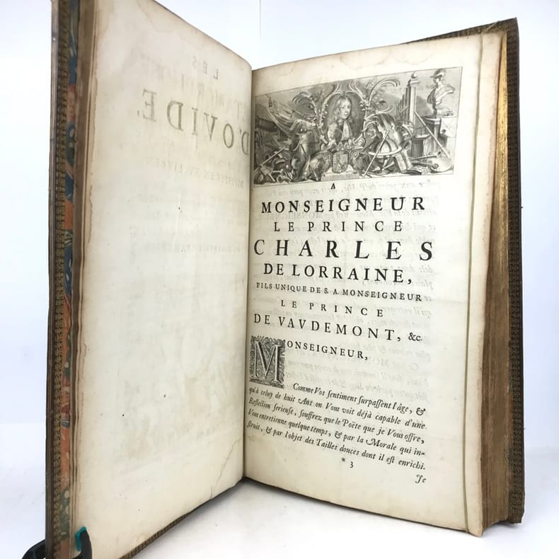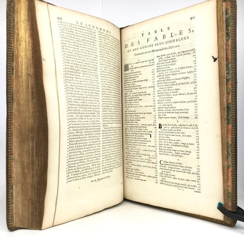 1 volume in-plano (45,5 x 27,5 cm), maroquin brun (reliure postérieure du XVIIIe siècle), dos à nerfs orné, double filet doré encadrant les plats et sur les coupes, roulette doré sur les chasses, tranches dorées, titre en rouge et noir, [16]-574 pages (complet). Coins usés, mors, plat inférieur et coupes frottés, quelques taches sur les plats, mouillures angulaires en queue des trois premiers feuillets et des deux derniers, feuillet *8 restauré (un “B” ajouté postérieurement), rousseurs. État correct.Édition richement illustrée d’une vignette sur le titre et de 124 figures dans le texte gravées par Peter Paul et Martin Bouché, Frederick Bouttat et Peter Clouwet, d’après Abraham van Diepenbeeck, Hendrick Abbé et d'autres, travaillant tous à Anvers.“C'est un des [ouvrages les] plus galamment illustrés de tout le XVIIIe siècle”. (Cohen, 769)Nous retrouvons le texte original latin des Métamorphoses d’Ovide, dont la composition débute probablement en l'an 1, face à sa traduction française, ici réalisée par Pierre Du Ryer (1605-1658), historiographe et traducteur français. Des Épîtres ont également été traduits à la fin de l’ouvrage.Plaisant exemplaire, en maroquin ancien.