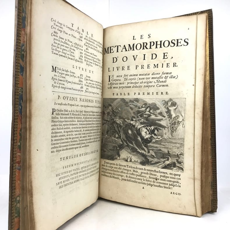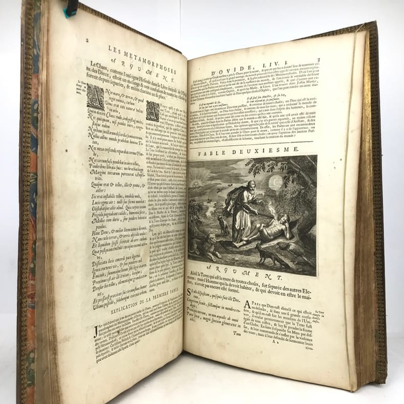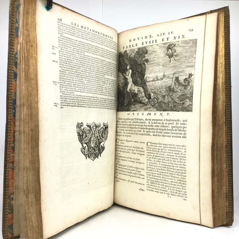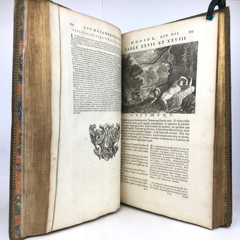 4 volumes in-4 (24,5 x 18,5 cm), veau marbré (reliure de l’époque), dos à nerfs orné, pièces de titre et de tomaison en maroquin vert, triple filet doré encadrant les plats avec fleurons en écoinçons, double filet doré sur les coupes, roulette dorée sur les chasses, tranches dorées sur marbrures, titre en rouge et noir, [4]-8-xc-[2]-264 ; viii-355-[1] ; viii-360 ; viii-367-[1] pages (complet). Frottements aux mors, quelques rousseurs éparses. État très correct.Édition richement illustrée d’un titre gravé et de 140 gravures hors-texte. Elle comprend notamment deux planches de dédicace gravées, en tête du tome I, ainsi que la traduction français en regard du texte en latin.“C'est un des [ouvrages les] plus galamment illustrés de tout le XVIIIe siècle”. (Cohen, 769)Nouvelle traduction des Métamorphoses d’Ovide, dont la composition débute probablement en l'an 1. Elle est ici réalisée par Antoine Banier (1673-1741), homme d’Église et de Lettres.Plaisant exemplaire. État très correct