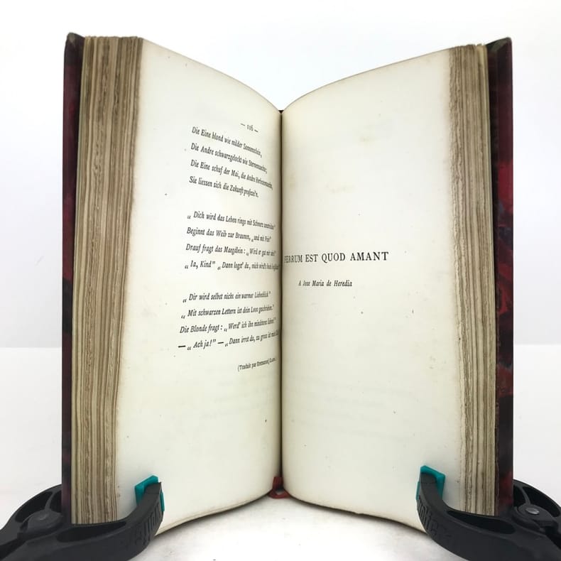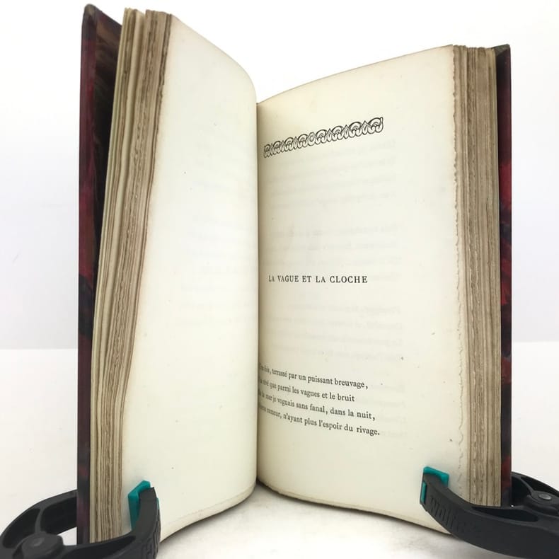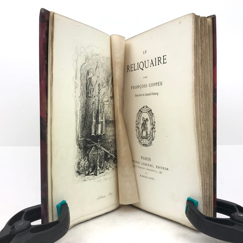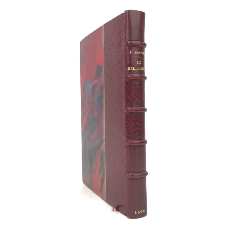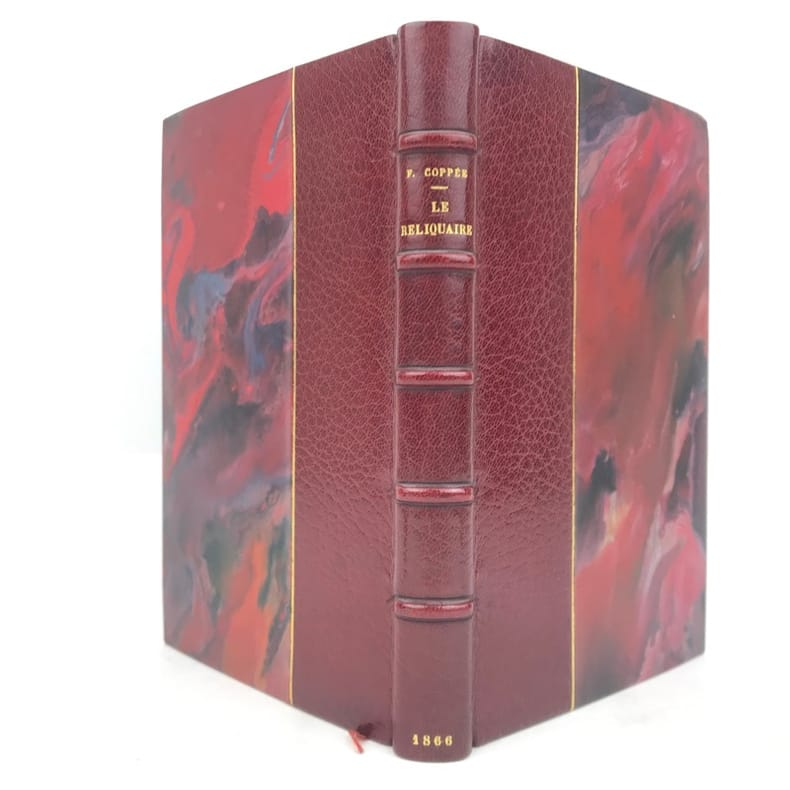 1 volume in-12 (18 cm x 11 cm), demi-maroquin bordeaux (reliure signée AD. Lavaux), dos à nerfs, tête dorée, couverture et dos conservés. [4]-171-[5] pages (complet). Feuillets piqués et cornés. État très correct. ÉDITION ORIGINALE illustrée d’un frontispice. François Édouard Joachim Coppée, (1842-1908), est un poète, dramaturge et romancier français. Coppée fut le poète populaire et sentimental de Paris et de ses faubourgs, des tableaux de rue intimistes. Ses premiers vers furent édités en 1866 sous la forme d’un recueil Le Reliquaire, suivi en 1867 par Intimités et Poèmes modernes (1867-1869). Le Reliquaire, l’avait placé au sein du mouvement poétique du Parnasse. Mais dès ses Intimités, il s’en était détourné pour se tourner vers une poésie du quotidien, utilisant des mots de tous les jours, mais dans une prosodie classique, sans échapper au prosaïsme et au conformisme. Bel exemplaire.