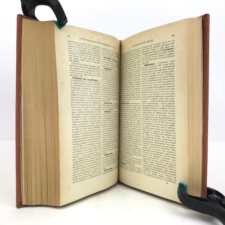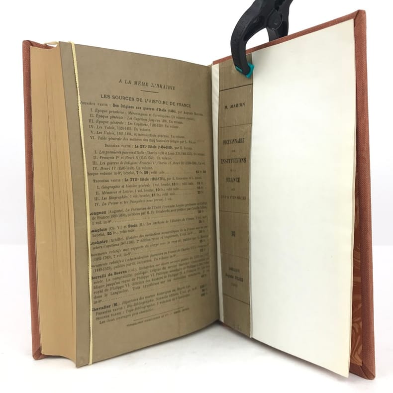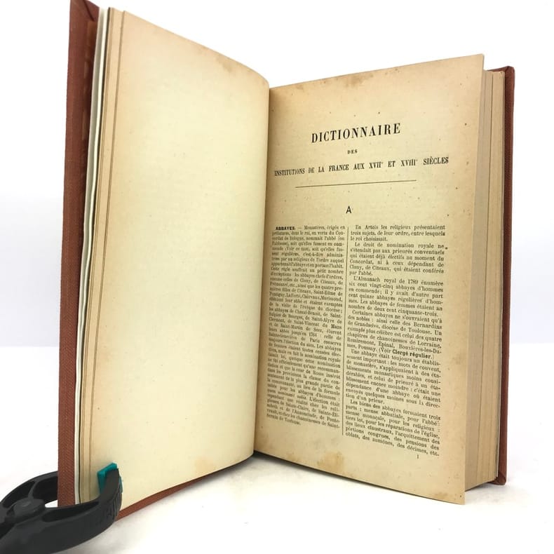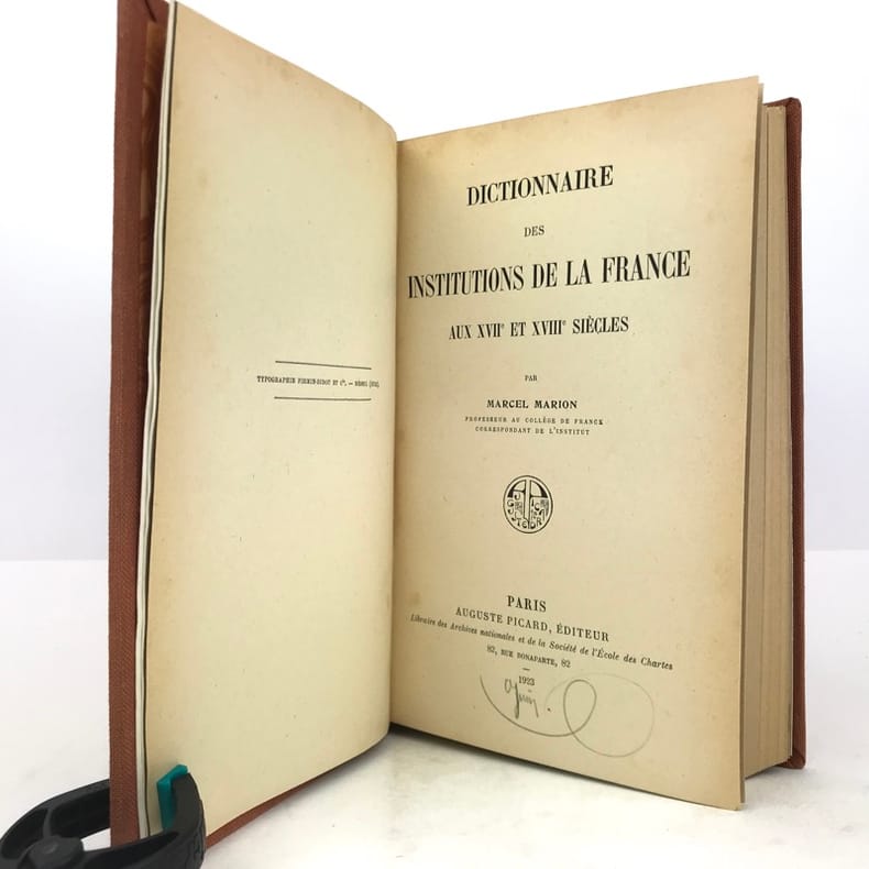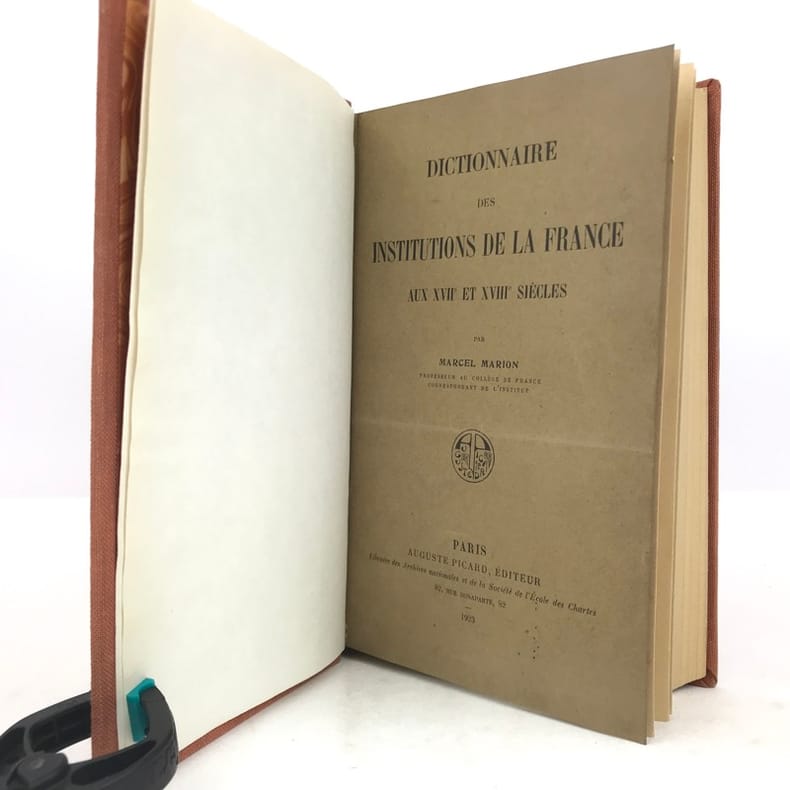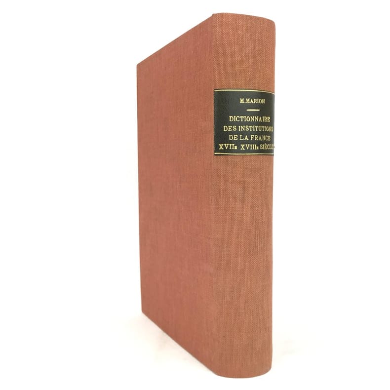 1 volume in-8 (22 cm x 13,5 cm), toile orange, pièce de titre brune, couverture conservée. ix-1 bl.-564 pages (complet). Feuillets légèrement jaunis. Bon état. ÉDITION ORIGINALE. Ce dictionnaire, comprenant 1.109 articles, est devenu un classique sur les institutions administratives, politiques, religieuses et judiciaires de l'Ancien Régime. Écrit par Noël-François-Marcel Marion, (1857-1940), historien français, spécialiste de l'histoire économique et financière de la France, chaque article est le fruit d’une recherche approfondie. Agréable exemplaire.