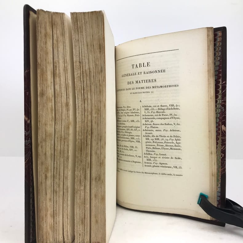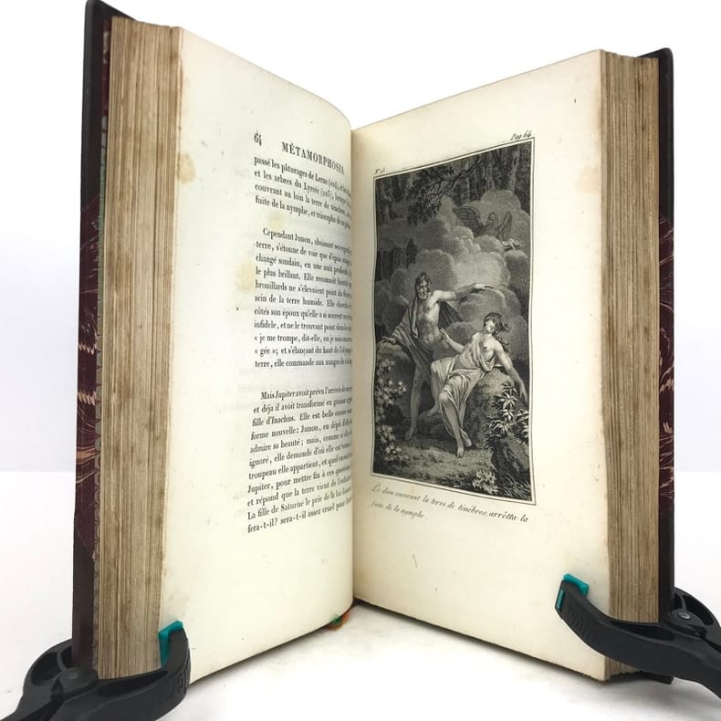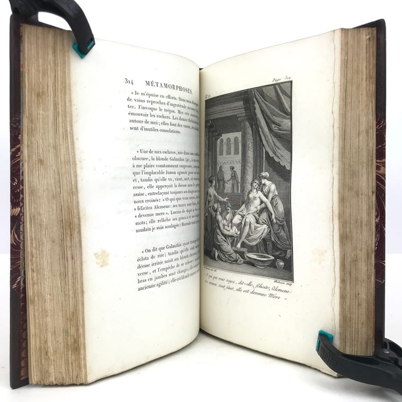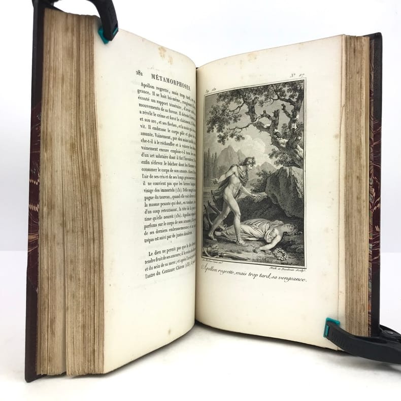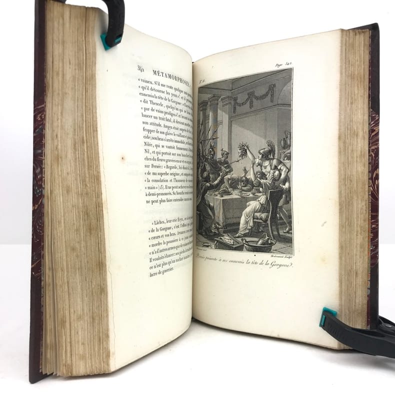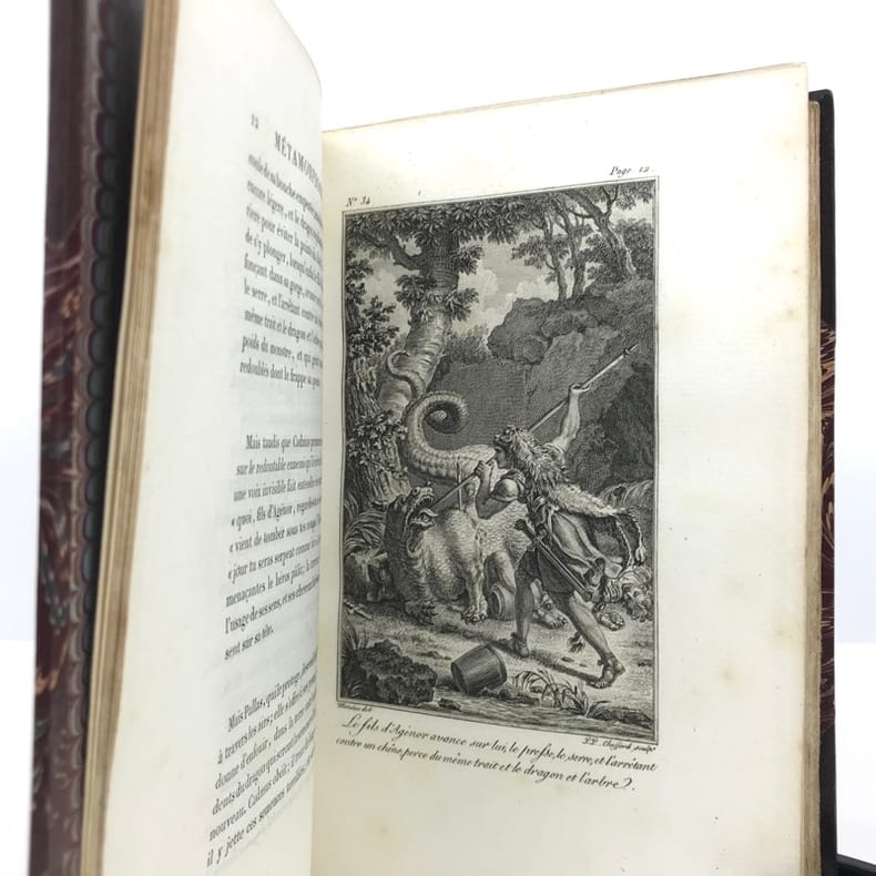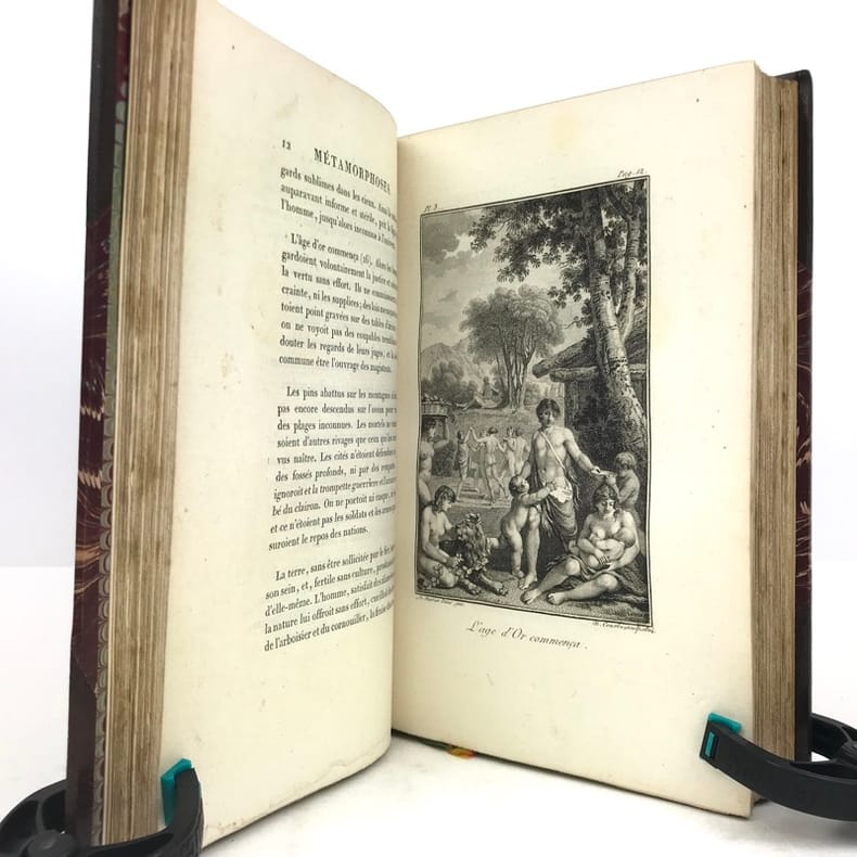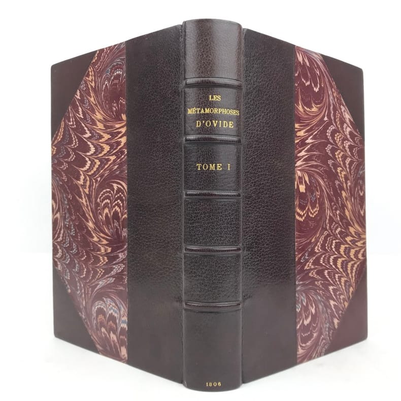 4 volumes in-4 (23 cm x 14 cm), demi-maroquin bordeaux à coins (reliure signée Pagnant), dos à nerfs, tête dorée, ex-libris contrecollé sur le contreplat. ciii-464 ; [4]-582 ; 626 ; 558 pages. Manque 2 gravures. Rousseurs éparses, petites mouillures, petites déchirures marginales. Bon état.Édition richement illustrée d’un frontispice et de 141 gravures hors-texte, d’après les dessins de Lebarbier, Monsiau et Moreau.Nouvelle traduction des Métamorphoses d’Ovide, dont la composition débute probablement en l'an 1. Elle est ici suivie d'une analyse de l'explication des fables, de notes géographiques, historiques, mythologiques, et critiques, par M. G. T. Villenave.Plaisant exemplaire.