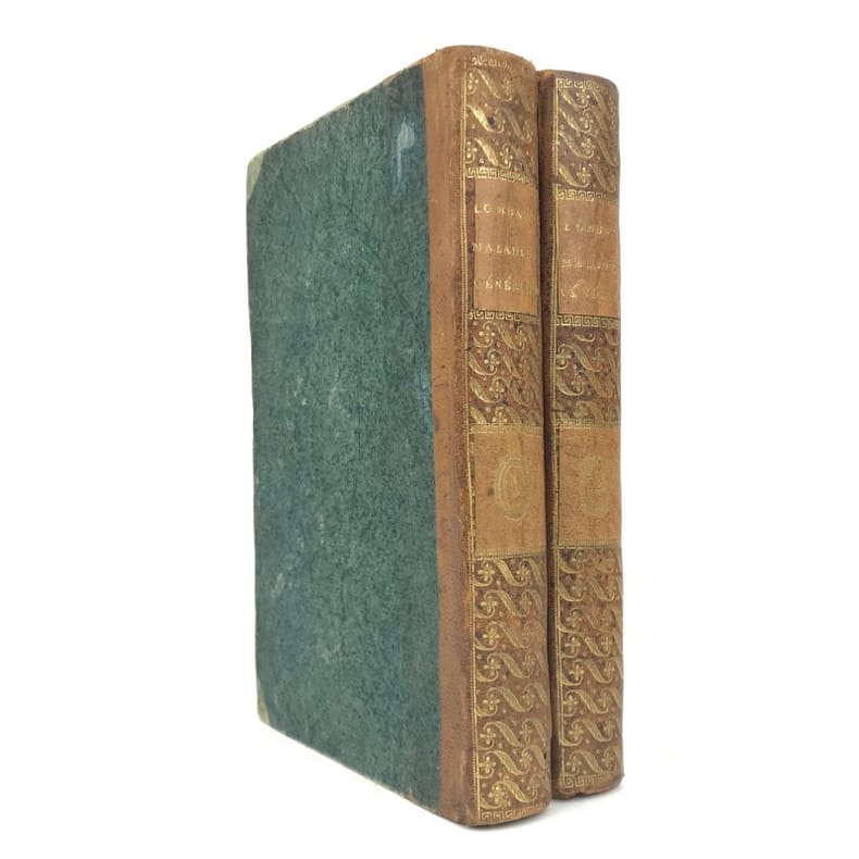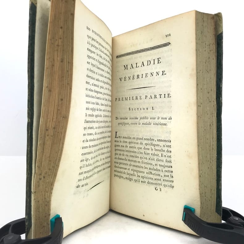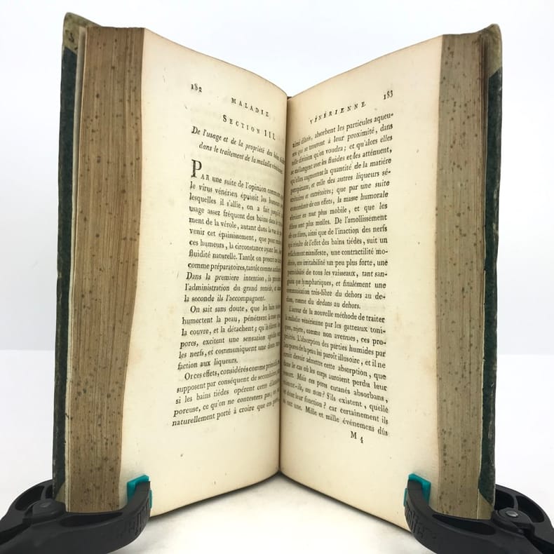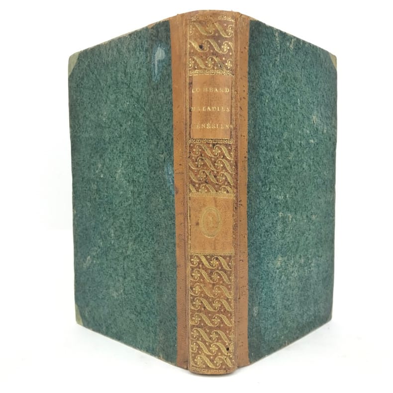 2 volumes in-8 (20 x 12 cm), demi-basane havane à petits coins de vélin blanc (reliure de l’époque), dos lisses ornés en long d’un décor doré à la grotesque, pièce de titre et de tomaison. viii-358 ; 394 pages (complet). Légers frottements aux dos et sur les plats avec petit accident à une coiffe, quelques rousseurs ou salissures éparses, galeries marginales. État très correct. ÉDITION ORIGINALE de ce texte sur la maladie vénérienne, symptômes, traitements… Claude Antoine Lombard (1741-1811), maître en chirurgie de la ville de Dôle, département du Jura, chirurgien major en chef de l'hôpital militaire et auxiliaire de Strasbourg, ancien chirurgien major employé en cette qualité à l'armée des côtes, membre de plusieurs académies. Bon exemplaire.