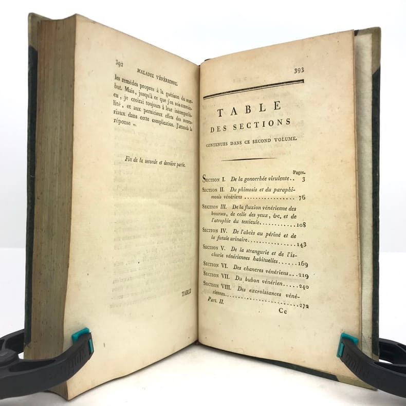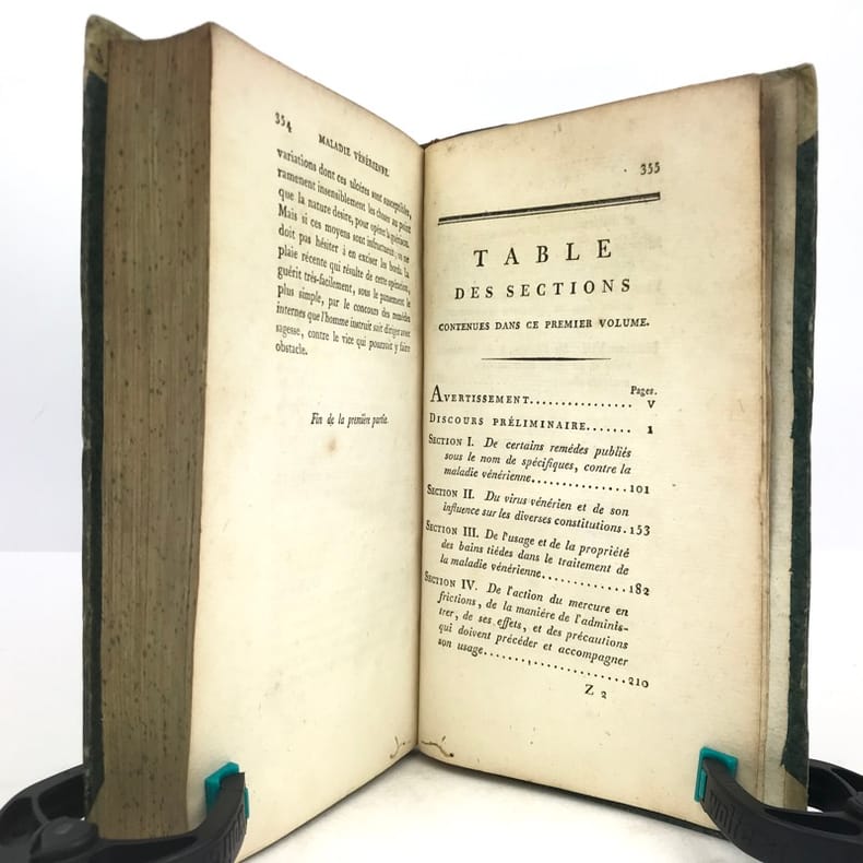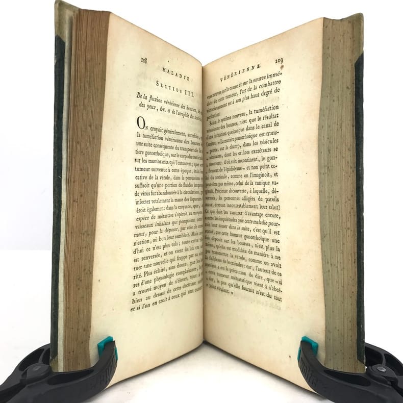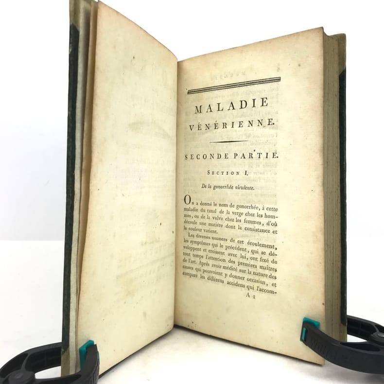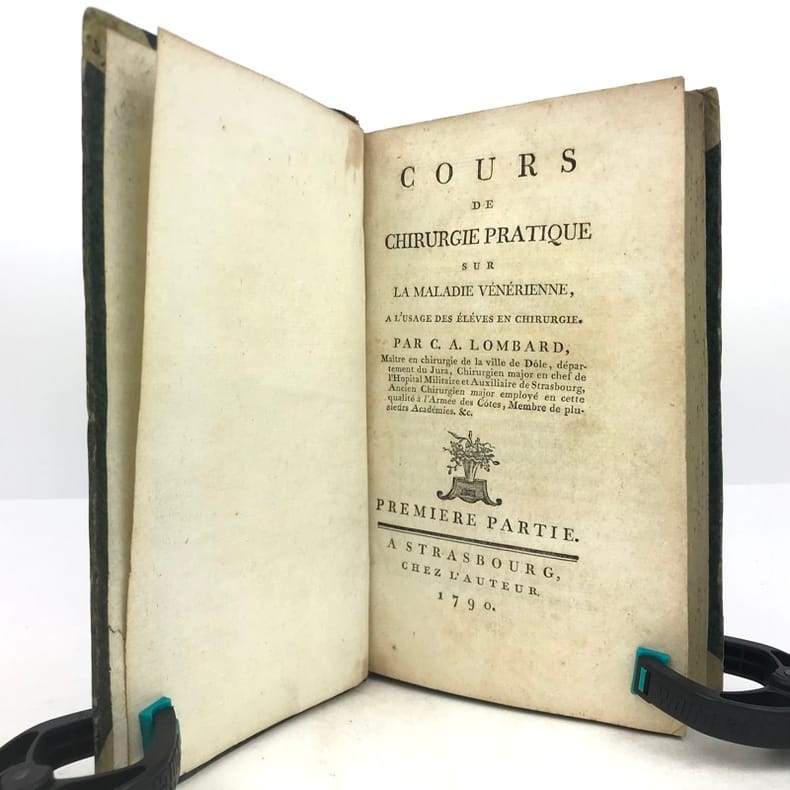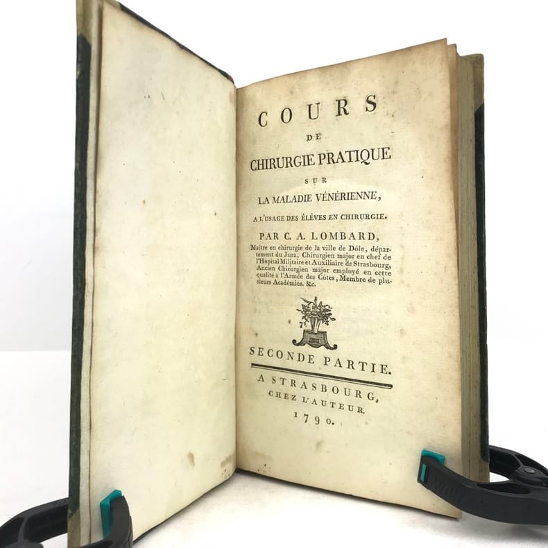 Lombard, Claude Antoine (1741-1811) etait un chirurgien français de l'hôpital militaire de Strasbourg. Il a fait partie de l'Institut national, membre associé non résidant de la classe des Sciences (section de Médecine et Chirurgie), 1796-1803 ; membre correspondant de la classe des Sciences, 1803-1811. Il a écrit de nombreux ouvrages de chirurgie, encore recherchés aujourd'hui. Volume complet en deux parties: I. de certains remèdes contre la maladie vénérienne - du virus vénérien et de son influence sur les différences constitutions - de l'usage et de la propriété des bains tièdes - de l'action du mercure en friction, de la manière, de ses effets et des précautions - de la salivation mercurielle et des moyens de la combattre - du régime applicable à la guérison de la maladie vénérienne - des injections et de leur utilité dans les affections vénériennes de l’urètre - de l'influence du mouvement et du repos dans la cure de la maladie. II. de la Gonorrhée virulente - du phimosis et du paraphimosis vénérien - de la fluxion vénérienne des bourses, des yeux & de l'atrophie du testicule - de l'abcsé au périné et la fiscule urinaire - de la strangurie et de l'ischurgie - des chancres - du bubon - des excroissances vénériennes - des taches, des pustules et des ulcères - de l'exostose, de la carie & de l'anchylose vénériennes - de la vérole, du vice scropuhuleux ou dartreux ou scorbutique. 2 Tomes en un fort volume gd in8, 200x130, relié pleine basane époque, très bel état intérieur, 358, 394pp. Complet. Rare Strasbourg, chez l'auteur, 1790 ref/22