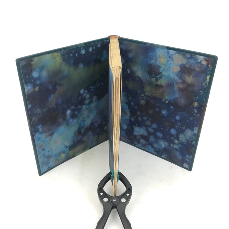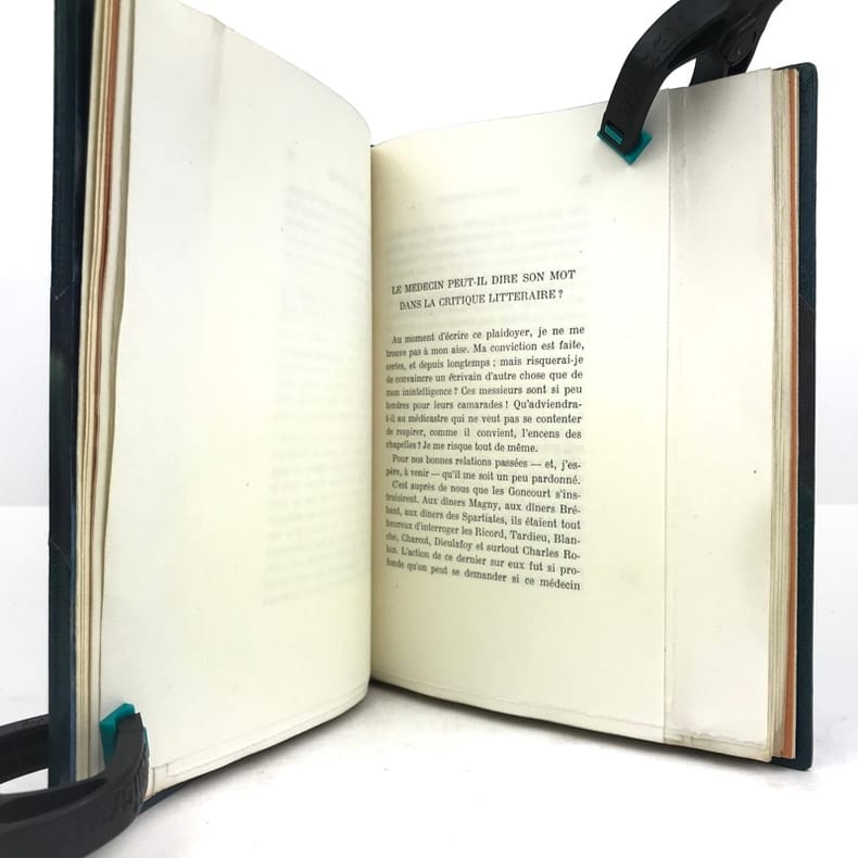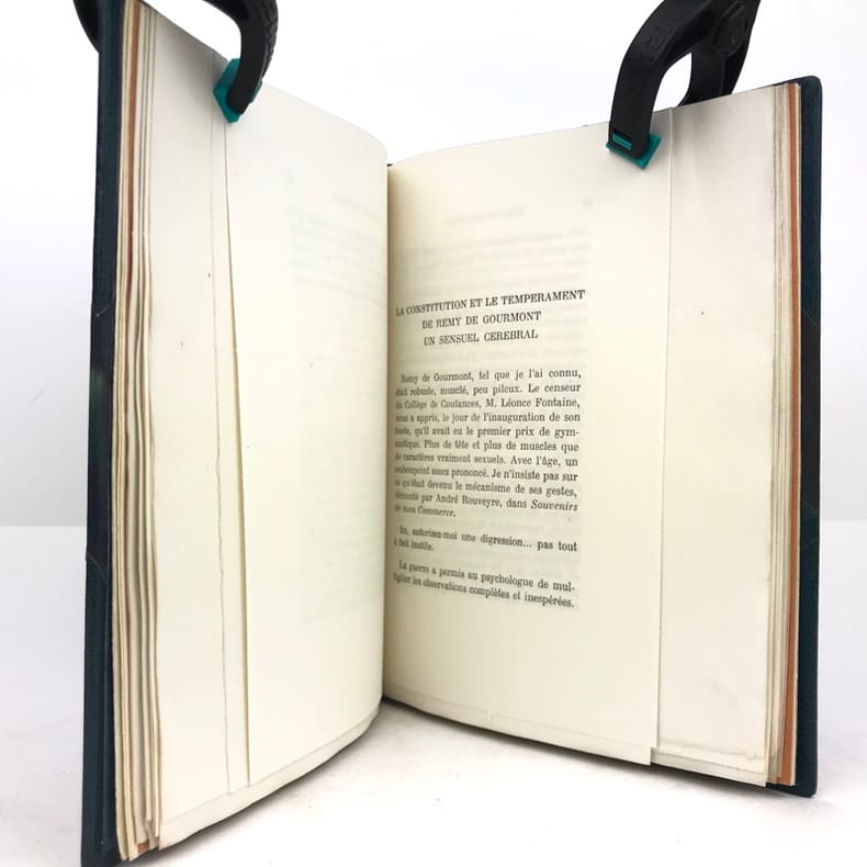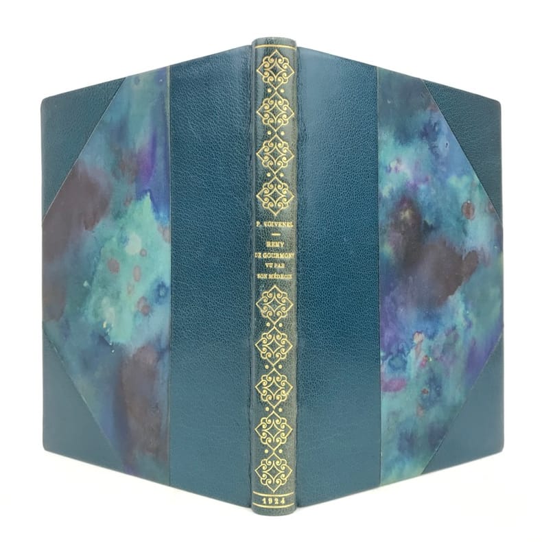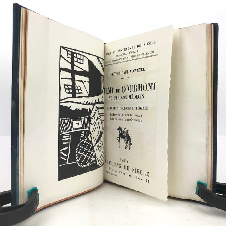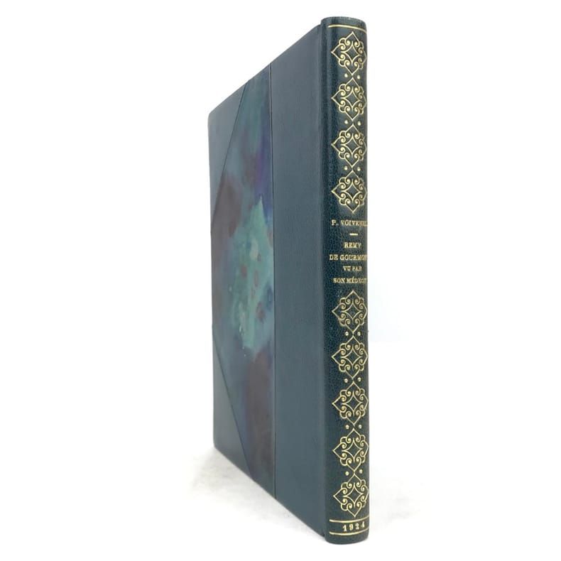 1 volume petit in-8, grand de marges (19 x 14,5 cm), demi-maroquin turquoise à coins (reliure de l’époque, signée J. Van West), dos joliment orné en long d’un fleuron doré répété, tête dorée, couverture et dos conservés. 138-[6] pages (complet). Dos insolé. Petite décoloration marginale aux premiers et derniers feuillets sans atteinte au texte. Bon état. ÉDITION ORIGINALE de ce texte préfacé par Jean de Gourmont; illustrée par Suzanne de Gourmont de 3 gravures sur bois à pleine page, dont une en Frontispice. Tirage à 85 exemplaires sur grand papier, celui-ci 1/75 sur vergé à la forme des papeteries d’Arches, second papier après 10 sur Hollande, (n°37). Paul Louis Joseph Marie Voivenel (1880-1975), neuropsychiatre, conférencier, écrivain et journaliste de la première moitié du xxe siècle. Après des études secondaires à Tarbes et avoir « fait sa médecine » à Toulouse, il devient chef de clinique puis médecin libéral (neuropsychiatrie) à Toulouse. Après sa thèse, il a été introduit dans les milieux culturels parisiens par Rémy de Gourmont et collabore au Mercure de France. Bon exemplaire.
