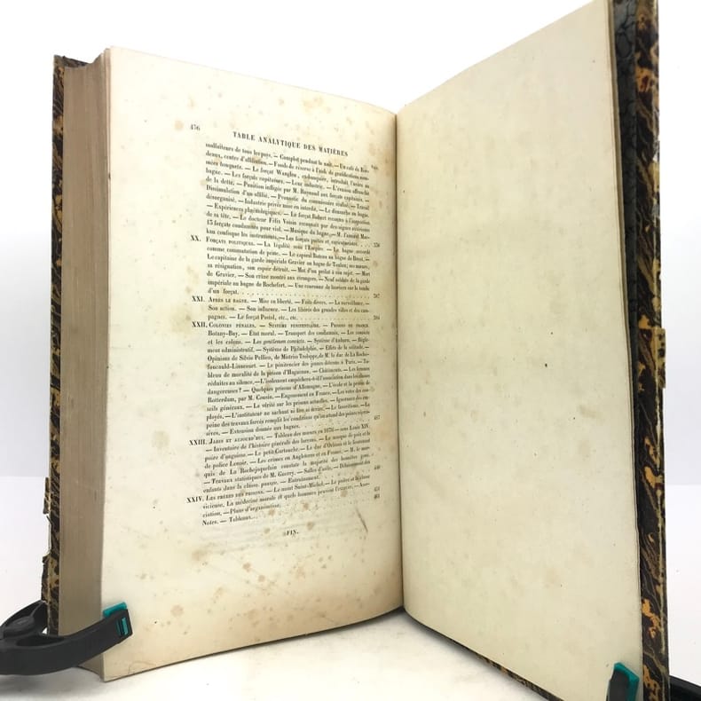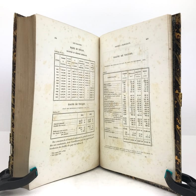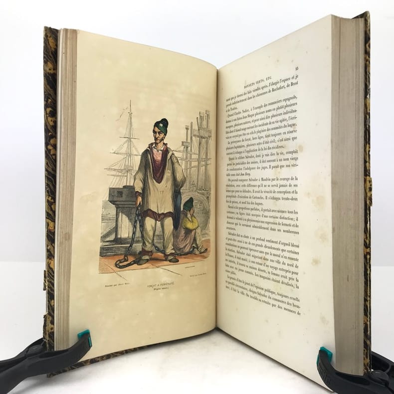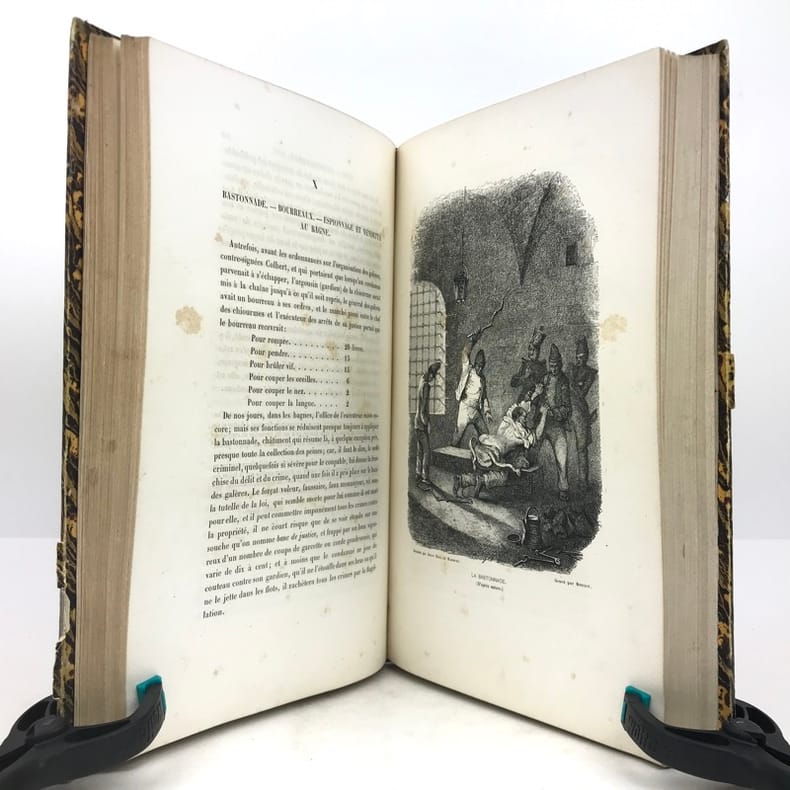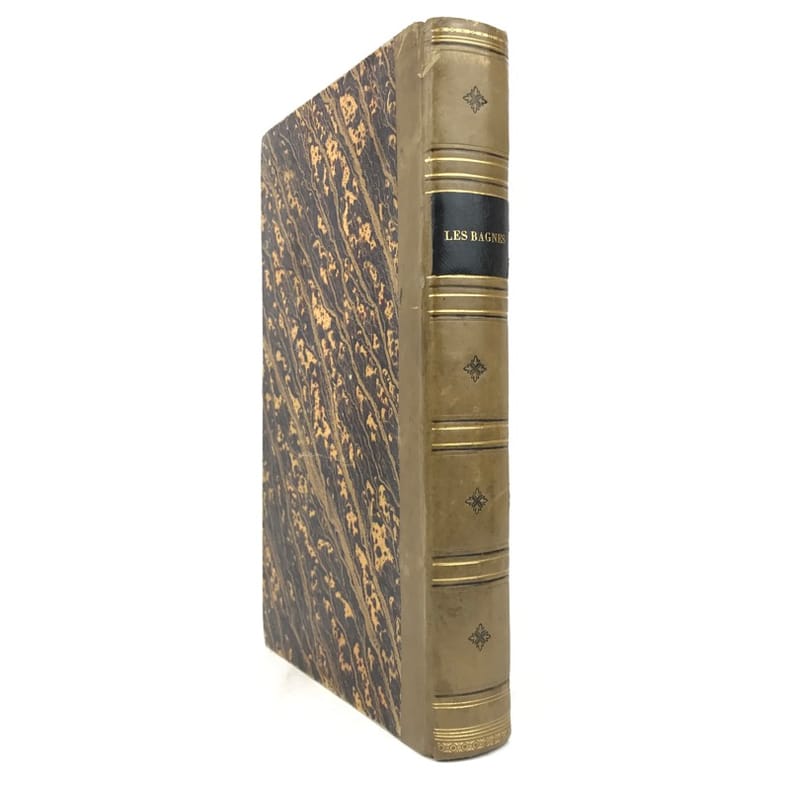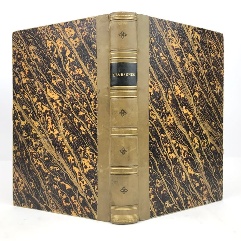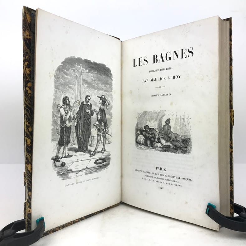 1 volume in-4 (26,5 x 17 cm), demi veau glacé (reliure de l’époque), dos lisse orné et avec motifs à froid, tranches mouchetées, [4]-iv-476 pages. Pages 469 à 472 manquantes, quelques légers frottements sur la reliure, rousseurs éparses. État correct tout de même. ÉDITION ORIGINALE, illustrée d’un frontispice et de 29 gravures hors-texte, dont 4 en couleurs. Philadelphe-Maurice Alhoy (1802-1856) est un journaliste, écrivain humoristique et auteur dramatique français. Il publie ici un roman inspiré pour son propre travail de journaliste, et résultant d’années d’enquêtes et de recherches sur le bagne, établissement pénitentiaire, souvent construit dans une colonie, où les détenus sont chargés de divers travaux forcés. Il y développe le voyage des “bagnards”, et leurs conditions de vie une fois arrivés sur place. Bon exemplaire.