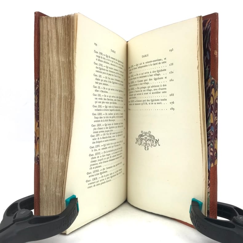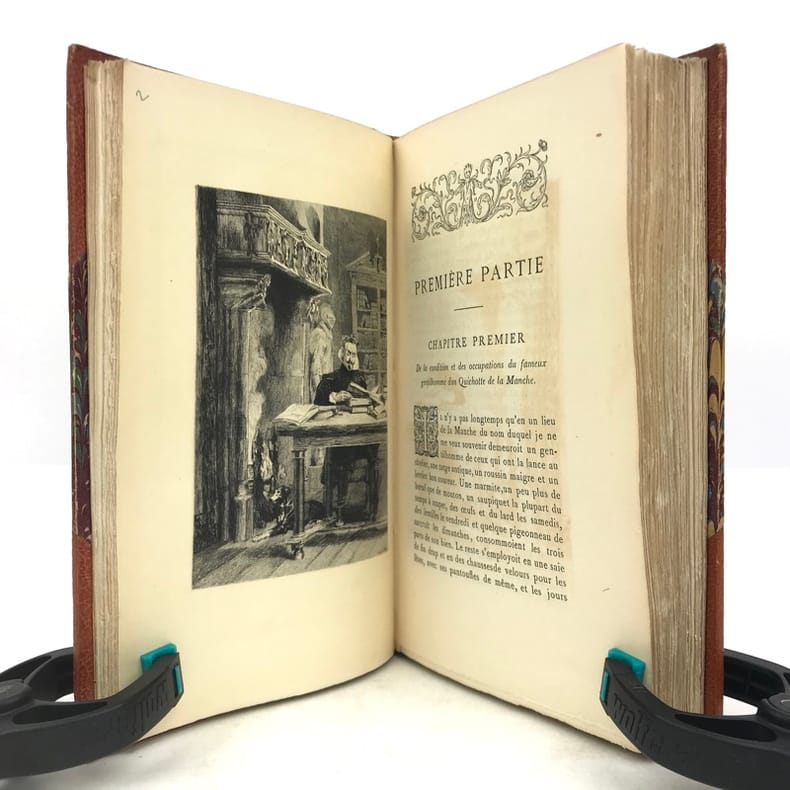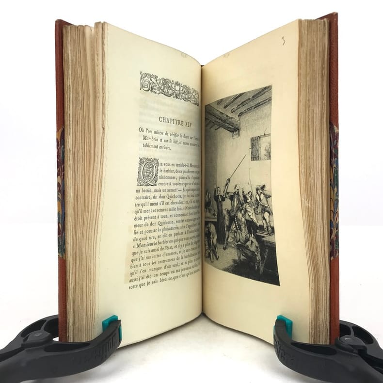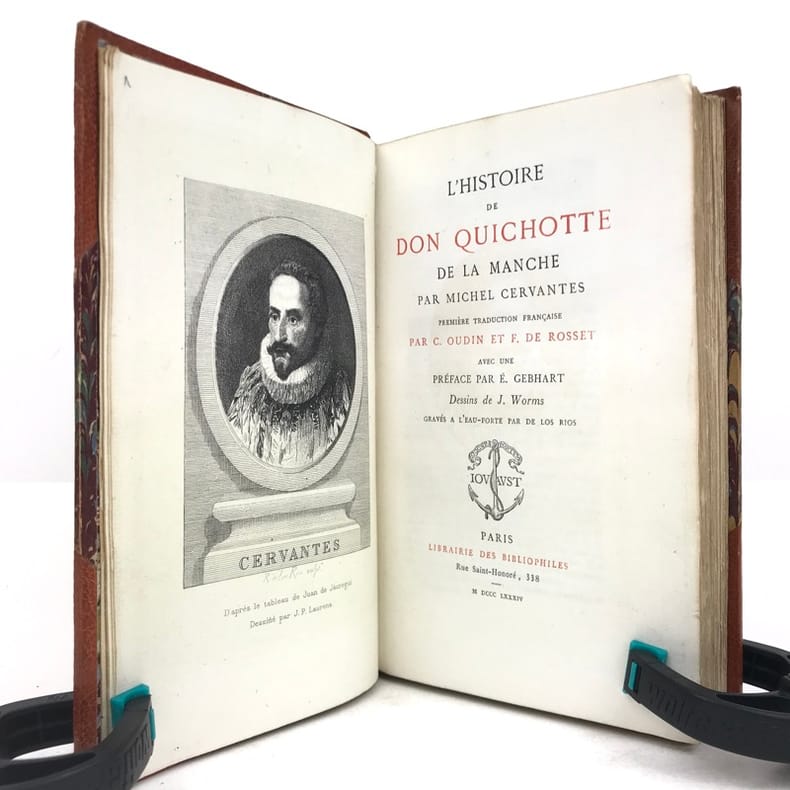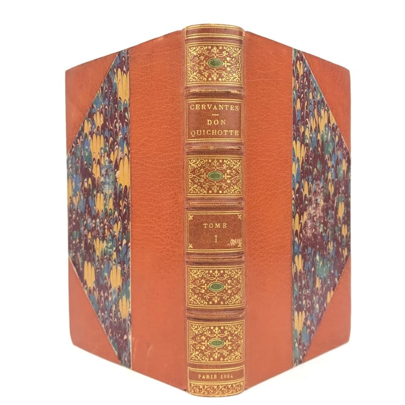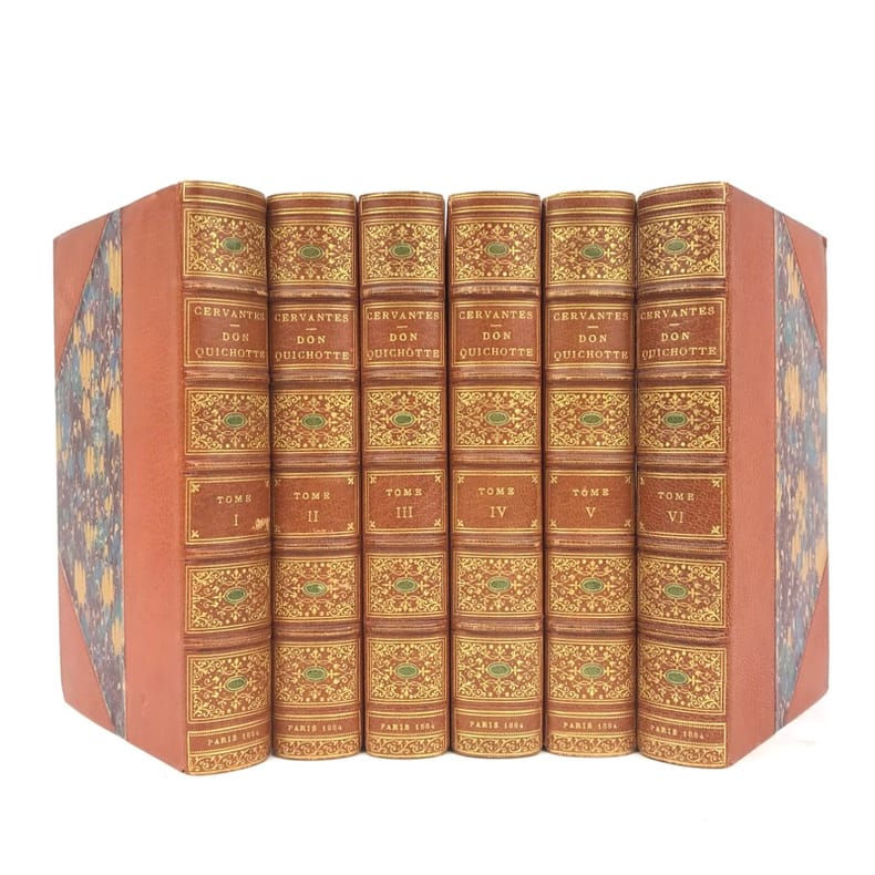 6 volumes in-12 (17,5 x 11 cm), demi maroquin orange à coins (reliure de l’époque), couverture conservée, dos à nerfs joliment orné avec motifs mosaïqués, filet à froid en bordure, tranche de tête dorée, titre en rouge et noir, [4]-xxvi-[2]-265-[3] ; [4]-298-[2] ; [4]-280 ; [4]-315-[1] ; [4]-307-[1] ; [4]-295-[1] pages (complet). Quelques feuillets brunis, rousseurs éparses. État très correct. Nouvelle édition, illustrée d’un portrait de l’auteur en frontispice et de 33 gravures hors-texte, réalisées par J. Worms et gravées à l'eau-forte par de Los Rios. Miguel de Cervantes (1547-1616) est un romancier, poète et dramaturge espagnol. Il est l'auteur d'un des romans médiévaux les plus célèbres, L’Ingénieux Hidalgo Don Quichotte de la Manche, véritable parodie des mœurs de l'époque et de l'idéal de chevalerie. La traduction française, ici éditée, fut réalisée au XVIe siècle par César Oudin (ca.1560-1625) et François de Rosset (1571-1619). Plaisant exemplaire.