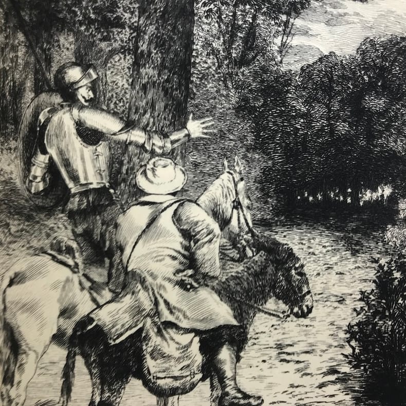 Paris : Didier, 1846 - Un volume in-8 (16x24,8cm) pleine percaline, dos lisse orné de rocailles réhaussées, titre et auteur, le tout doré, et plats orné de plaques en or réhaussées en couleurs, sur le premier plat : plaque dorée (Sancho Panza et Don Quichotte en conversation), encadrée d'une guirlande florale coloriée. tranches dorées (reliure de l'éditeur), XXIV-635 pages avec 12 lithographies en bistre par le peintre et lithographe Ange-Louis Janet, sous serpentes, et en noir dans le texte lettrines, culs-de-lampe, bandeaux - rousseurs marquées, trois tampons de bibliothèque : deux en page de titre ("fonds Gaëtan Sanvoisin") et une en dernière garde. Belle reliure romantique à la plaque, bien conservée -
