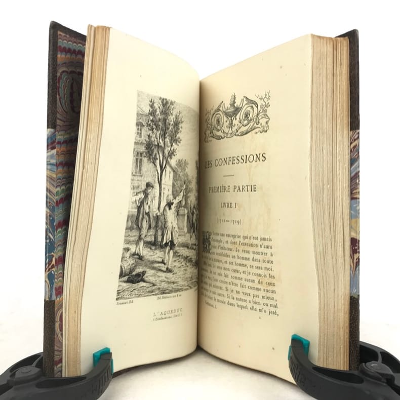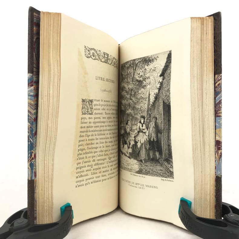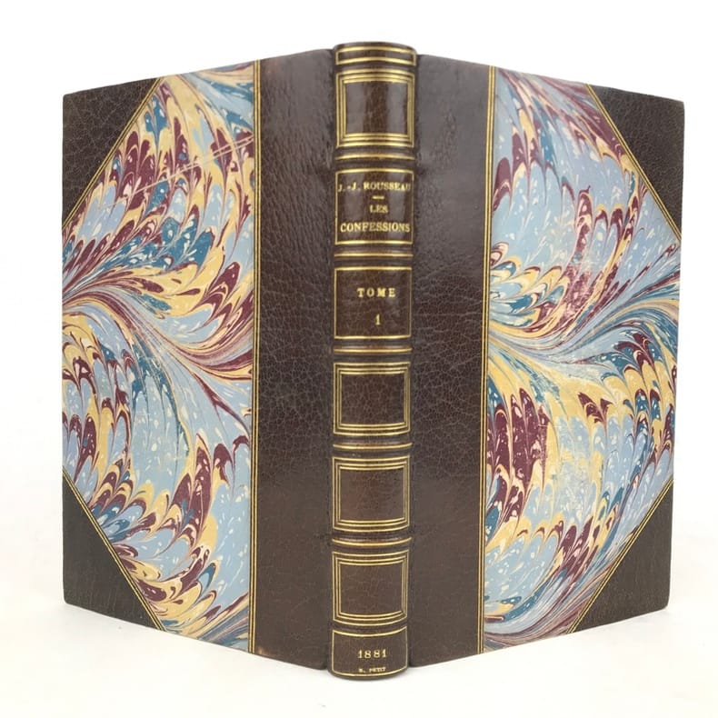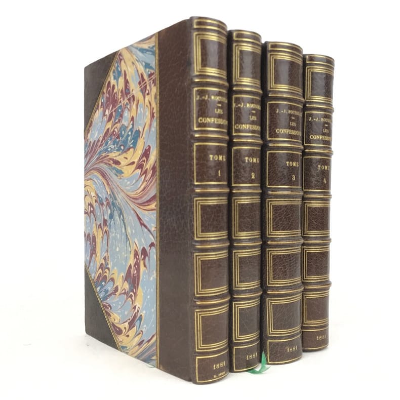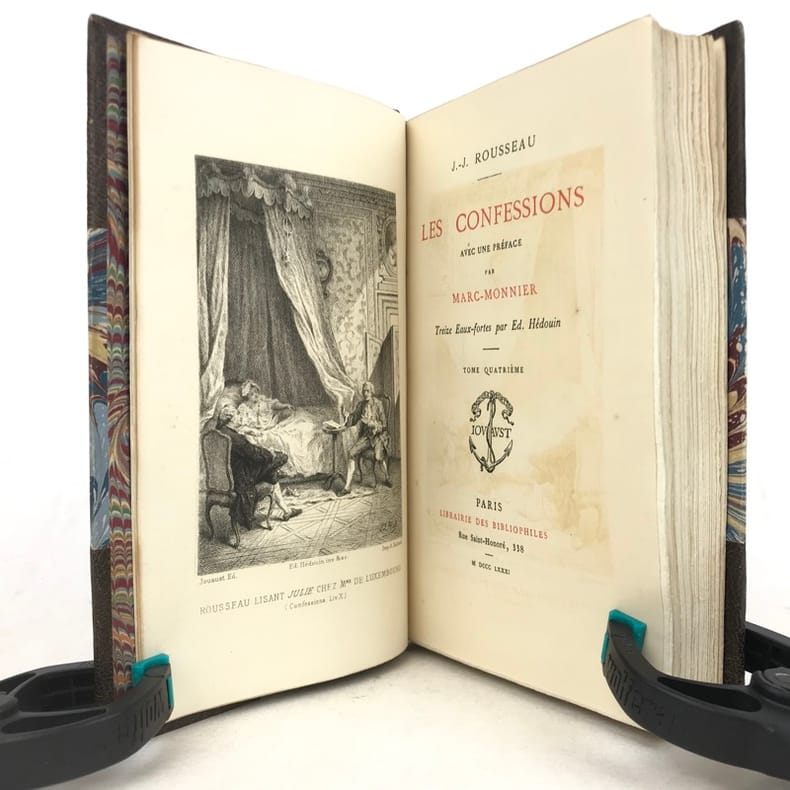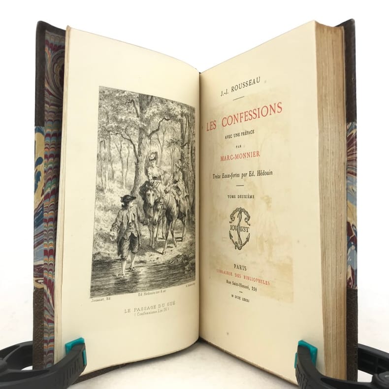 4 volumes in-12 (17,5 x 11 cm), demi-maroquin chocolat à coins (reliure de l’époque, signée R. Petit), dos à nerfs ornés de filets dorés, têtes dorées, [4]-xxxviii-[2]-207-[1]-4pl. ; [4]-231-[1]-3pl. ; [4]-346-[2]-3pl. ; [4]-273-[3]-3pl. pages (complet). Malgré quelques petites décolorations des gravures en regard, l’exemplaire est en très bon état. Édition illustrée de 13 eaux-fortes hors texte de Hédouin, dont un portrait frontispice de l’auteur d’après un pastel de Latour. Elle renferme une préface par Marc Monnier. Dans Les Confessions de Jean-Jacques Rousseau (1712-1778), rédigées entre 1765 et 1770, avec publication posthume en 1782 et 1789; et dans Les Rêveries du promeneur solitaire (écrites en 1776-1778, publiées en 1782), Rousseau se livre à une observation approfondie de ses sentiments intimes. L'élégance de l'écriture de Rousseau provoque une transformation significative de la poésie et de la prose françaises en les libérant des normes rigides venues du Grand Siècle. Agréable exemplaire sur papier Hollande van Gelder avec son filigrane, ici non numéroté.