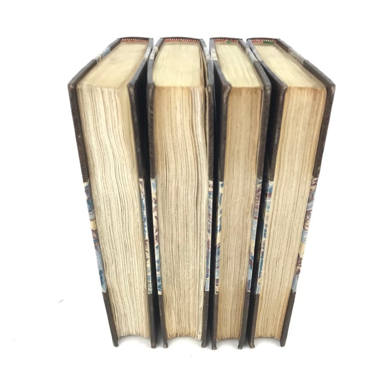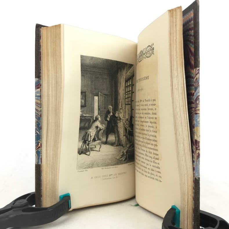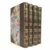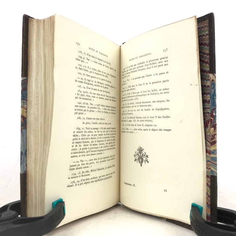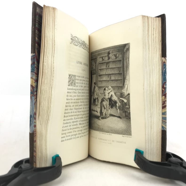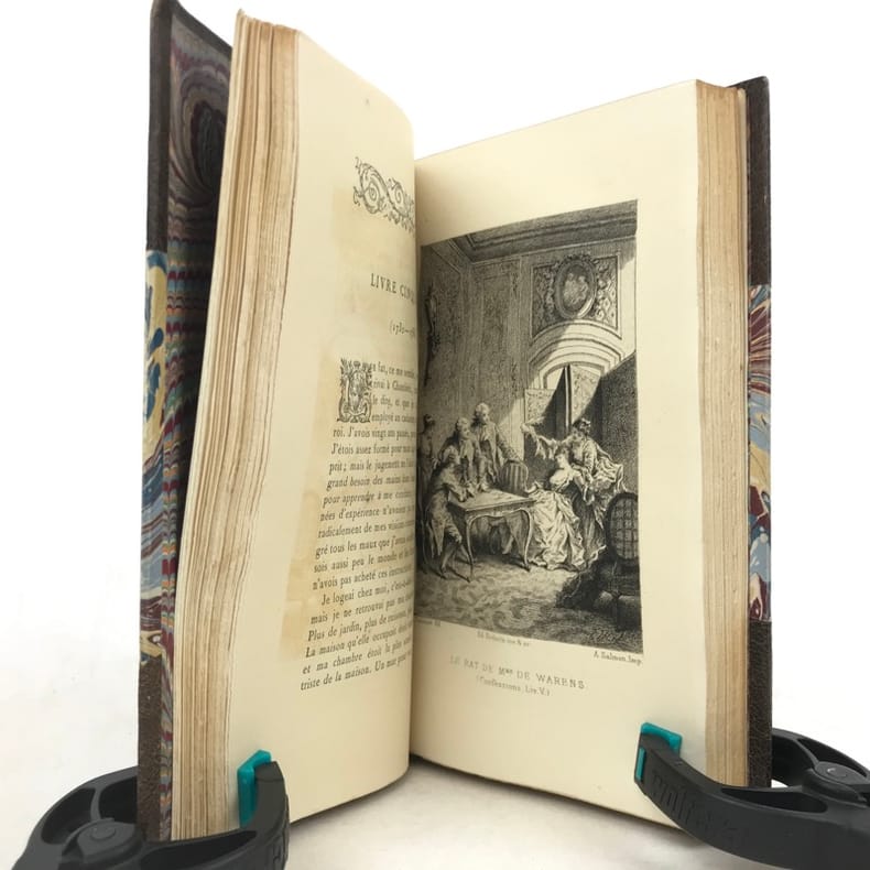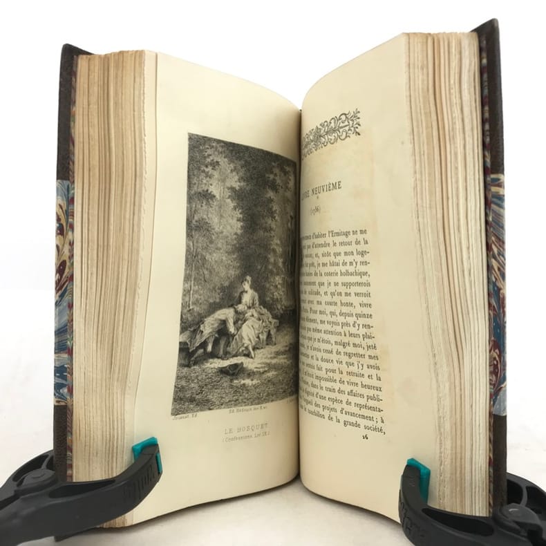 4 volumes in-12 (17,5 x 11 cm), demi-maroquin chocolat à coins (reliure de l’époque, signée R. Petit), dos à nerfs ornés de filets dorés, têtes dorées, [4]-xxxviii-[2]-207-[1]-4pl. ; [4]-231-[1]-3pl. ; [4]-346-[2]-3pl. ; [4]-273-[3]-3pl. pages (complet). Malgré quelques petites décolorations des gravures en regard, l’exemplaire est en très bon état. Édition illustrée de 13 eaux-fortes hors texte de Hédouin, dont un portrait frontispice de l’auteur d’après un pastel de Latour. Elle renferme une préface par Marc Monnier. Dans Les Confessions de Jean-Jacques Rousseau (1712-1778), rédigées entre 1765 et 1770, avec publication posthume en 1782 et 1789; et dans Les Rêveries du promeneur solitaire (écrites en 1776-1778, publiées en 1782), Rousseau se livre à une observation approfondie de ses sentiments intimes. L'élégance de l'écriture de Rousseau provoque une transformation significative de la poésie et de la prose françaises en les libérant des normes rigides venues du Grand Siècle. Agréable exemplaire sur papier Hollande van Gelder avec son filigrane, ici non numéroté.