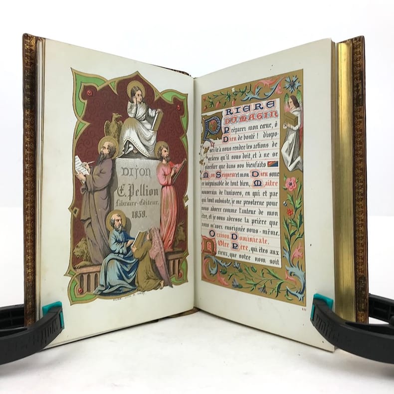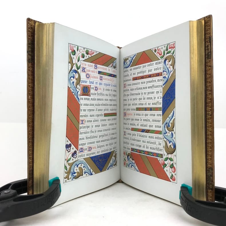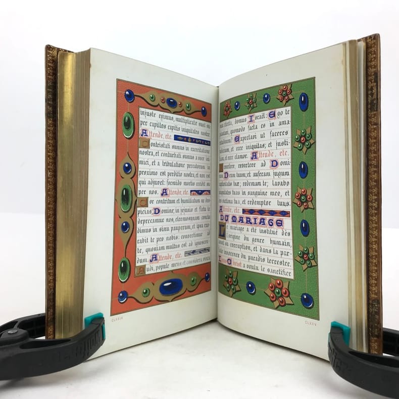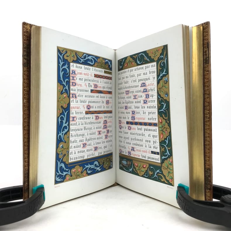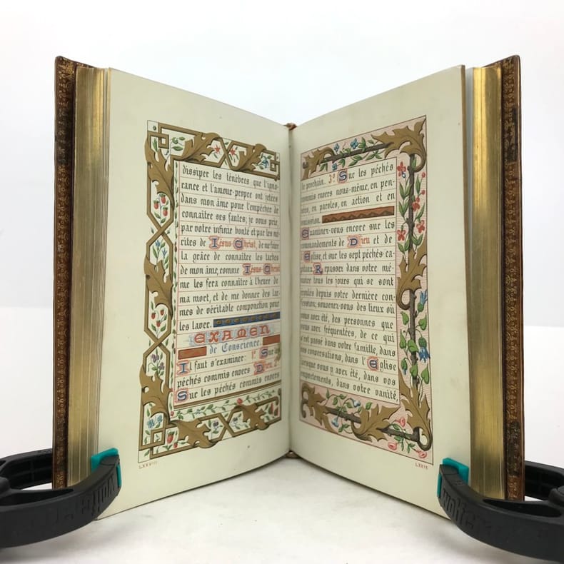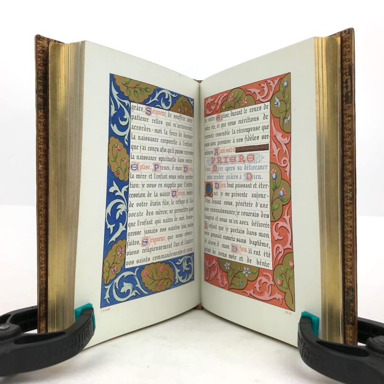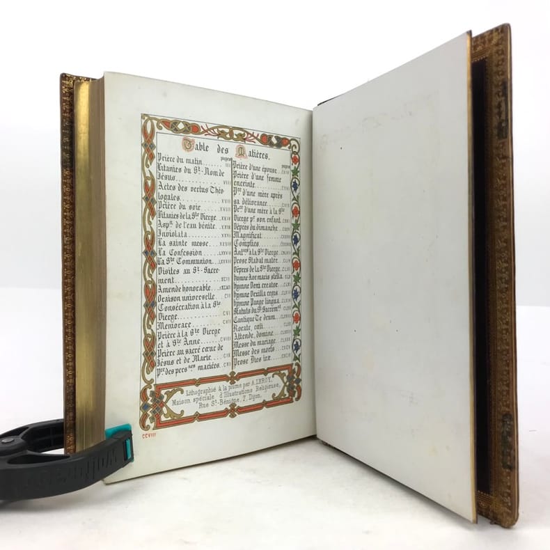 Seconde édition. Ouvrage entièrement monté sur onglets. Riche calligraphie religieuse entièrement chromolithographiée à la plume par A. Leroy, maison spéciale d'illustrations religieuse à Dijon, dans le style des manuscrits à peintures du XIV et XVème siècles. Très bel exemplaire.