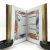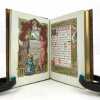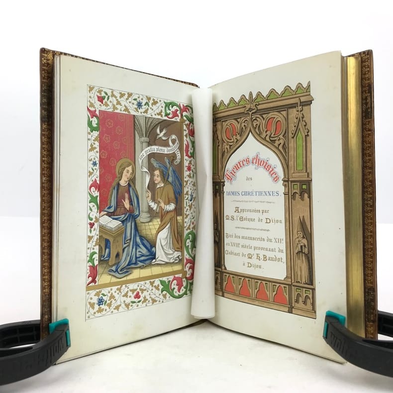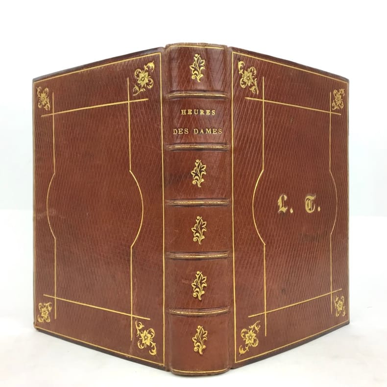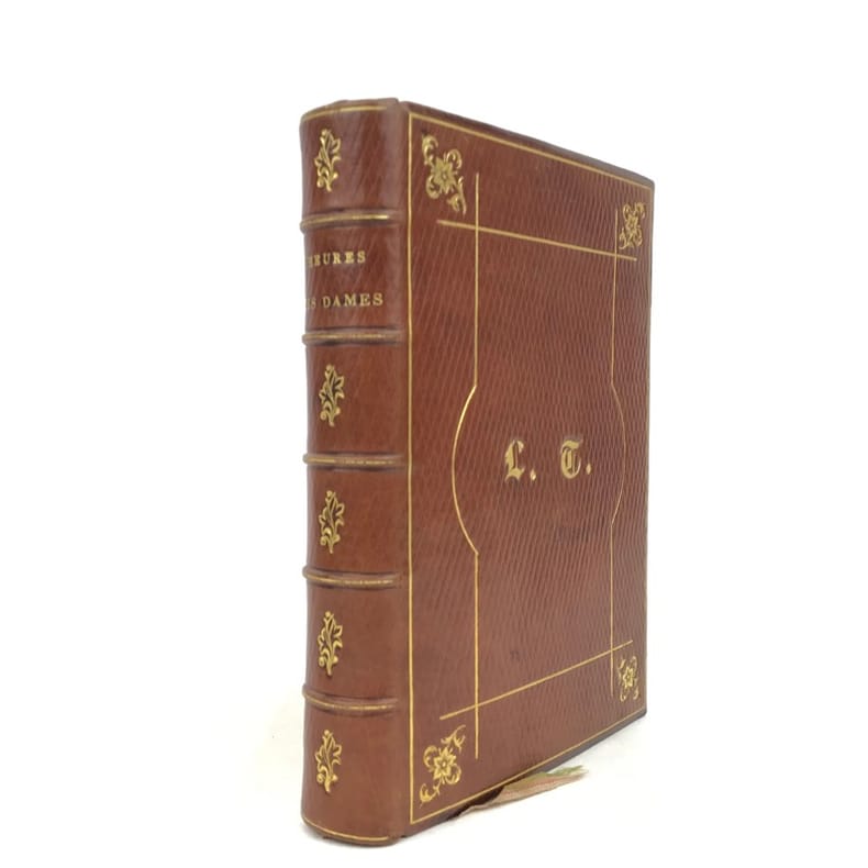 1 volume in-16 (15,5 x 11 cm), veau fauve gaufré (reliure de l’époque), dos à nerfs orné, motifs dorés en écoinçons sur les plats, filet doré sur les coupes, dentelle dorée sur les chasses, gardes de moire aubergine, toutes tranches dorées, texte encadré, ccviii pages (complet). Légers frottements aux coins et coupes. État très correct. Exemplaire ayant appartenu à Madame Augustin Tardif, avec sa signature manuscrite datée du 24 juillet 1876, et son monogramme doré sur le plat supérieur. SUPERBE ILLUSTRATION composée d’un frontispice, d’une page de titre, de trois pages illustrées hors-texte, et de rinceaux dorés et colorés encadrant chaque page de texte, le tout réalisé en lithographie à la plume par A. Leroy, au sein d’une maison spéciale d’illustrations religieuse, située à Dijon. Ce livre d’Heures, destiné précisément aux femmes, est mis en page à partir des manuscrits du XIIe au XVIIe siècle, provenant du cabinet de Mr. H. Baudot, à Dijon. BEL EXEMPLAIRE.