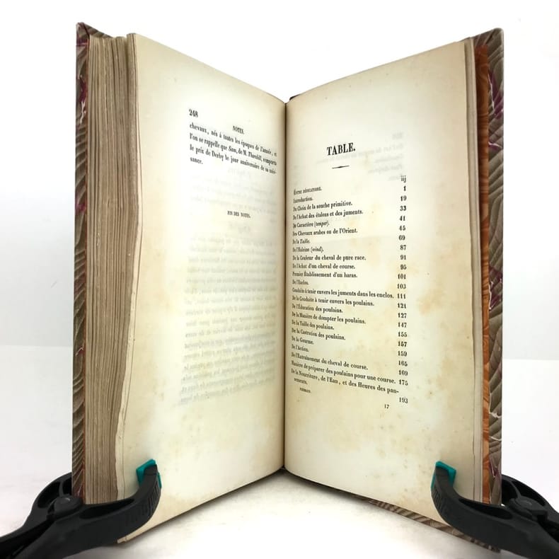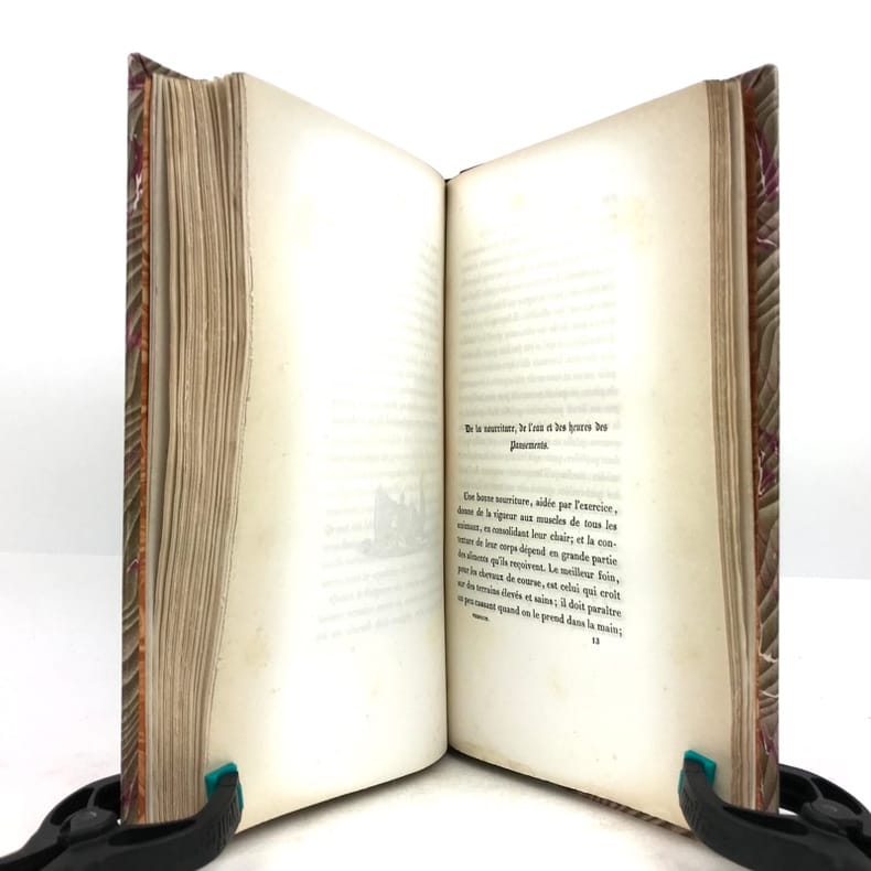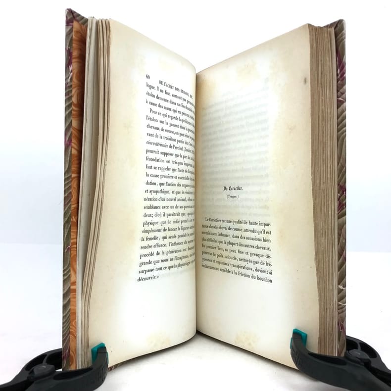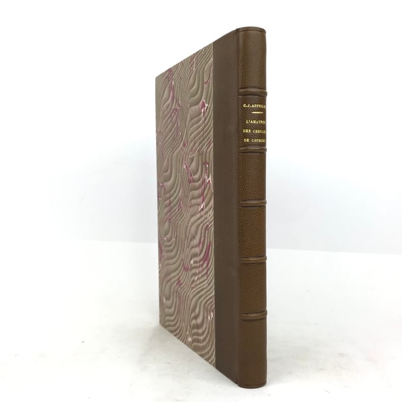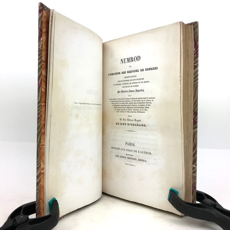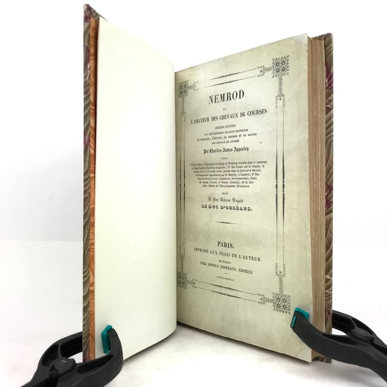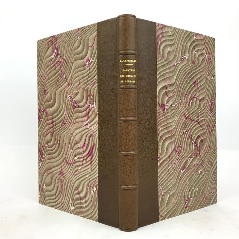 1 volume in-8 (21,5 x 13,5 cm), demi chagrin brun (reliure de l’époque), couverture supérieure conservée, dos à nerfs orné, tranche de tête dorée, ex-libris aux armes de Richard D'Oyly Carte (1844-1901), viii-258 [sic 250] pages (complet). Rousseurs. État très correct. Édition illustrée d’une gravure hors-texte. Charles James Apperley (1777-1843) est un sportif et écrivain gallois, issu d'une famille anglaise. Sous le pseudonyme “Nimrod”, soit “Nemrod en français”, il publie de nombreux ouvrages en lien avec la chasse, ou encore comme ici les chevaux de course. Il est également l’auteur d’une série d'articles pour le Sporting Magazine, couvrant les courses hippiques, les chasses à courre et autres événements sportifs. Rare exemplaire.