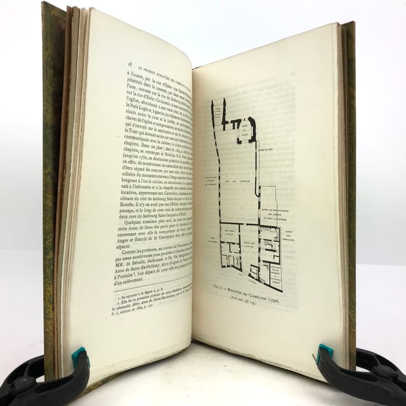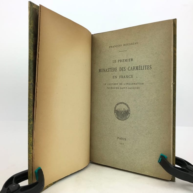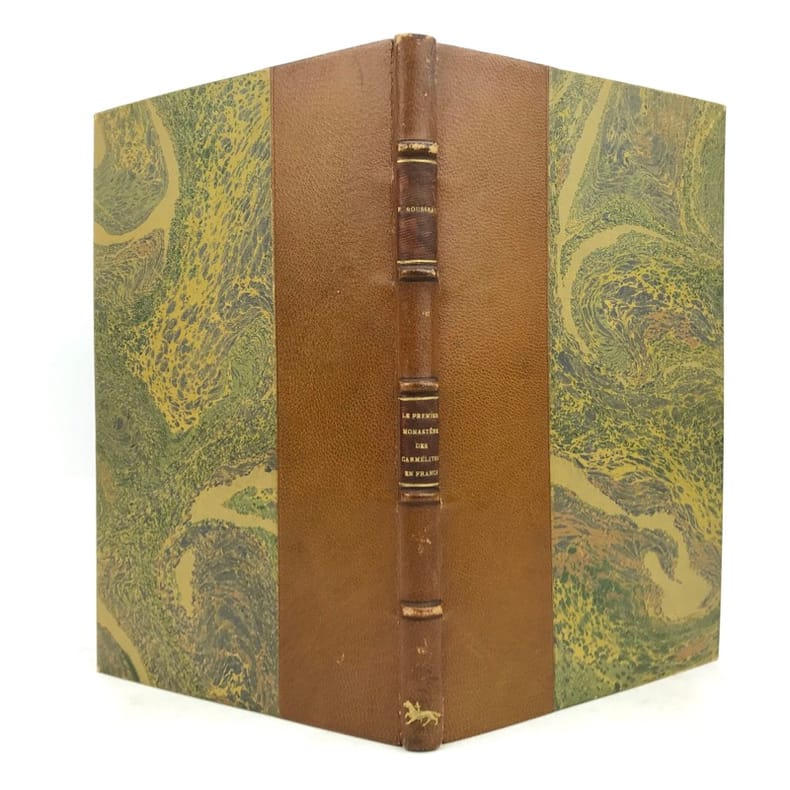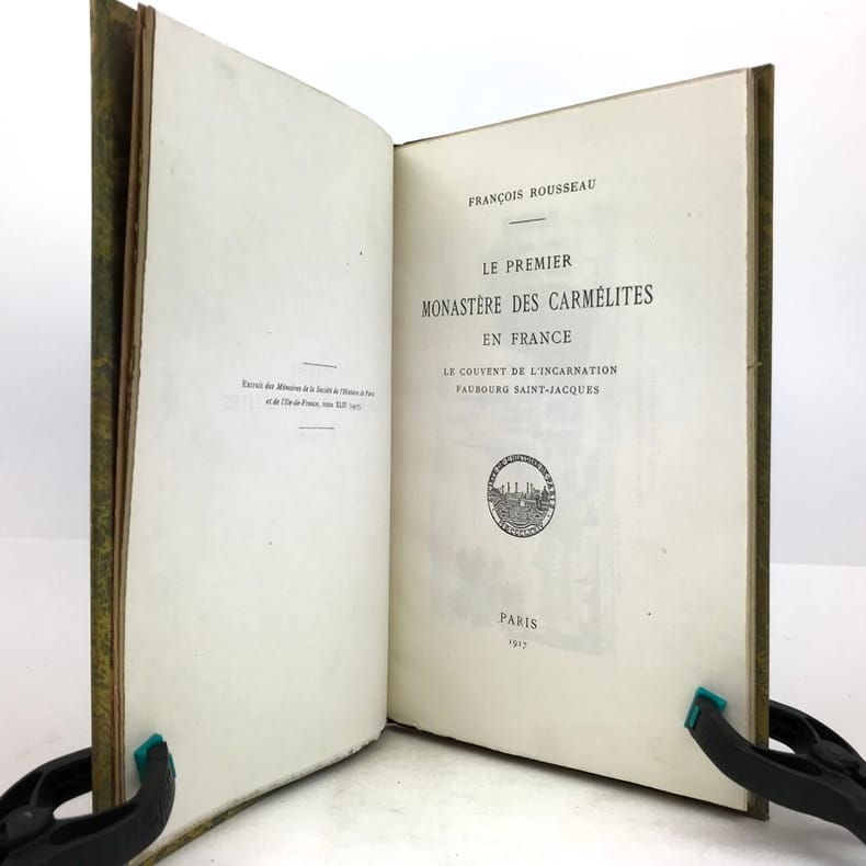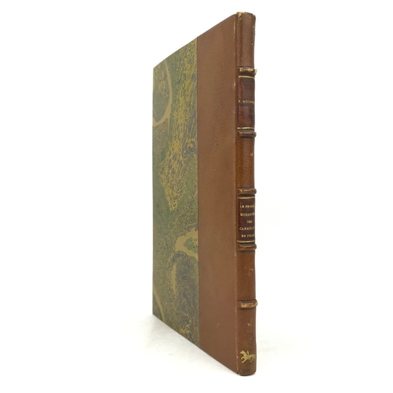 1 volume in-8 (23,5 x 15 cm), demi chagrin fauve (reliure de l’époque), couverture conservée, dos à nerfs orné avec motif doré en queue (loup transpercé d’une épée), tranche de tête dorée, [4]-106-[2] pages (complet). Mors frottés. État correct. ÉDITION ORIGINALE, illustrée de deux gravures hors-texte. François Rousseau (1862-1927) est un historien, président de la Société des études historiques (1916-1927) et secrétaire de la société de l'histoire de Paris et de l'Ile-de-France. Il rédige ici une monographie sur le couvent des Carmélites du faubourg Saint-Jacques, le premier déchaussé, fondé en 1604 par Catherine de Nevers, duchesse de Longueville. Il attira de nombreuses femmes nobles, avant d’être définitivement fermé à la Révolution. Bon exemplaire.