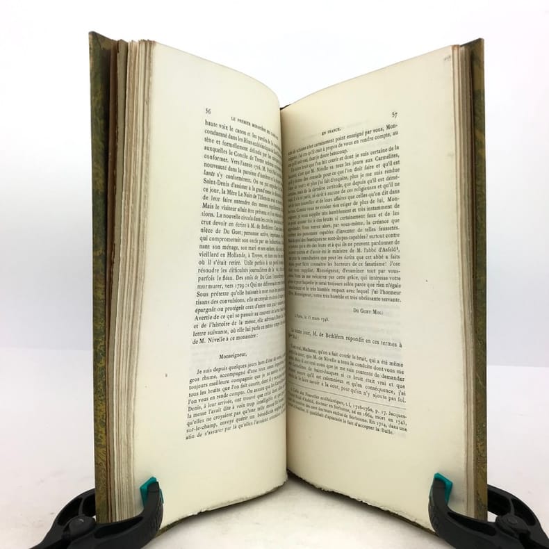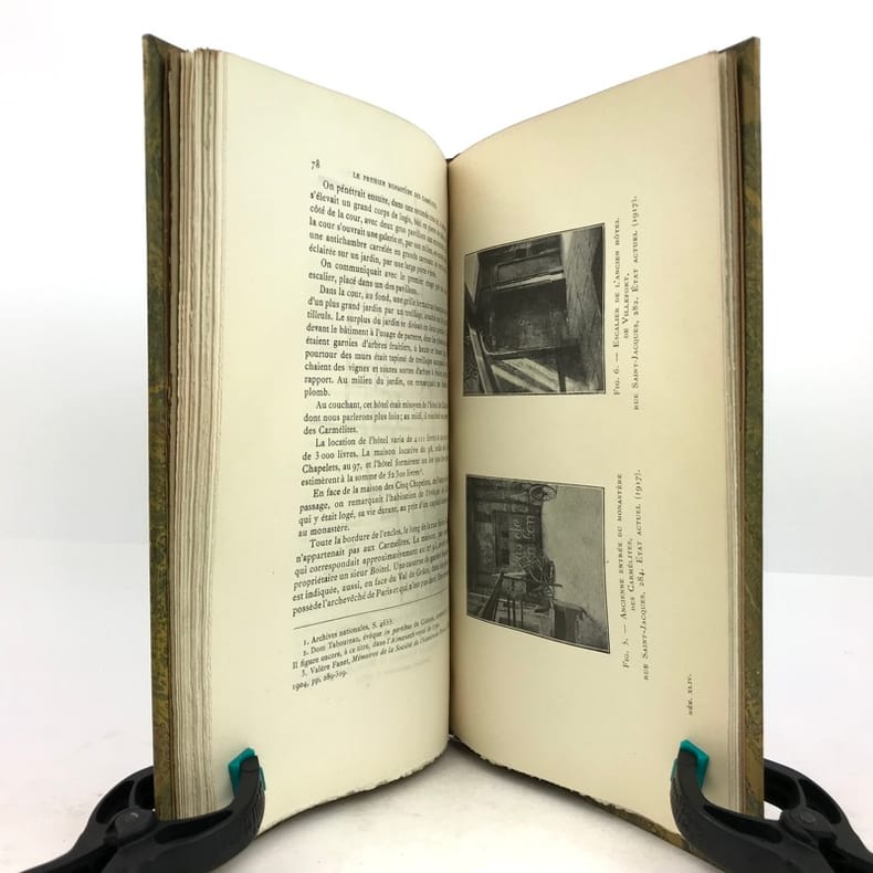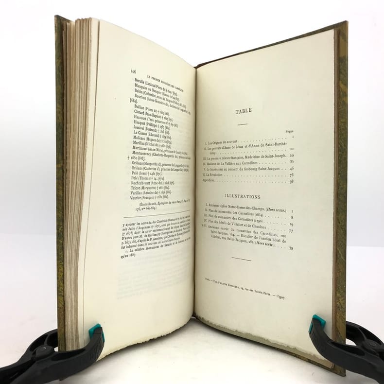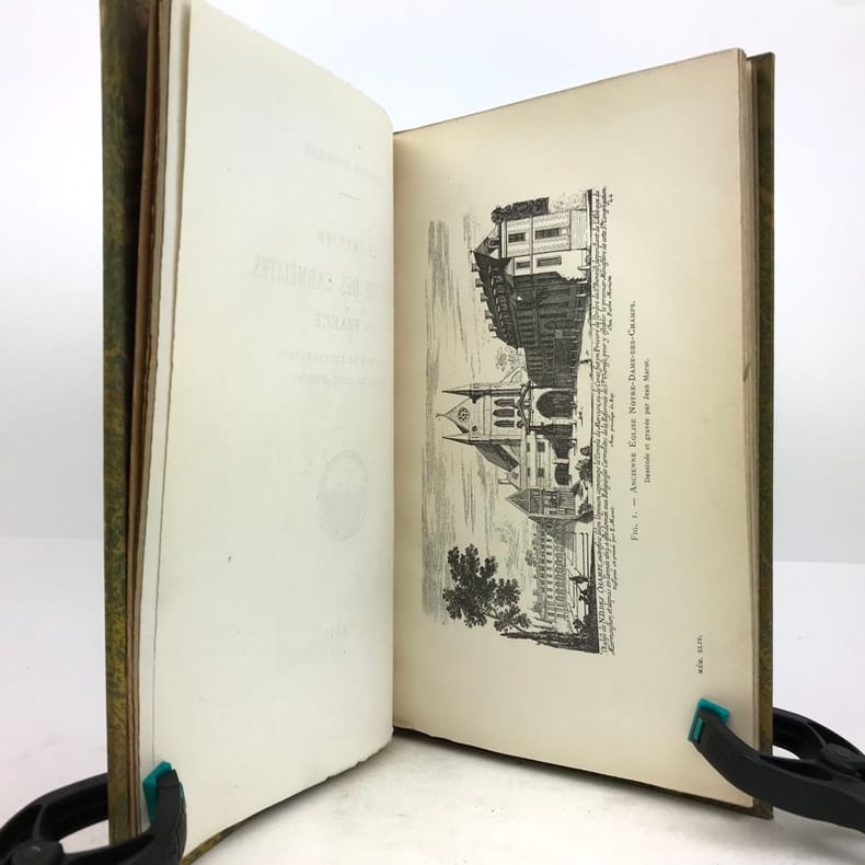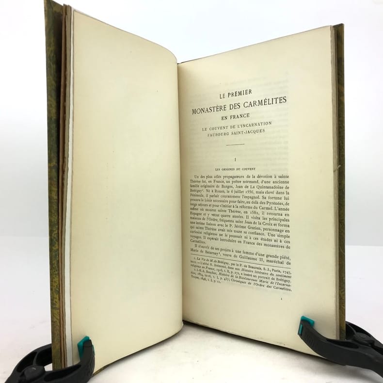 1 volume in-8 (23,5 x 15 cm), demi chagrin fauve (reliure de l’époque), couverture conservée, dos à nerfs orné avec motif doré en queue (loup transpercé d’une épée), tranche de tête dorée, [4]-106-[2] pages (complet). Mors frottés. État correct. ÉDITION ORIGINALE, illustrée de deux gravures hors-texte. François Rousseau (1862-1927) est un historien, président de la Société des études historiques (1916-1927) et secrétaire de la société de l'histoire de Paris et de l'Ile-de-France. Il rédige ici une monographie sur le couvent des Carmélites du faubourg Saint-Jacques, le premier déchaussé, fondé en 1604 par Catherine de Nevers, duchesse de Longueville. Il attira de nombreuses femmes nobles, avant d’être définitivement fermé à la Révolution. Bon exemplaire.