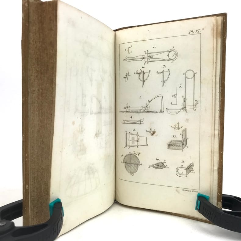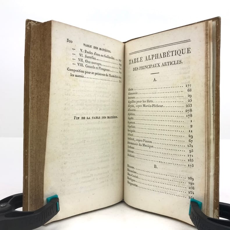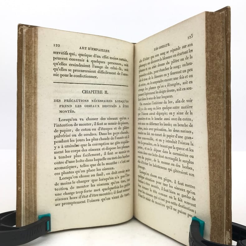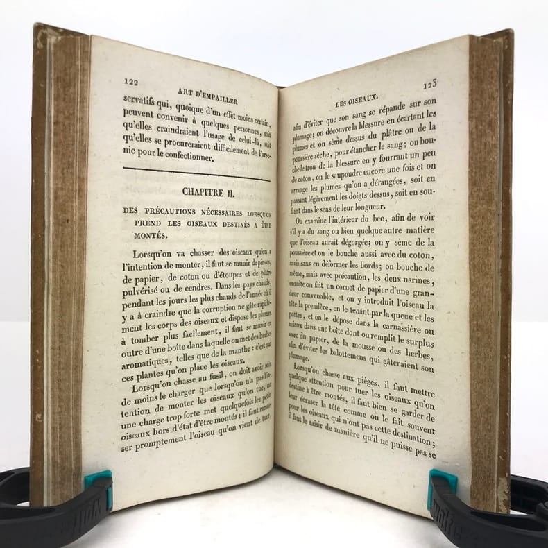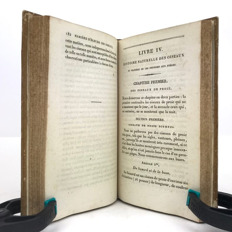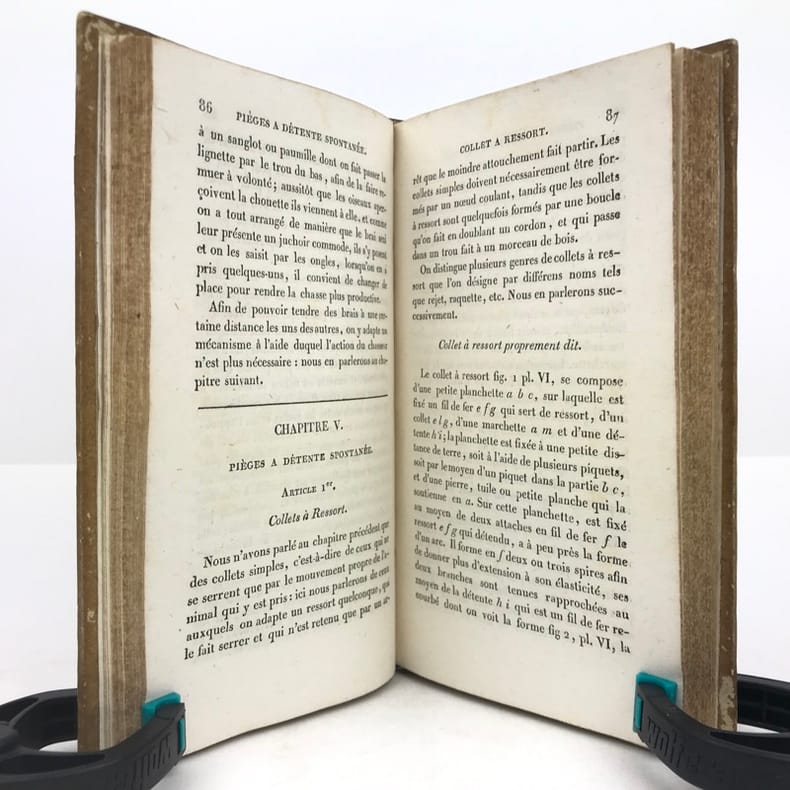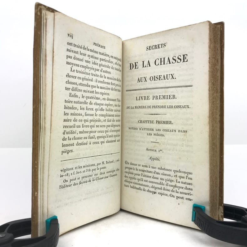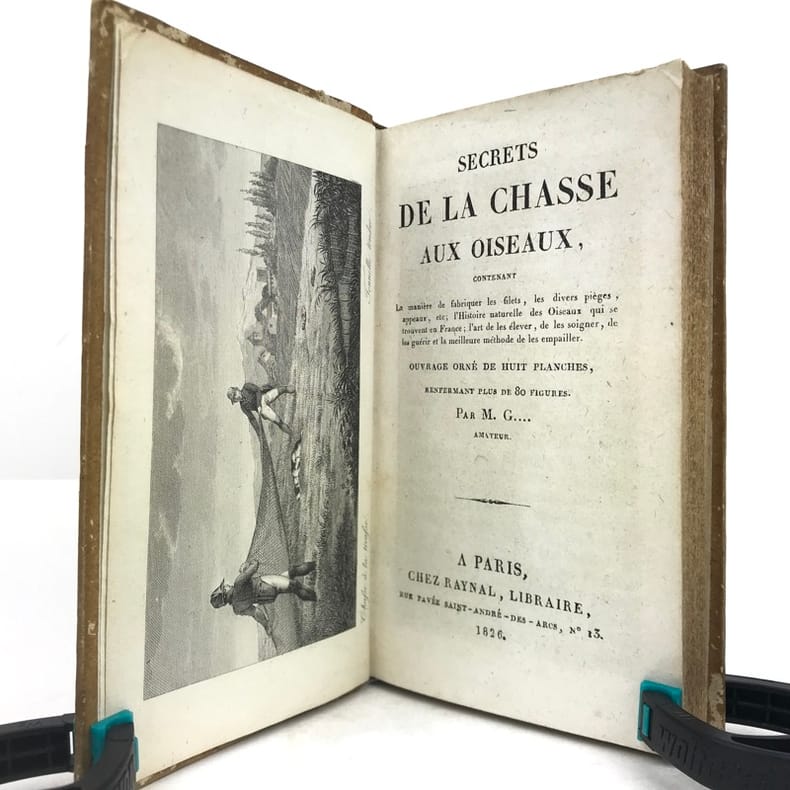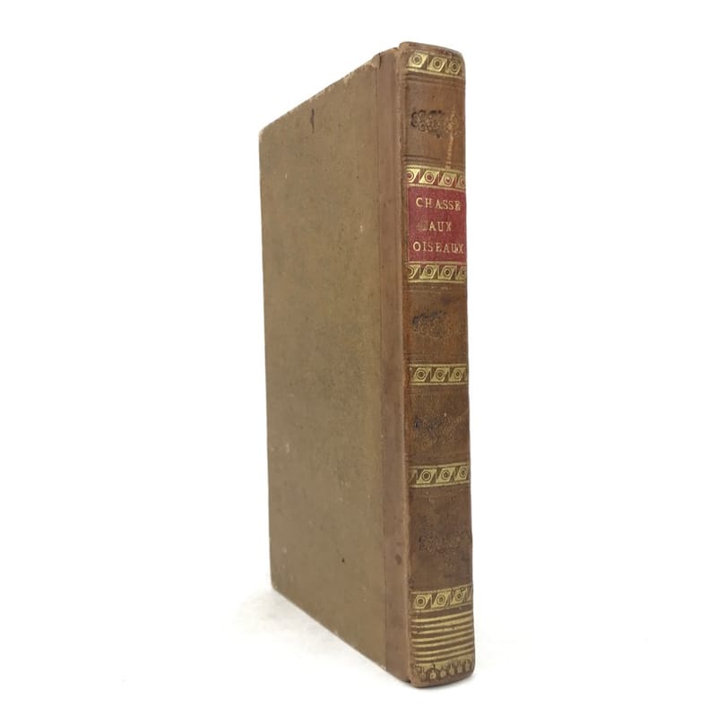 1 volume in-12 (17 x 10 cm), demi-basane miel (reliure de l’époque), dos lisse orné de filets et roulettes dorés, et de fleurons à froid, ex-libris contrecollé sur le premier contreplat du comte Greffulme. viii-328 pages (complet). Légers frottements sur le dos et usures sur les plats, les chants et les coins, pâles rousseurs marginales. État très correct. ÉDITION ORIGINALE illustrée d’un frontispice gravé, titré Chasse à la tirasse, et de 7 planches hors texte gravées par Durau. Recueil décrivant la manière de prendre les oiseaux (pièges et filets), la taxidermie, l’élevage et l’histoire naturelle du gibier à plume. Bon exemplaire.