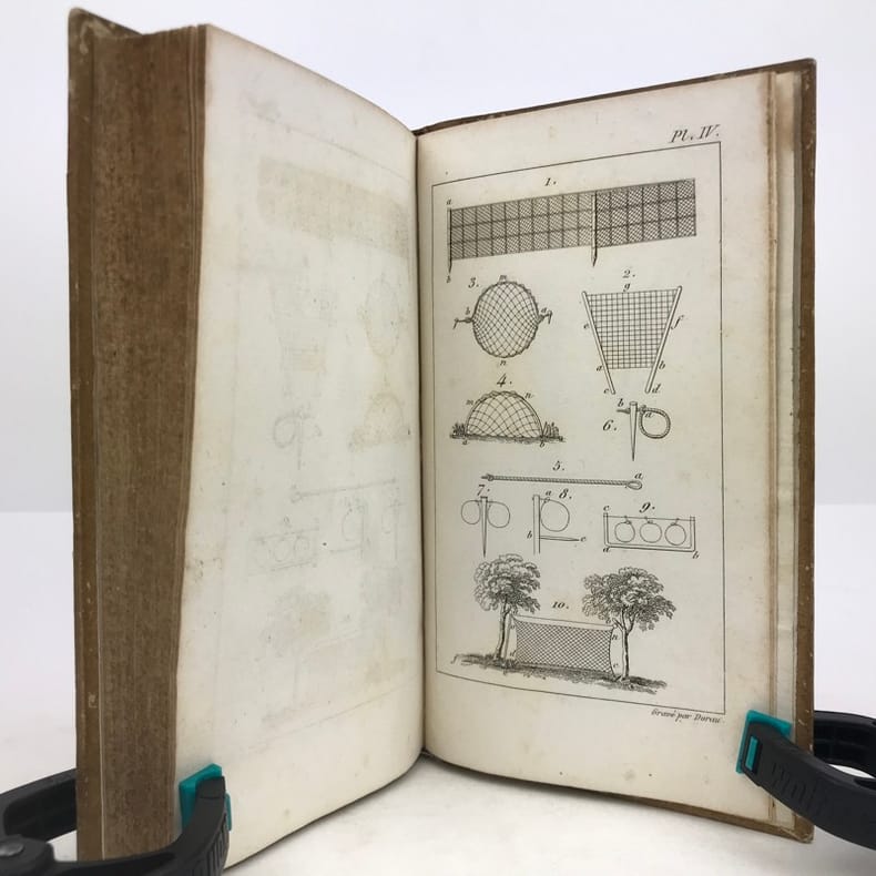 Paris, A la Librairie Encyclopédique de Roret, Au Martin-Pêcheur, chez A. Moriceau, (vers 1840). In-18 (145 x 89 mm), frontispice gravé et dépliant (chasse à la tirasse), 268 pp., 7 planches numérotées avec plus de 80 ill. (dessins), reliure demi-chagrin, étiquette de bibliothèque et cachet ex-libris contrecollés sur contreplat et page de garde, trace de mouillure sur premiers 15 feuillets et frontispice (légère), claires rousseurs, quelques planches coupées trop courtes, coins ouverts, coiffe sup. frottée, bon exemplaire.