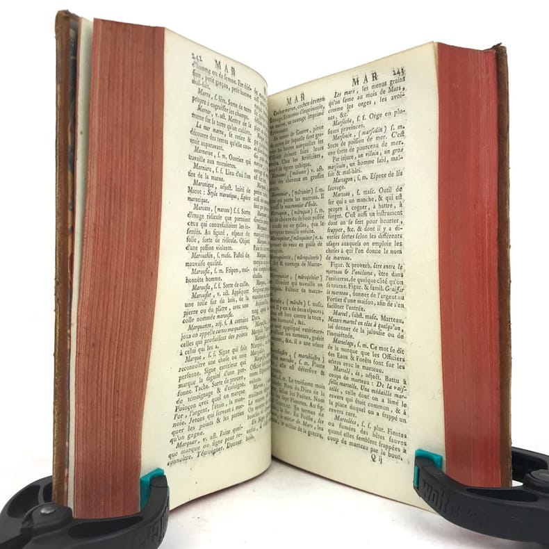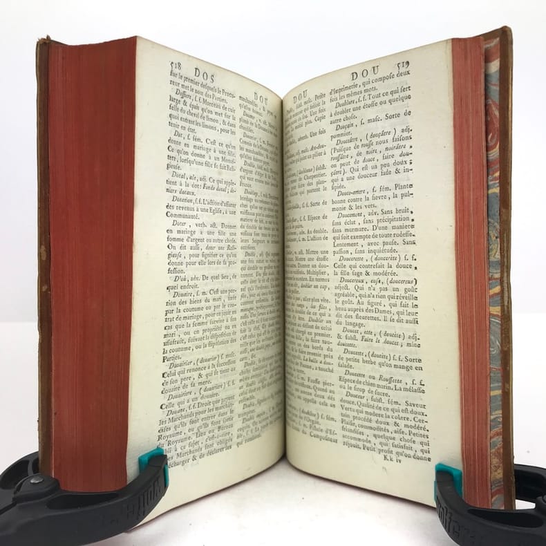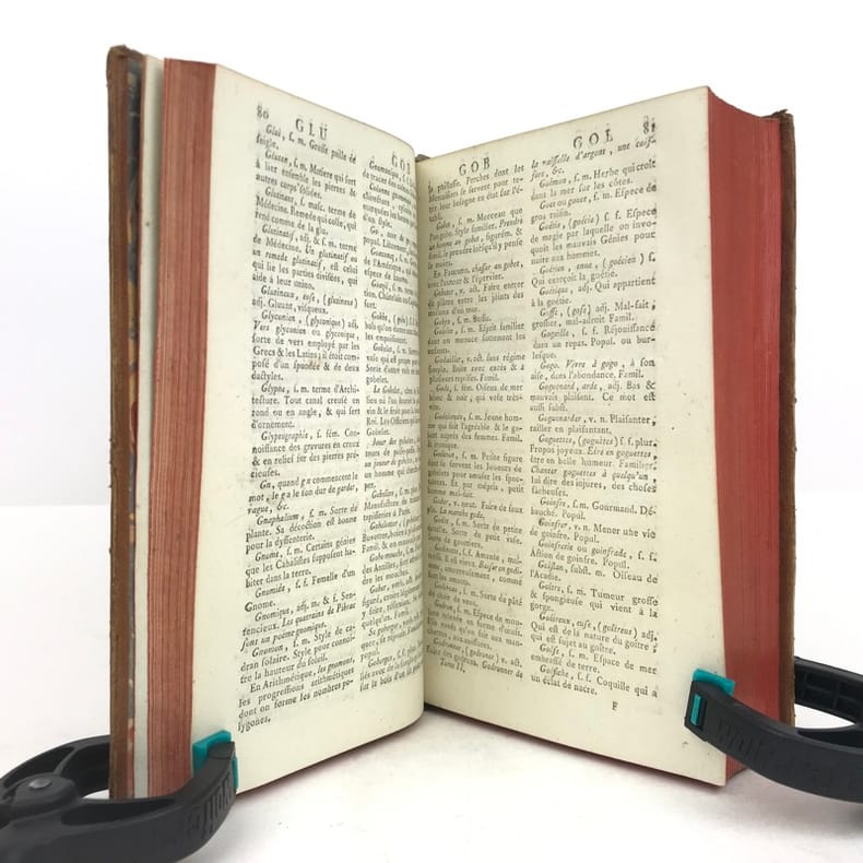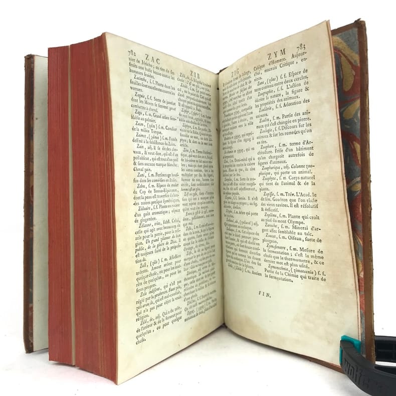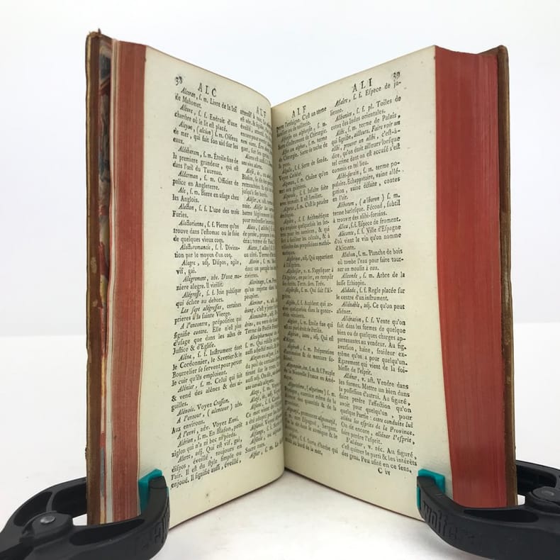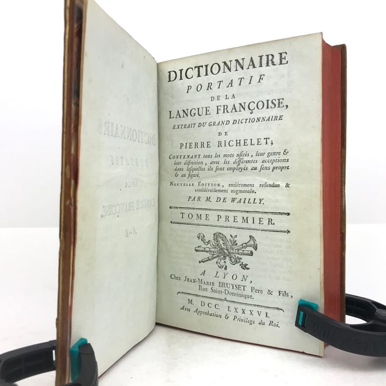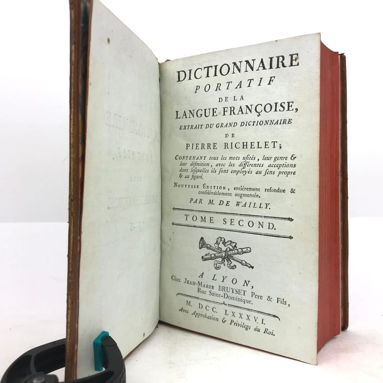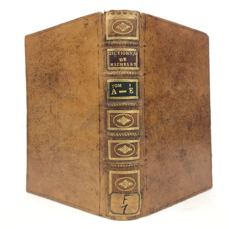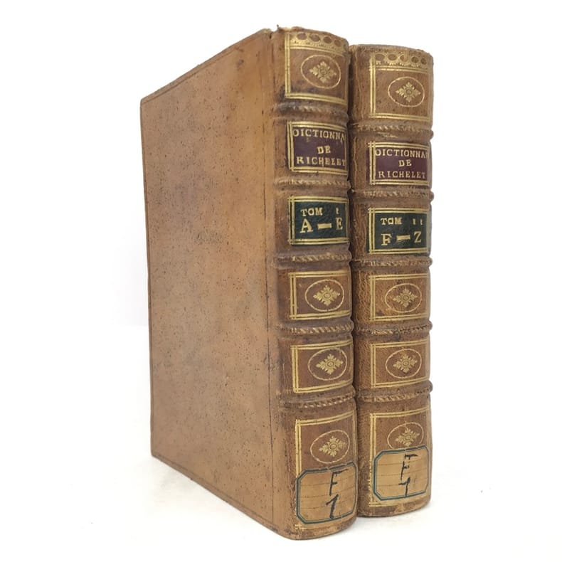 2 volumes in-12 (17 cm x 10,5 cm), basane brune (reliure de l’époque), dos à nerfs orné, pièce de titre rouge, pièce de tomaison verte, tranches rouges, ex-libris de A. Le Maréchal Beauvais contrecollé sur le contreplat. [4]-xliv-[4]-615-1 bl. ; [4]-783-1 bl. pages (complet). 1 mors fendu (2 cm), feuillets légèrement ternis. État très correct. Nouvelle édition revue par de Mailly. César-Pierre Richelet, plus connu sous le nom de Pierre Richelet (1626-1698) est un grammairien et lexicographe français, rédacteur d'un des premiers dictionnaires de la langue française et du premier dictionnaire de rimes de la langue française. Agréable exemplaire.
