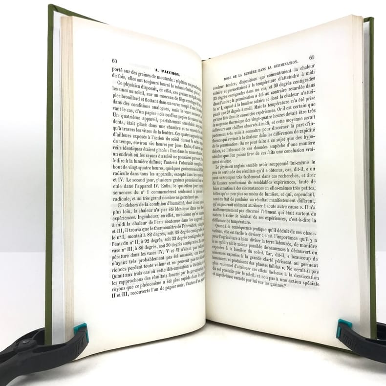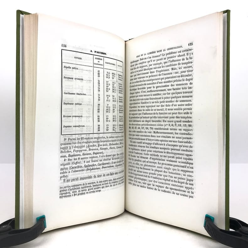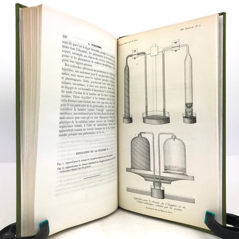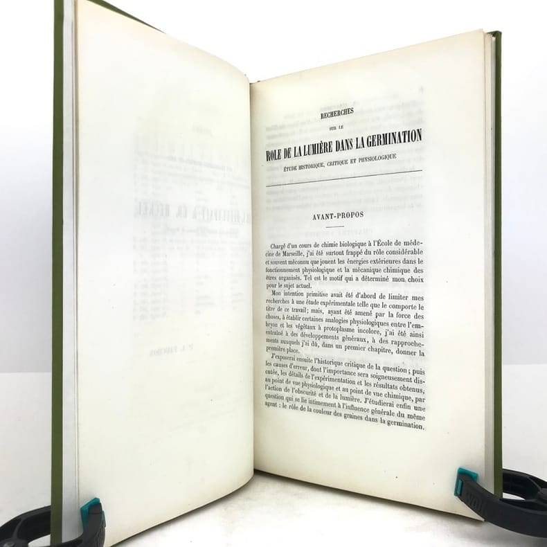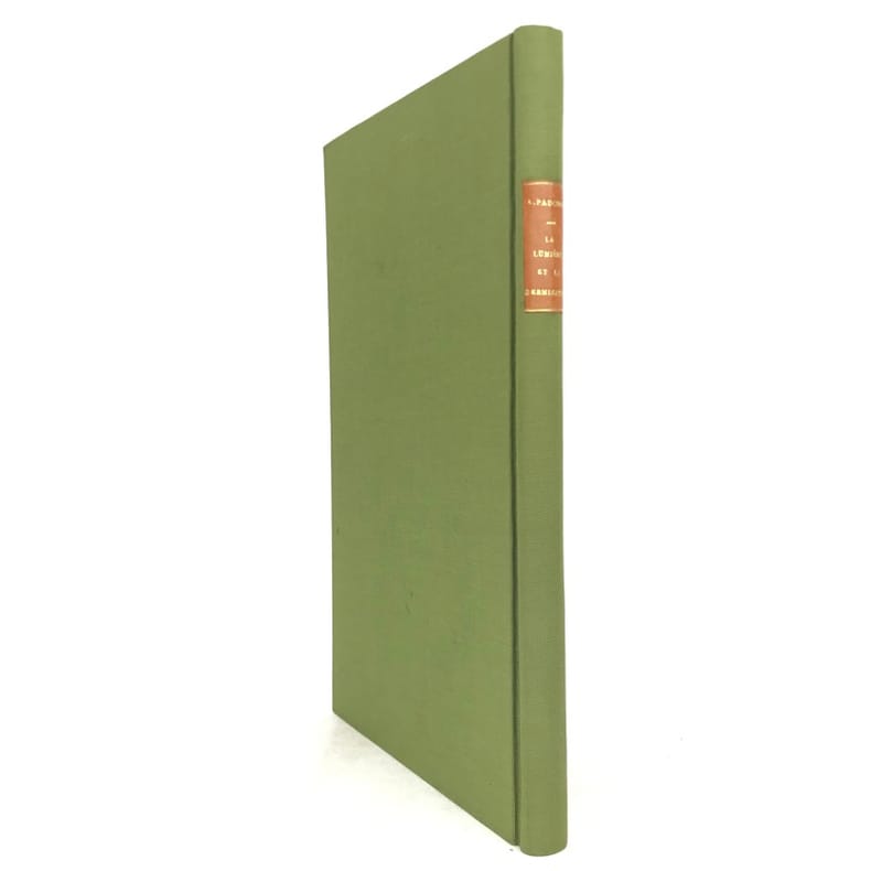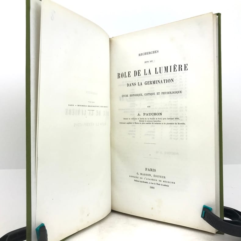 1 volume in-8 (24,5 x 15,5 cm), bradel toile verte (reliure moderne), pièce de titre orangée. 220-[2] pages (complet). Très bon état. RARE ÉDITION ORIGINALE de cette thèse d'Albert Pauchon, présentée et soutenue le 19 novembre 1880; illustrée d’une planche hors texte titrée : “Appareils pour le dosage de l’Oxygène et de l’Acide carbonique exhalés par les graines”. Albert Pauchon (1848-1904), docteur en médecine et lauréat de la Faculté de Paris (prix Corvisart 1870), docteur ès sciences naturelles, Professeur suppléant à l’École de plein exercice de médecine et de pharmacie de Marseille. Bon exemplaire.