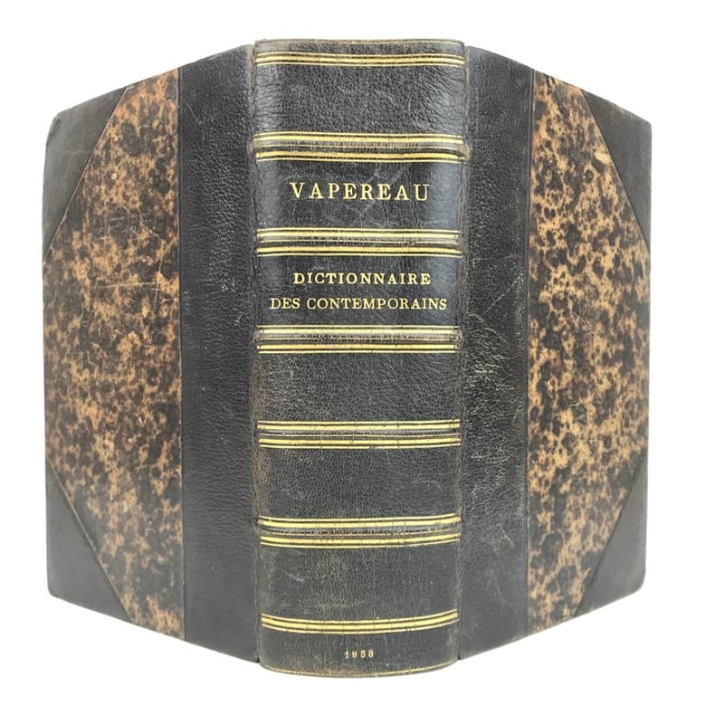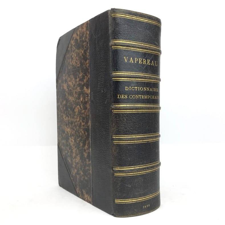1 volume fort grand in-8 (25 cm x 15 cm), demi-maroquin noir à coins dos à nerfs à filets dorés, tranches marbrées. [4]-xi-1 bl.-1802 pages (complet). Mouillures, rousseurs. État très correct. Première édition de ce dictionnaire continuellement tenu à jour, avec le concours d'écrivains et de savants de tous les pays.Louis Gustave Vapereau, (1819-1906), est un écrivain et encyclopédiste français. Il est surtout connu comme l’auteur du Dictionnaire universel des contemporains et du Dictionnaire universel des littératures.Agréable exemplaire.