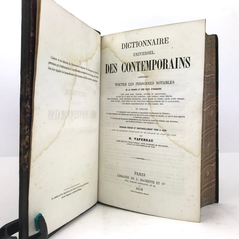 Bon exemplaire de ce fameux et utile dictionnaire. — "Comme tout ce qui sort de la plume de M. Vapereau, le “Dictionnaire des contemporains” est très-bien écrit ; on y retrouve à chaque ligne le normalien qui s'est nourri de la moelle des génies de l'antiquité. Ajoutons que c'est un des livres qui nous ont le plus aidé dans la partie de notre travail que son cadre embrasse. Il nous a épargné une correspondance pénible et fastidieuse. La biographie contemporaine est un champ que M. Vapereau a péniblement défriché à notre profit, et nous ne pouvons nous empécher de reconnaître que le “Dictionnaire des contemporains” est une oeuvre éminemment utile, où l'on trouve une foule de renseignements précieux et presque toujours exacts." (Pierre Larousse, Grand dictionnaire universel du XIXe siècle)