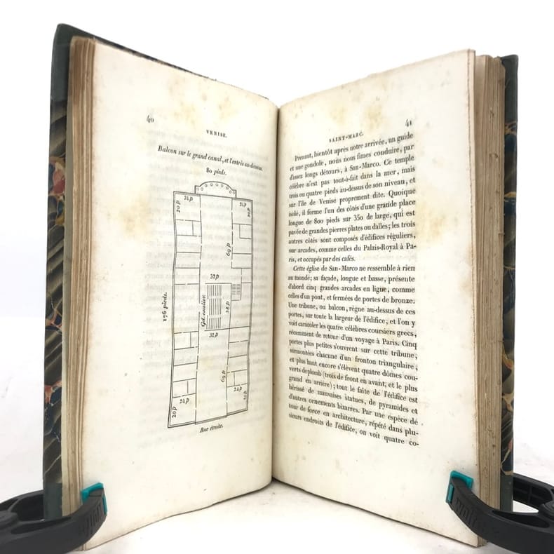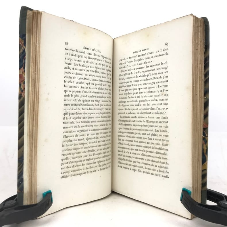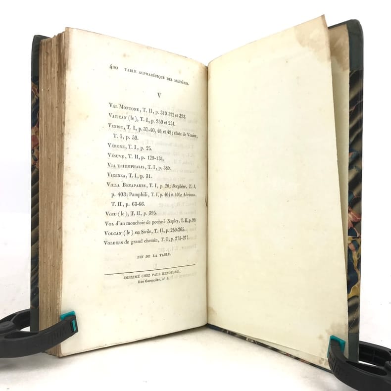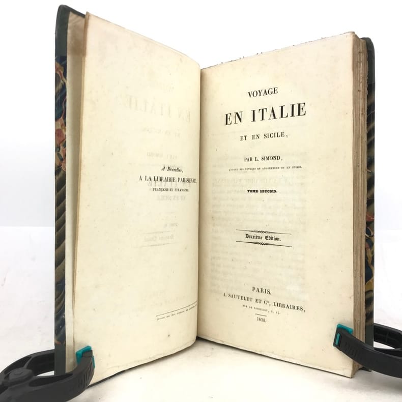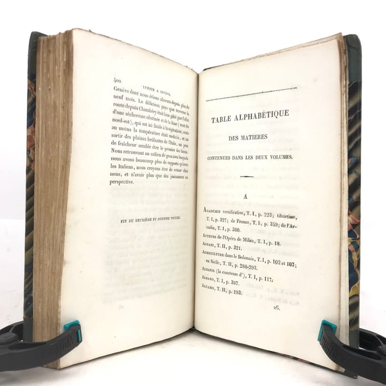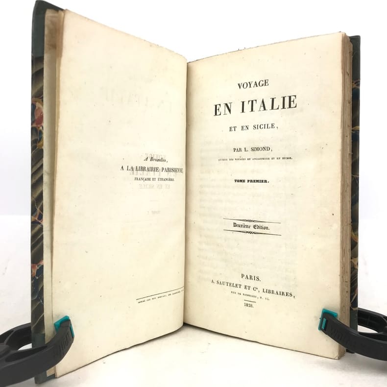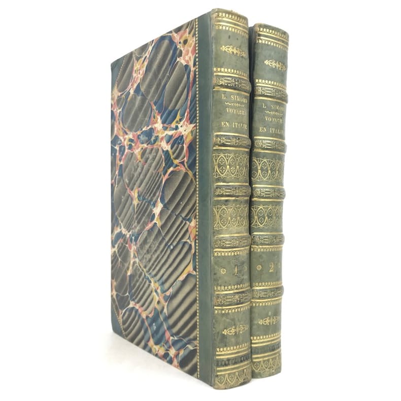 A. Sautelet Et Compagnie Paris 1828 2 volumes grands in-12 demi basane verte.Dos à 4 nerfs. Titre et tomaison dorés.Larges guirlandes dorées en tête et queue.Fleurons dorés entre-nerfs, filets perlés dorés soulignants les nerfs. Roulette à froid sur nerfs.Tranches marbrées.Par l'auteur des voyages en Angleterre et en Suisse.Tome 1. 405 pages.1 gravure hors texte et un tableau.Iles Borromées, Cathédrale de Milan, Fore Buanaparte, Milan, Vicenza, Padoue, Venise, Opéra, Palais Ducal, Doge, Pô, Les morts, L'Inquisition, Moeurs, Appenin, Raphaël, Fabbroni, Val d'Arno, Mendiants, Perugia, Terni, Assassins, St Pierre, Capitole, Colysée, Mont Palatin, Thermes Titus, Caracalla, Obélisque égyptien, Vatican, Michel Ange, Voleurs grd chemin, Bonaparte, Mariage, Ile du Tibre, Carnaval, etc.Tome 2 et dernier. 420 pages.1 gravure hors-texte et 1 dessin in-texte.Caere, Origine de Rome, 1ers romains, Latium, Mal'Aria, Borghèse, Adriana, Semaine sainte, rerracina, Capoue, Baie de Naples, Moeurs, Pompeia, Portici, Vésuve, Moeurs, Pzzuolo, Baïa, Gouvernement, Paquebot, Navigation, Instruction, Moeurs, Monte Reale, Segeste, Selimonte, Alicata, Chiara monte, Syracuse, Etna, Catane, La Sicile, Agriculture, Salerne, Pompeia, Mont Cassin, Montone, Anagni, Pise, Massa Carrara, Gênes, Sardaigne, Turin, Suze, Mont Cénis, Savoyards.Table alphabétique.Très bel exemplaire.