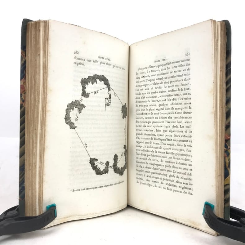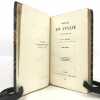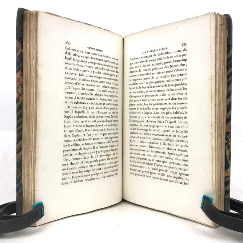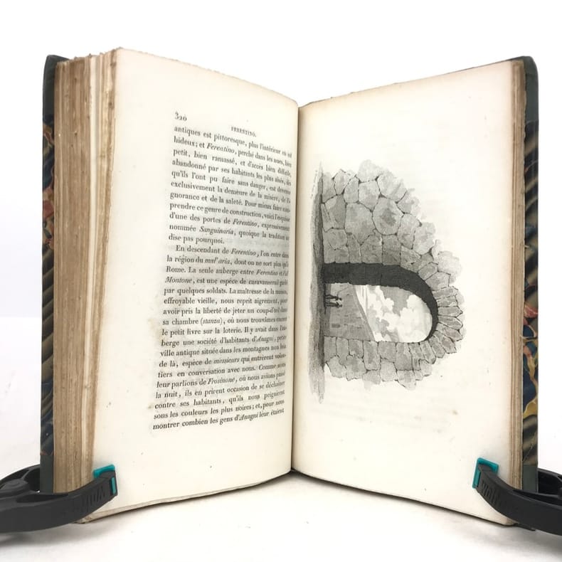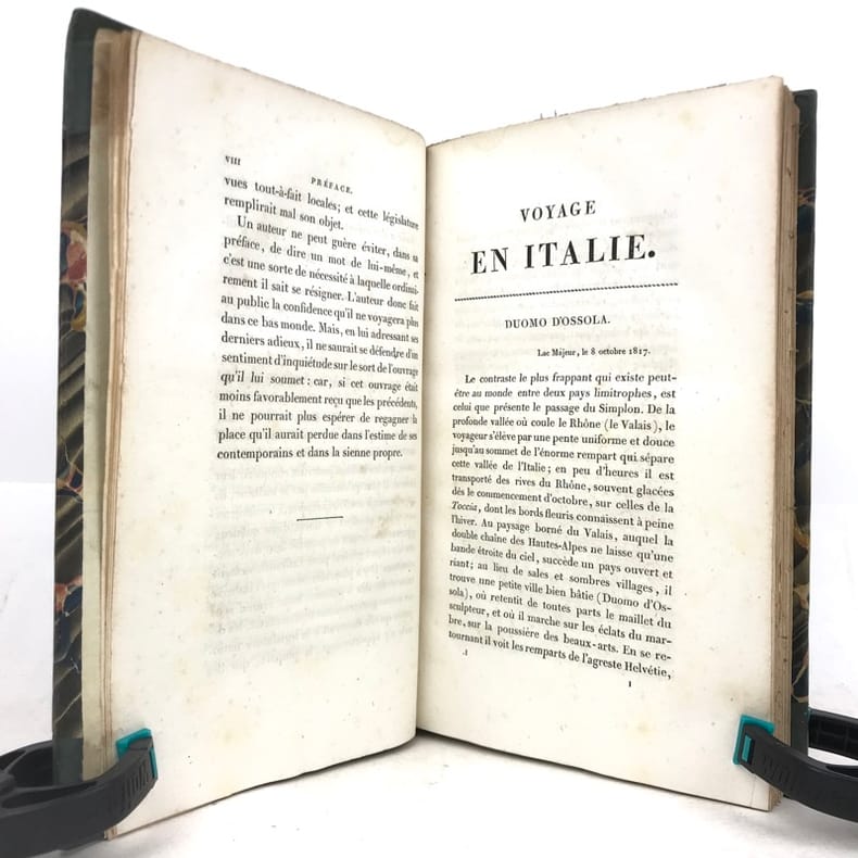 Edition originale, illustrée de 2 figures in-texte et deux hors-texte (répétés), ainsi que d'un tableau (mouvement de la population dans la ville de Rome). Reliure en demi veau glacé noisette d'époque. Dos à faux nerfs orné de filets gras et maigres, à froid et à chaud, roulette en queue et tête. Pièce de titre de chagrin noir. Traces de frottements. Brunissures éparses, notamment en page de titre, puis essentiellement dans les marges, mais de manière erratique. Un petit manque au mors inférieur en queue. Bel exemplaire. Voyage qui commence au lac majeur de Duomo d'Ossola, petite ville sur la frontière italienne en 1817 et s'achève en 1818 à Suze, près de Turin. Outre l'intérêt du voyage en Sicile et sur l'Etna, à Pompéi et Herculanum, l'ensemble du voyage brille de certaines résonnances politiques, puisqu'il fut fait au lendemain de l'Empire et à l'aube des révolutions italiennes. Nombreuses descriptions en rapport aux beaux-arts, intérêt pour le pittoresque et l'anecdote (chapitre sur les mendiants et les voleurs de grand chemin en Italie). - Photographies et détails sur www.Edition-Originale.com -