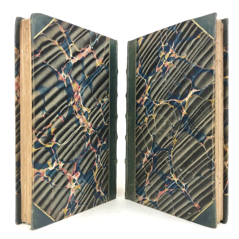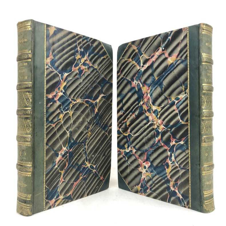 2 volumes in-8 (21,5 x 13,5 cm), demi-veau vert à coins (reliure de l’époque), dos à nerfs joliment orné de filets, roulettes et fleurons dorés. [4]-viii-405-1bl. ; [4]-420 pages (complet). Dos insolés, légers frottements aux coiffes, aux charnières, sur les chants et les coins, rousseurs éparses sans gêne de lecture et pâles mouillures marginales à quelques feuillets. État très correct tout de même. Seconde édition illustrée de 2 planches hors texte gravées sur bois par Morizot et de 3 figures in texte. La première édition de ce texte de Louis Simond (1767-1831) fut publiée en 1827. Bon exemplaire.