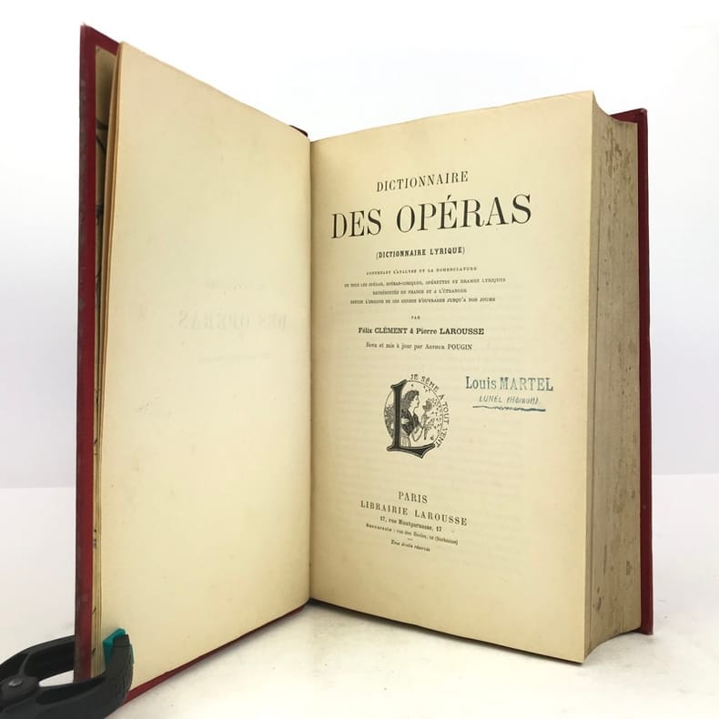 1 volume in-4 (24 cm x 15 cm), demi-chagrin rouge, dos à nerfs, ex-libris de Louis Martel tamponné sur la page de titre. xvi-1203-1 bl.-[2] pages (complet). Frottements à la reliure. État très correct tout de même. Nouvelle édition revue et mise à jour par Arthur Pougin. Servant de guide à tout intéressé, ce dictionnaire développe l'histoire de l'opéra de ces origines jusqu'à l'ère contemporaine. Il nous livre une masse inégalée de renseignements sur l'opéra qui, du baroque au bel canto en passant par le répertoire slave et la zarzuela, constituent encore la quasi-totalité du répertoire actuel de nos théâtres lyriques. Agréable exemplaire. Vendu 02/10/2025