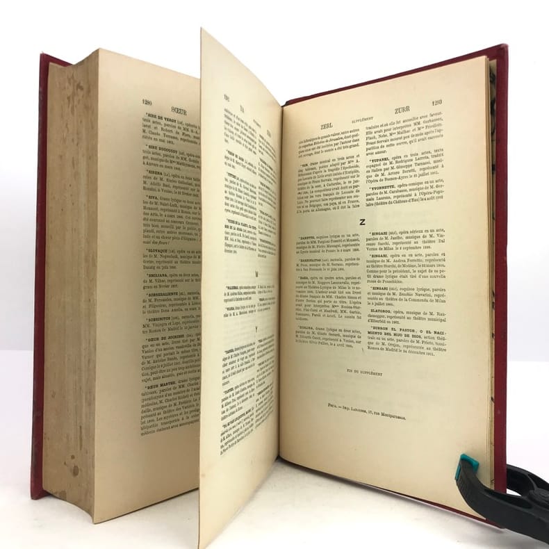 Dictionnaire des opéras (dictionnaire lyrique), contenant l'analyse et la nomenclature de tous les opéras et opéras-comiques représentés en France et à l'étranger depuis l'origine de ce genre d'oeuvres jusqu'à nos jours. Complété par des suppléments périodiques maintenant à cet ouvrage un caractère d'actualité. [4 suppléments 1866-1869, 1869-1872, 1873-1876, 1877-1880). (Paris: Administration du Grand Dictionnaire Universel, [1880]). [M.C.: musique, opéra, dictionnaire]