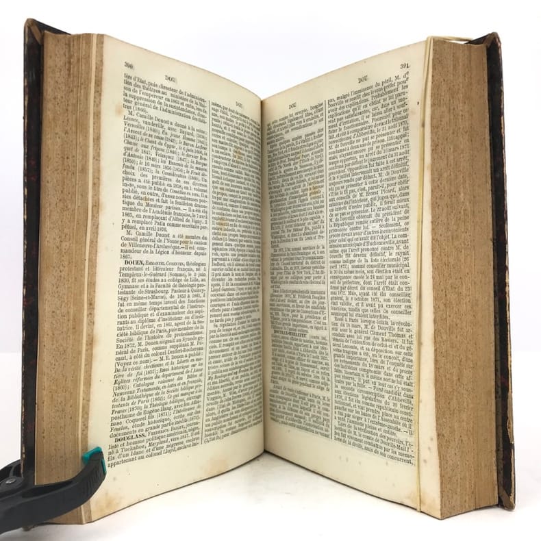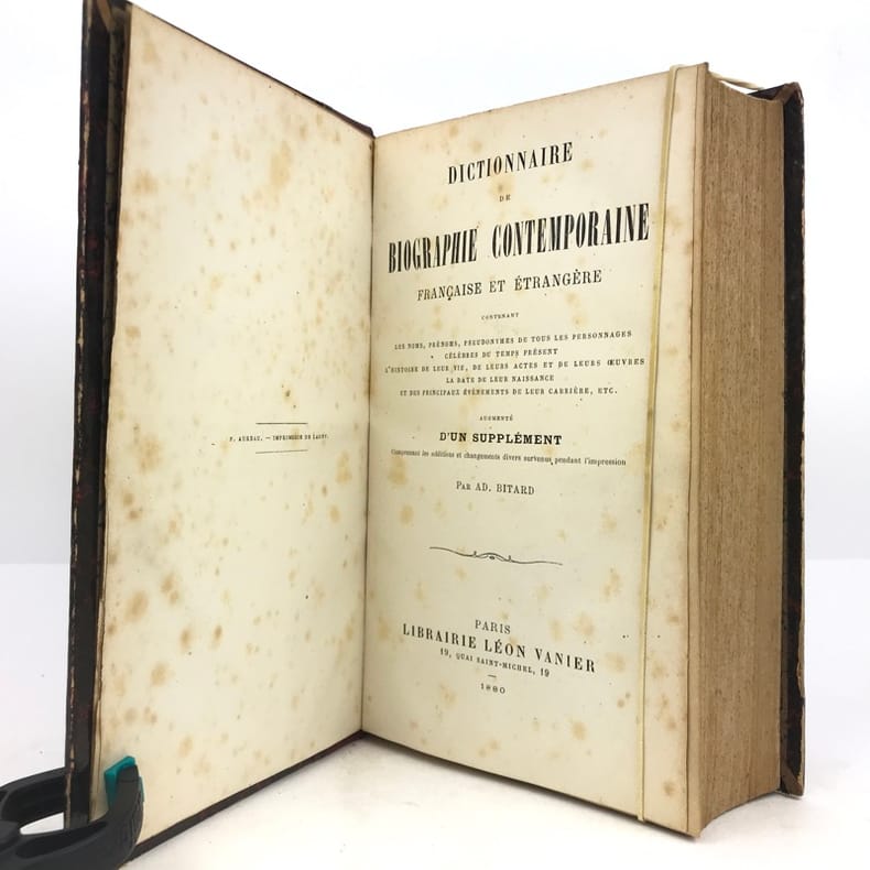 Nouvelle édition, "entièrement refondue", du dictionnaire publié par le journaliste Adolphe BITARD en 1878 (Paris, M. Dreyfous, et dont le titre précisait "contenant les noms et pseudonymes de tous les personnages célèbres du temps présent"), donnant des notices détaillées (dont bibliographies des éventuelles publications) sur les personnalités connues ou méconnues du XIXè siècle; avec corrections et additions de décembre 1886; texte sur 2 colonnes.