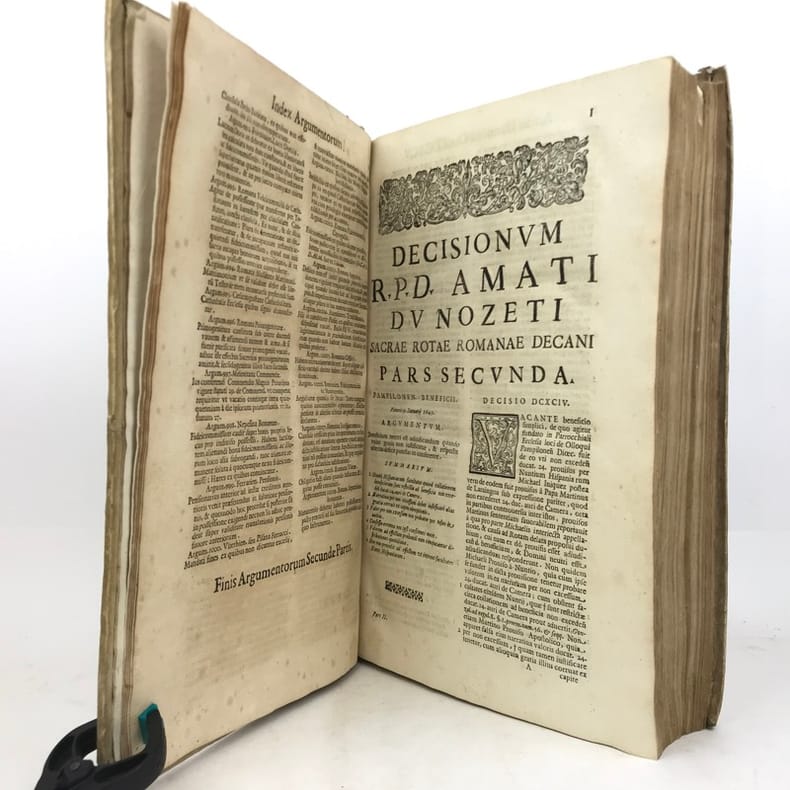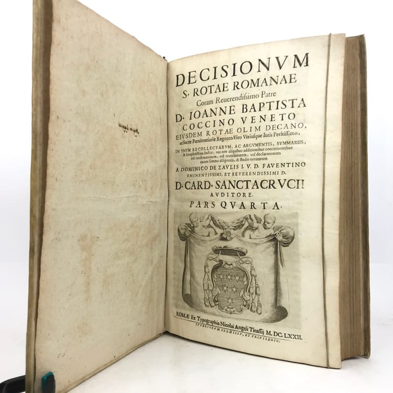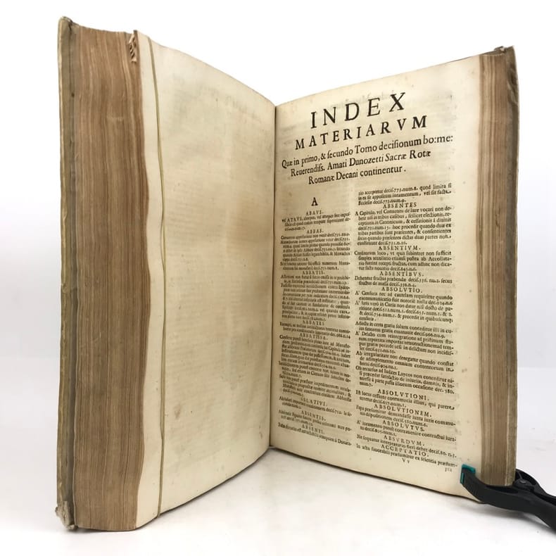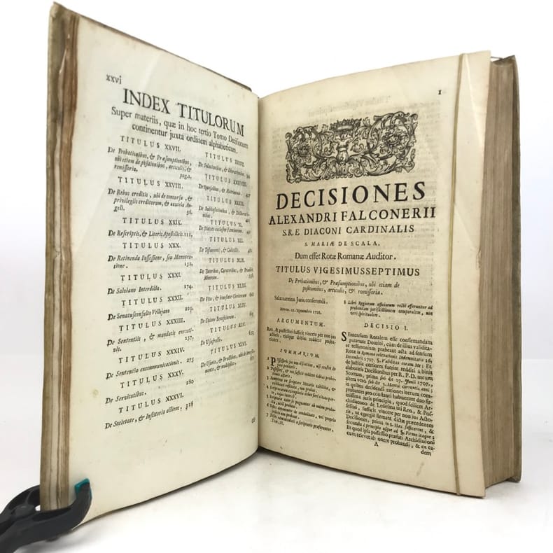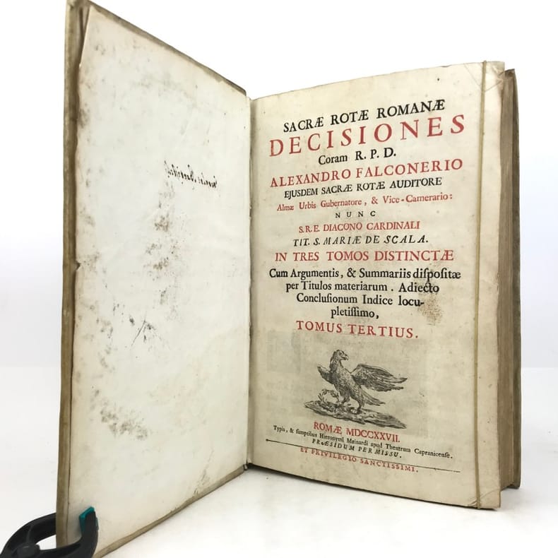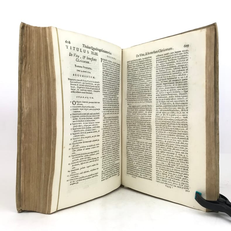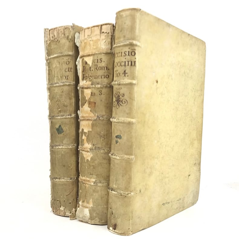 Ensemble de 3 volumes in-folio (33,5 cm x 23 cm), vélin (reliure de l’époque), dos à nerfs, lettres noires au dos, titre à l’encre noire et rouge, ex-libris manuscrit sur la première garde, texte sur deux colonnes en latin, [10]-499-1 bl.-[250] ; [2]-xxvi-769 ; [22]-658-[1]-1 bl; pages (complet en soi). Signatures : a4, a6, A-Z6, Aa-Ss6, Tt4, Vv-Zz6, Aaa-Rrr6 ; a2, a-f2, g1, A-Z4, Aa-Zz4, Aaa-Zzz4, Aaaa-Zzzz4, Aaaaa-Bbbbb4, Ccccc6 ; $, a-d4, A-Z4, Aa-Zz4, Aaa-Zzz4, Aaaa-Mmmm4, Nnnn6. Frottements, épidermures, coiffes découvertes, manque de cuir aux dos, mors fendus (sur la longueur), déchirures marginales, quelques feuillets brunis, rousseurs éparses. État correct tout de même. Nouvelles éditions de décisions de la rote romaine, plus haut tribunal civil de la papauté. Cet ensemble se compose du tome II des Mellifluæ Decisiones de Dunozetus, du tome III des Sacræ rotæ romanæ decisiones de Falconerius, et du tome IV des Decisionum S. rotæ romanæ de Coccinus. Ces ouvrages sont des index ou plutôt des séries d’index des décisions de la rote romaine. On a tout d’abord un index des auteurs qui ont publié des recueils de décisions de la rote (plus d’une centaine sont citées) puis un catalogues des auditeurs de la rote dont les décisions sont répertoriées, classées par nom, par cité, par époque, on trouve ensuite un index par matière puis enfin une table des décisions elles-mêmes classées par diocèse et à l’intérieur de chaque diocèse par matière ; il s'agit d'un outil indispensable pour accéder à ces collections de décisions parfois très lourdes. Agréable exemplaire.