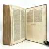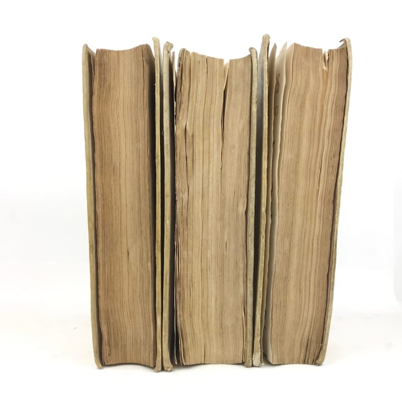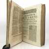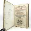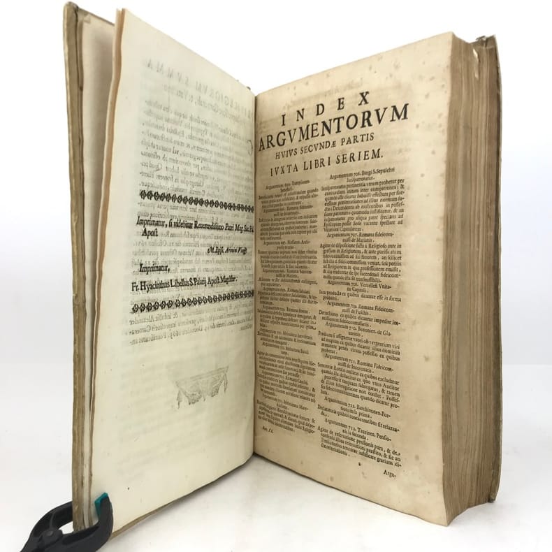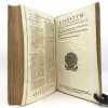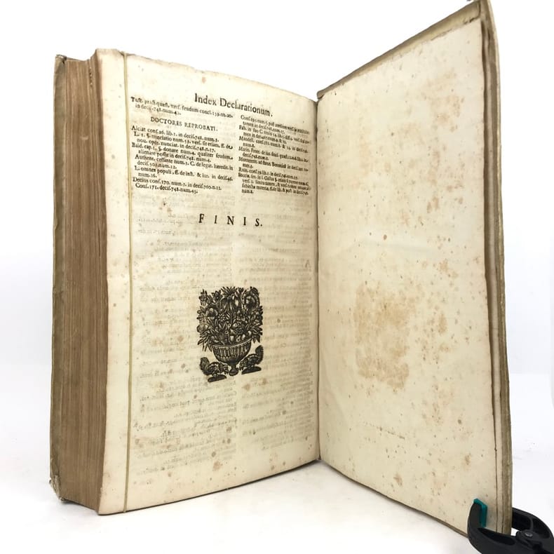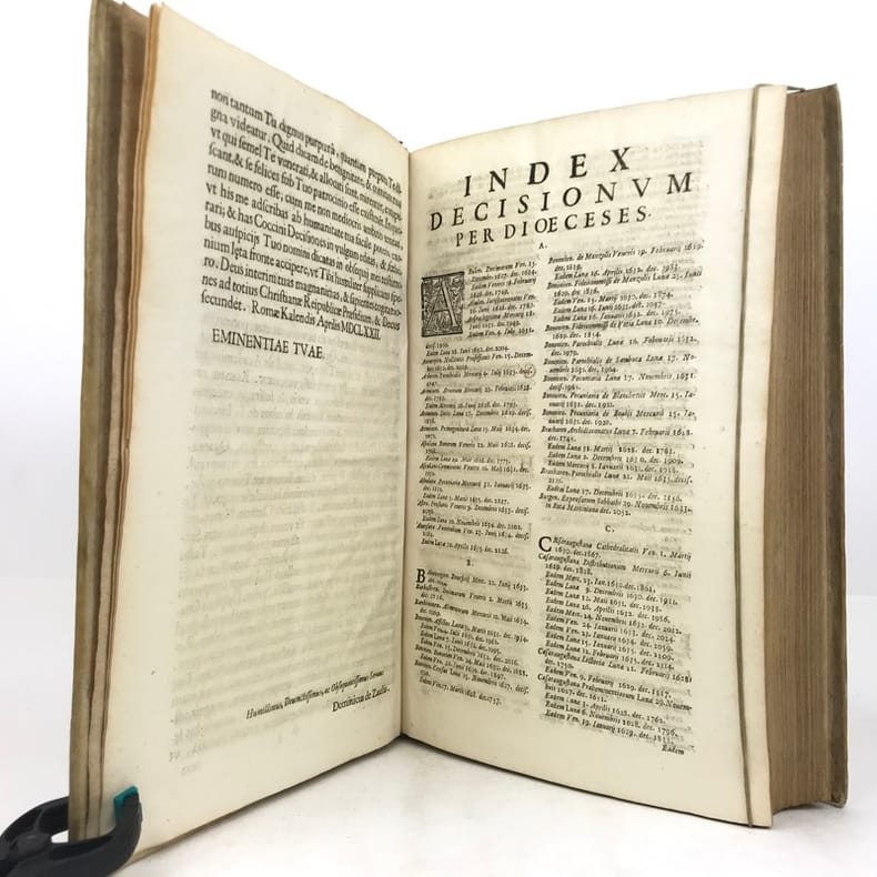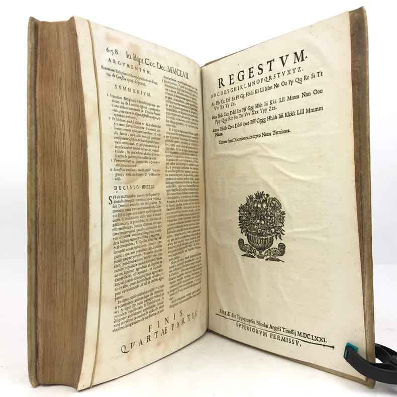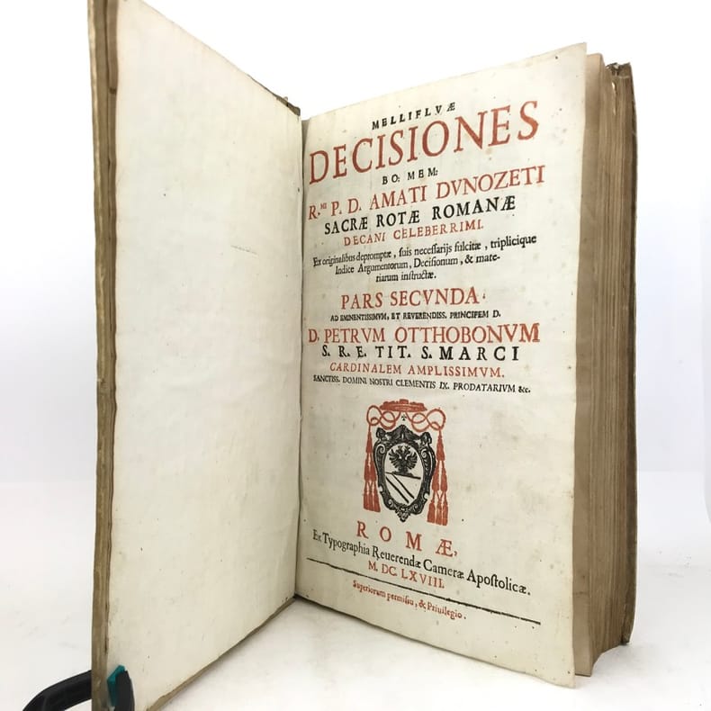Ensemble de 3 volumes in-folio (33,5 cm x 23 cm), vélin (reliure de l’époque), dos à nerfs, lettres noires au dos, titre à l’encre noire et rouge, ex-libris manuscrit sur la première garde, texte sur deux colonnes en latin, [10]-499-1 bl.-[250] ; [2]-xxvi-769 ; [22]-658-[1]-1 bl; pages (complet en soi). Signatures : a4, a6, A-Z6, Aa-Ss6, Tt4, Vv-Zz6, Aaa-Rrr6 ; a2, a-f2, g1, A-Z4, Aa-Zz4, Aaa-Zzz4, Aaaa-Zzzz4, Aaaaa-Bbbbb4, Ccccc6 ; $, a-d4, A-Z4, Aa-Zz4, Aaa-Zzz4, Aaaa-Mmmm4, Nnnn6. Frottements, épidermures, coiffes découvertes, manque de cuir aux dos, mors fendus (sur la longueur), déchirures marginales, quelques feuillets brunis, rousseurs éparses. État correct tout de même. Nouvelles éditions de décisions de la rote romaine, plus haut tribunal civil de la papauté. Cet ensemble se compose du tome II des Mellifluæ Decisiones de Dunozetus, du tome III des Sacræ rotæ romanæ decisiones de Falconerius, et du tome IV des Decisionum S. rotæ romanæ de Coccinus. Ces ouvrages sont des index ou plutôt des séries d’index des décisions de la rote romaine. On a tout d’abord un index des auteurs qui ont publié des recueils de décisions de la rote (plus d’une centaine sont citées) puis un catalogues des auditeurs de la rote dont les décisions sont répertoriées, classées par nom, par cité, par époque, on trouve ensuite un index par matière puis enfin une table des décisions elles-mêmes classées par diocèse et à l’intérieur de chaque diocèse par matière ; il s'agit d'un outil indispensable pour accéder à ces collections de décisions parfois très lourdes. Agréable exemplaire.