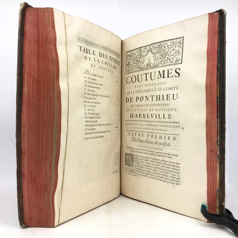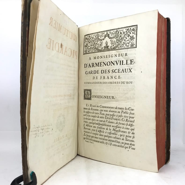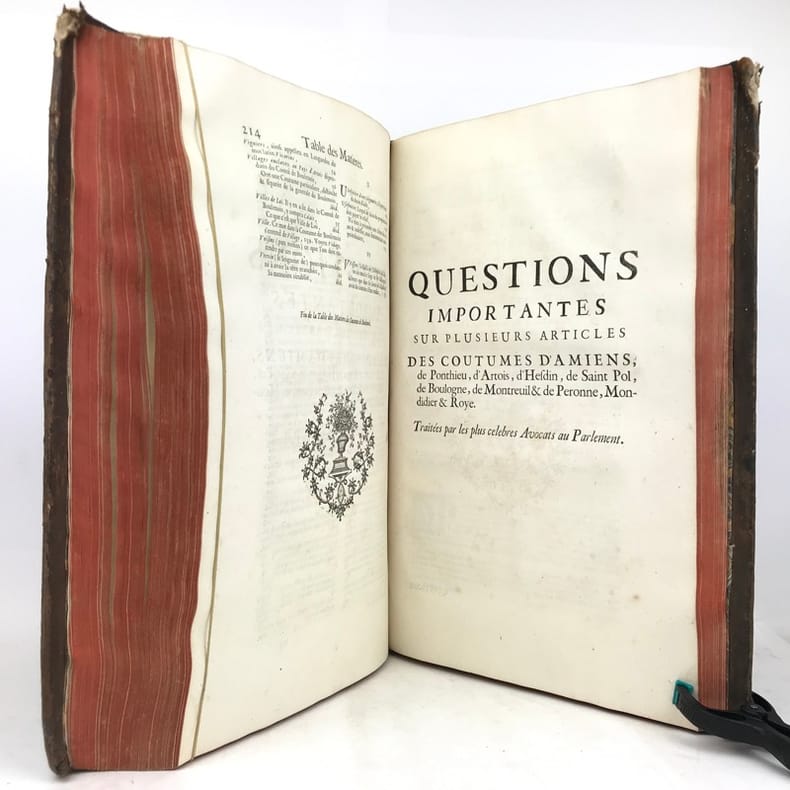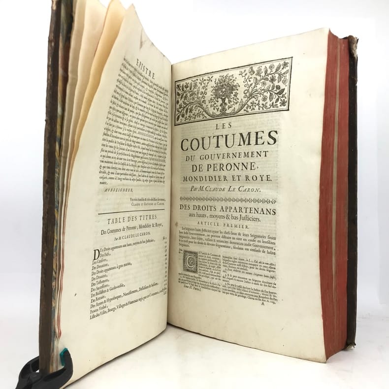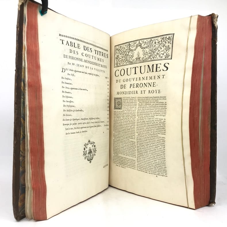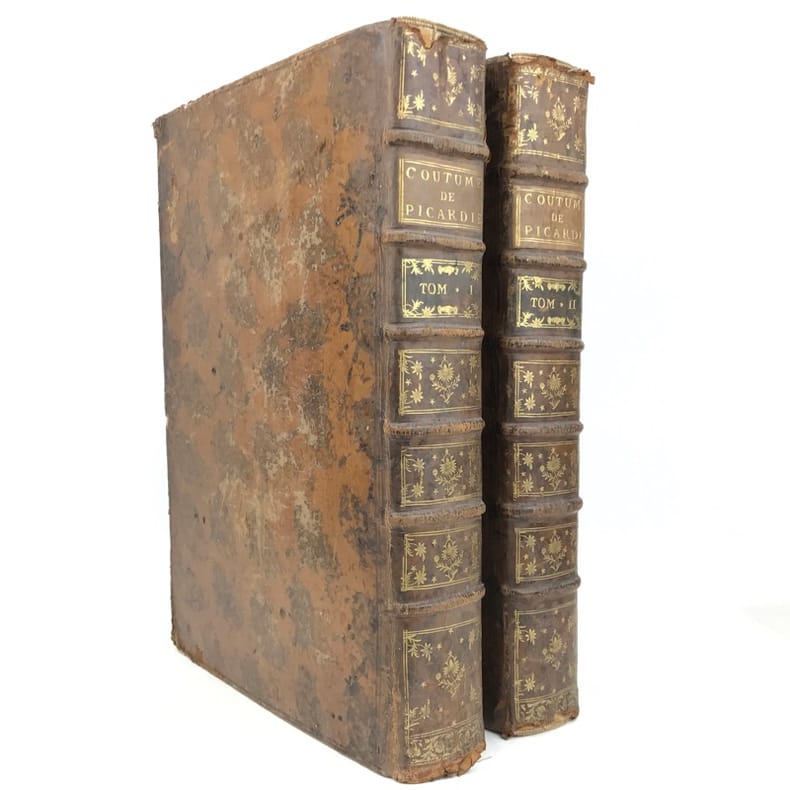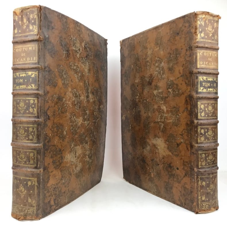 2 volumes in-folio (39 cm x 26 cm), veau brun marbré (reliure de l’époque), dos à nerfs orné, pièce de titre fauve, tranches rouges, titre à l’encre noire et rouge, annotations, texte sur deux colonnes, [10]-678-1 bl.-[84]-454-1 bl.-[28]-295-[14]-233-[1] ; [8]-170-[6]-274-[4]-108-20-214-[2]-204 pages (complet) . Frottements à la reliure, coiffes découvertes, mors fendu (5cm), coins émoussés, quelques feuillets brunis, claires rousseurs. État correct. Nouvelle édition, la plus complète des coutumes de Picardie, établie par Pierre Babel. Contenant les commentaires de Heu, de Dufresne et de Ricard sur les coutumes d'Amiens ; de Gosset sur celle de Ponthieu ; de Le Caron sur Péronne, Mondidier et Roye ; de La Villette, nouveau commentaire sur les mêmes coutumes ; de Dubours sur Montreuil-sur-mer ; de Le Roy de Lozembrune, nouveau commentaire sur celle de Boulenois et l'histoire abrégée de la ville de Boulogne et de ses comtes... Agréable exemplaire.