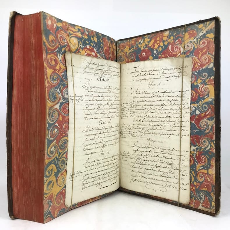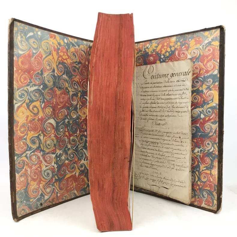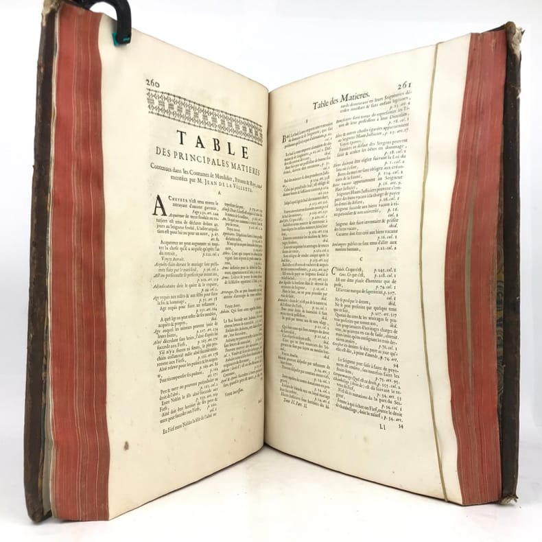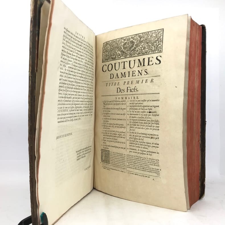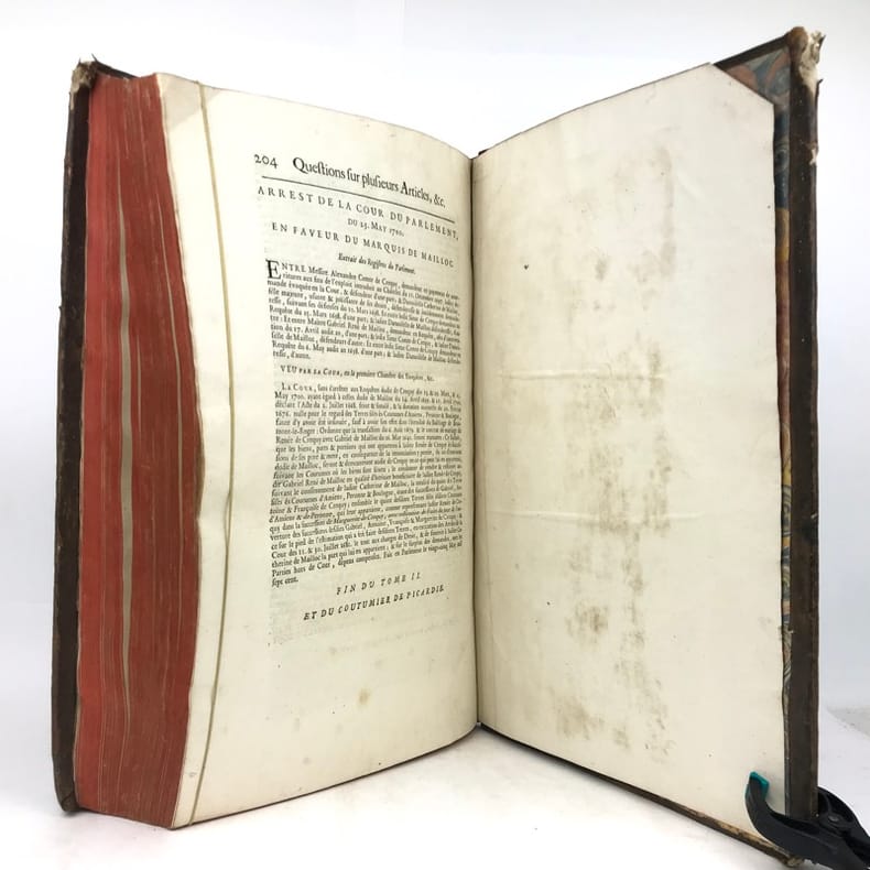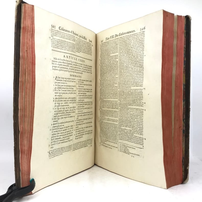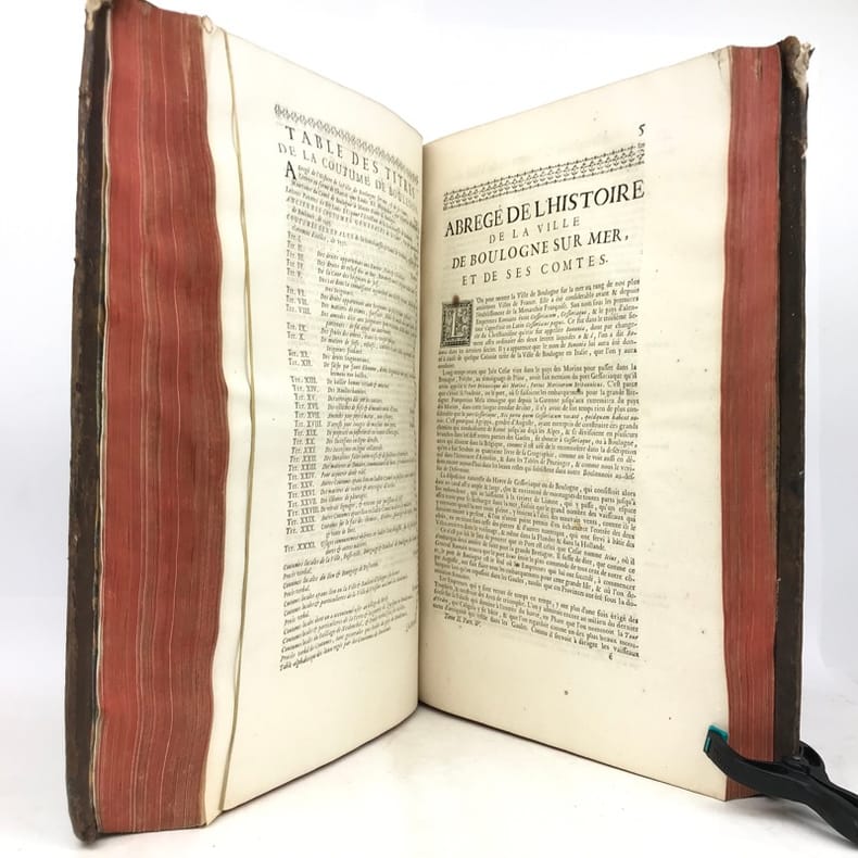 2 volumes in-folio (39 cm x 26 cm), veau brun marbré (reliure de l’époque), dos à nerfs orné, pièce de titre fauve, tranches rouges, titre à l’encre noire et rouge, annotations, texte sur deux colonnes, [10]-678-1 bl.-[84]-454-1 bl.-[28]-295-[14]-233-[1] ; [8]-170-[6]-274-[4]-108-20-214-[2]-204 pages (complet) . Frottements à la reliure, coiffes découvertes, mors fendu (5cm), coins émoussés, quelques feuillets brunis, claires rousseurs. État correct. Nouvelle édition, la plus complète des coutumes de Picardie, établie par Pierre Babel. Contenant les commentaires de Heu, de Dufresne et de Ricard sur les coutumes d'Amiens ; de Gosset sur celle de Ponthieu ; de Le Caron sur Péronne, Mondidier et Roye ; de La Villette, nouveau commentaire sur les mêmes coutumes ; de Dubours sur Montreuil-sur-mer ; de Le Roy de Lozembrune, nouveau commentaire sur celle de Boulenois et l'histoire abrégée de la ville de Boulogne et de ses comtes... Agréable exemplaire.