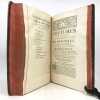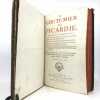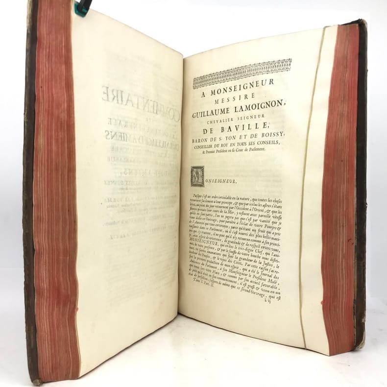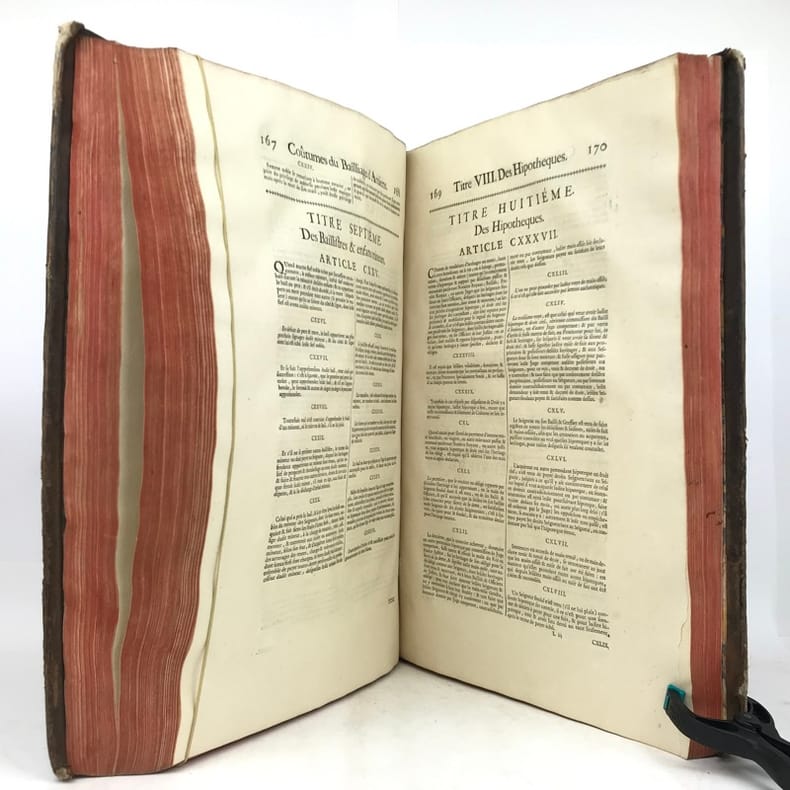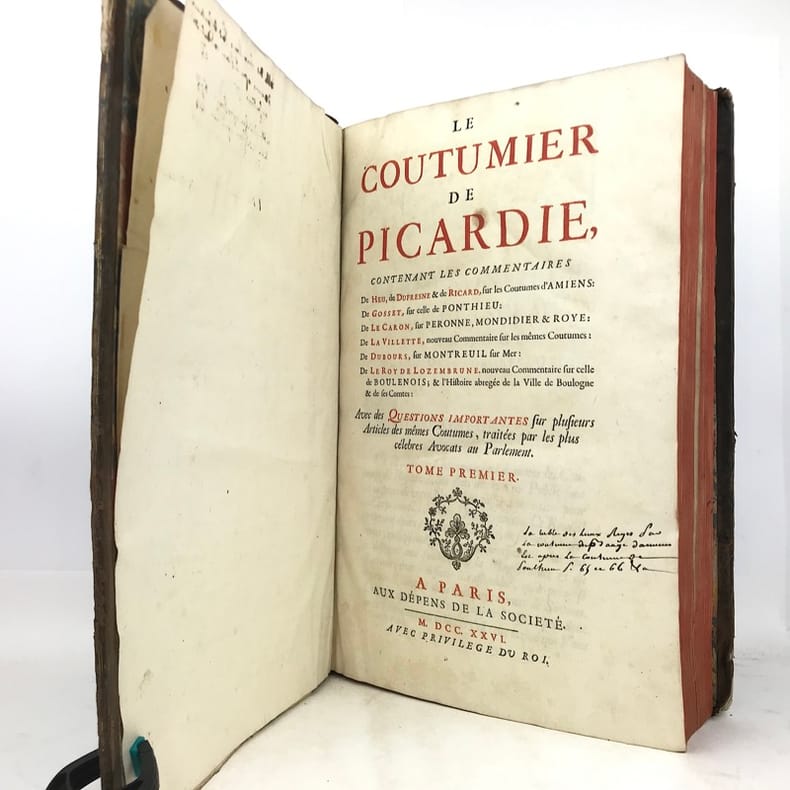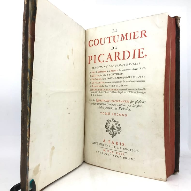 LE COUTUMIER DE PICARDIE Recueil des commentateurs anciens et modernes sur les coutumes générales et particuliers de France avec leurs textes corrigez. Tome premier. In folio plein cuir havane raciné à nerfs, pièces de titre et tomaison chagrin rouge. Roulette, caissons dorés. Roulette dorée sur coupes. LE COUTUMIER DE PICARDIE contenant les commentaires de HEU, de DUFRESNE , de RICARD, dur les coutumes d’Amiens, de GOSSET sur celle de PONTHIEU, de LE CARON sur Peronne, MONDIDIER & ROYE, de LA VILETTE nouveau commentaire sur les mêmes coutumes de DUBOURS sur Montreuil-sur-Mer, de LE ROY de LOZEMBRUNE nouveau commentaire sur celle de BOULENOIS & l’histoire abrégée de la ville de Boulogne et de ses Comtés.(par le père LE QUIEN) avec des questions importantes sur plusieurs articles des mêmes coutumes, traitées par les plus célèbres avocats au Parlement. A Paris aux dépens de la Société 1726. Texte sur 2 colonnes paginées. 2 feuillets épitre et avertissement. Tome 1er Première partie : le coutumier du baillage d’Amiens, titre, épitre, 336 pages (texte sur 2 colonnes, paginées 1 à 678) 74 pages de table des matières. Commentaire sur les coutumes générales du baillage d’Amiens et sur la coutume locale de la ville prévôté et banlieue dudit Amiens où sont rapportez les arrests donnez sur l’interprétation d’icelle depuis cinquante et plus. Avec une explication par forme de conférence de plusieurs articles, des coutumes de PONTHIEU, PERONNE & ARTOIS voisins, qui sont aussi pays de nantissement par Jean DUFRESNE avocat à la cour. Tome deuxième partie Titre, IV, 454 pages (texte sur 2 colonnes paginées, 1 à 454) (227 pages) et 24 pages de table. Coutumes du Baillage d’Amiens tant générales que locales et particulières avec des notes de maître Carles DUMOULIN et autres remarques particulières de M. jean Marie RICARD avocat au Parlement. Augmentées de plusieurs autre nouvelles remarques. Tome premier troisième partie : titre, préface, 296 pages –texte sur 2 colonnes paginées ; en fait 148 pages) 10 pages de table. Coutumes générales de la Sénéchaussée et Comté de PONTHIEU, que locales et particulières de la ville et banlieue d’Abbeville : avec les sommaires de chacun article rapport & conférence des uns avec les autres, et quelques notes & remarques sur aucun d’iceux par J. GOSSET. Tome premier quatrième partie Titre, avis au lecteur, table des titres de la coutume, questions importantes sur plusieurs articles des coutumes d’Amiens, d’Artois etc. Texte sur 1 pages ( et non plus sur 2 colonnes) 233 pages, 1 page approbation et privilège. A Paris aux dépens de la Société 1726. . Edition donnée par Pierre BABEL, car elle est la plus complète. Mouillures importantes jusqu’à la fin de la première partie, mouillure plus légère en fin de volume, en marge extérieure. Pages de la fin de quatrième partie avec des mouillures. Deux coins émoussés, quelque petits manques de cuir dont coiffe supérieure en partie manquante. Cependant ouvrage solide, et très lisible. Dans l’état (voir les photos)