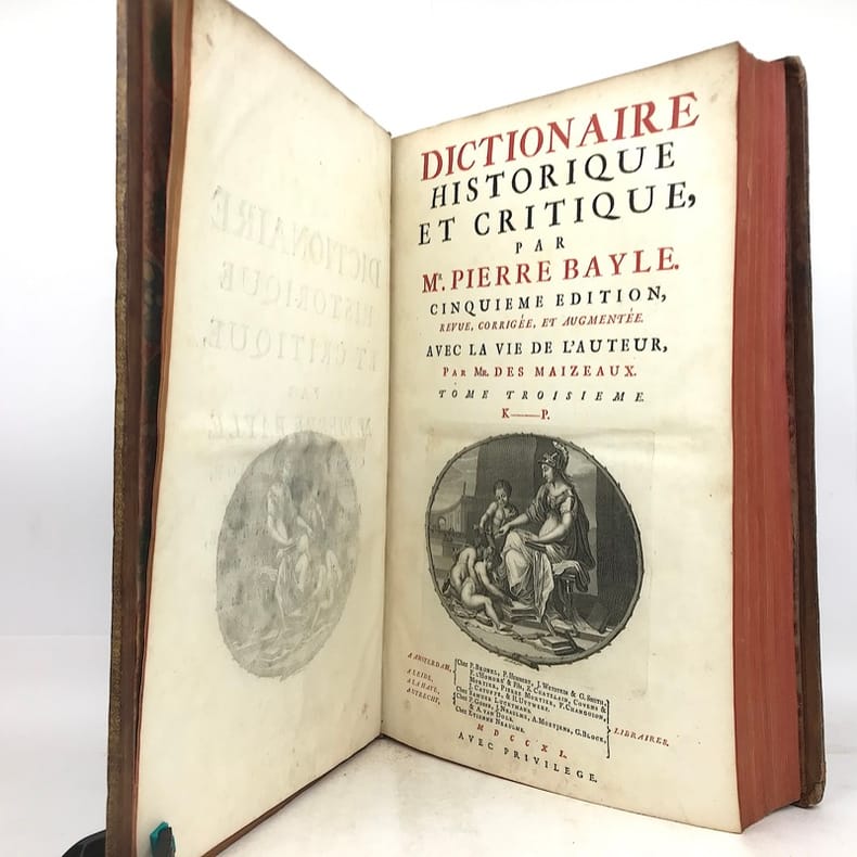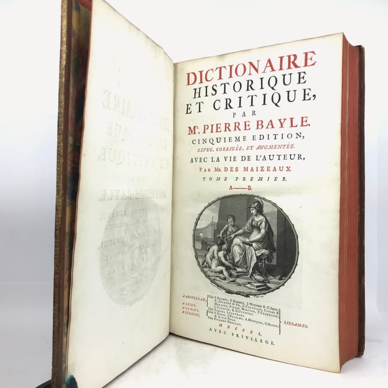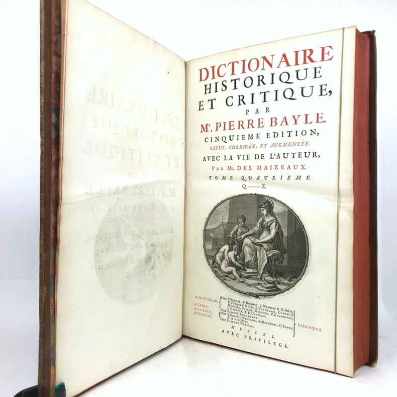 In this fifth Amsterdam-edition is found at the end of each volume the critical remarques of l'abbe Le Clerc. ""For over half a century, until the publication of the ""Encyclopédie"", Bayle's ""Dictionnaire"" dominated enlightened thinking in every part of Europe."" (PMM: 155, the first edition published 1695).Pierre Bayle's Dictionnaire historique et critique stands as the supreme achievement of one of the seventeenth century's most prominent men of letters. Based in Rotterdam, Bayle animated intellectual discussion in Europe through his work as editor and author and as a prolific correspondant. Originally conceived as a response to the errors in Louis Moréri's Grand dictionnaire historique, his Dictionnaire historique et critique grew to be an exemplary work of critical methodology. The author painstakingly compiled, compared, questioned, seeking some degree of historical certainty, however small. The Bayle Dictionnaire has been called the ""Arsenal of the Enlightenment"", pillaged and re-edited throughout the eighteenth century by believers and sceptics alike who gathered ammunition for philosophical argument in the work's recondite notes.