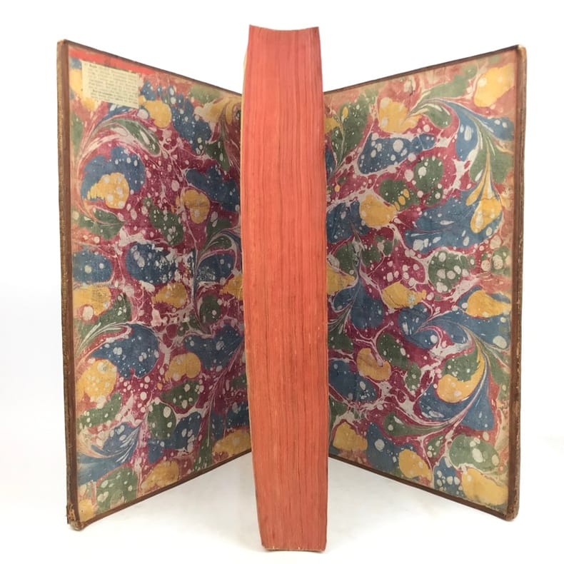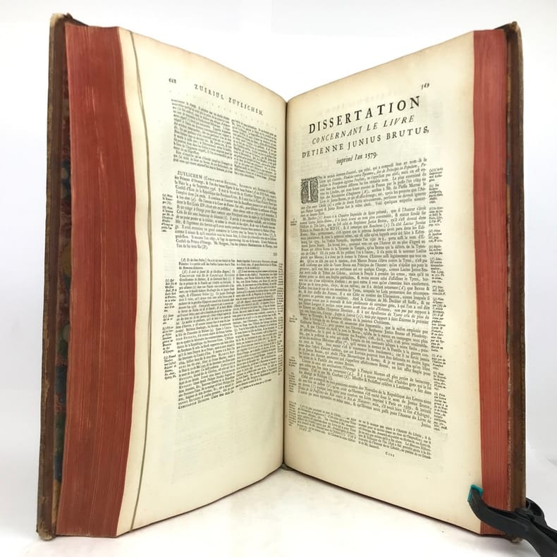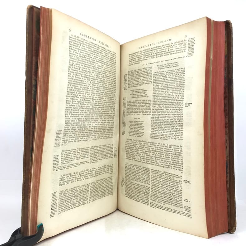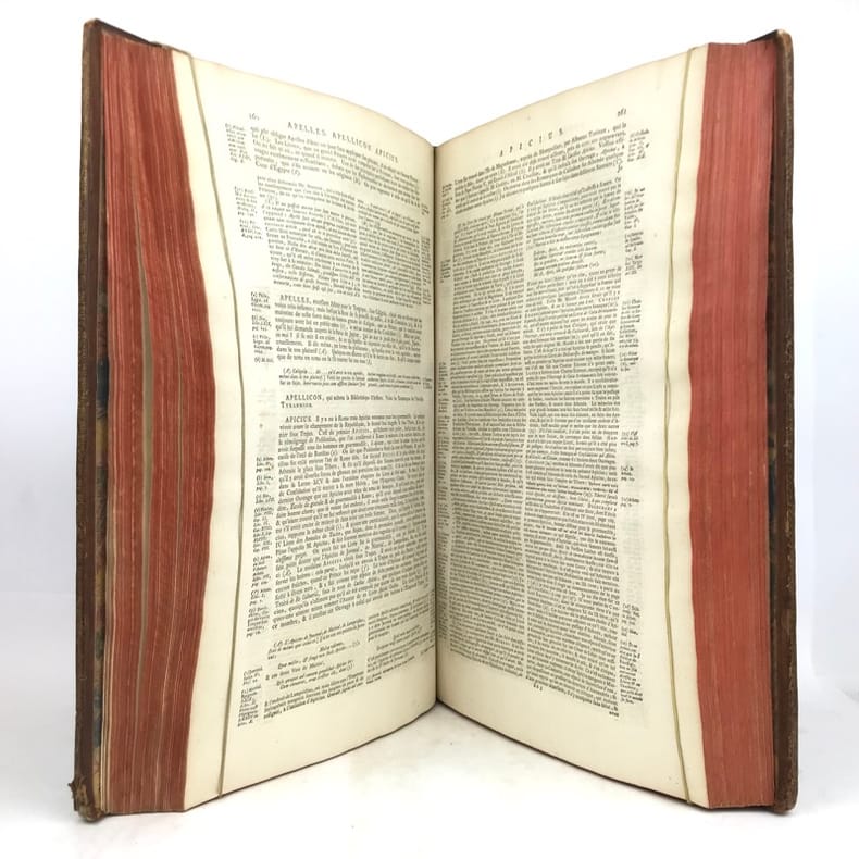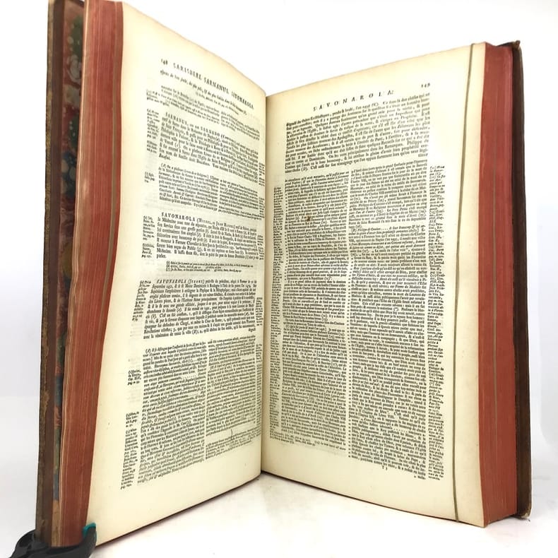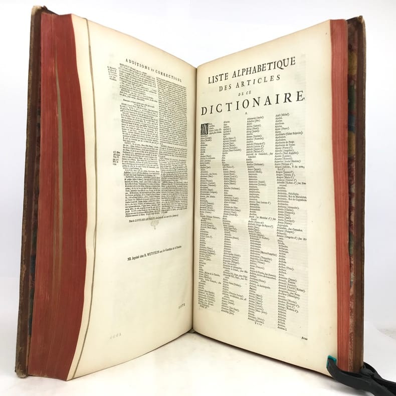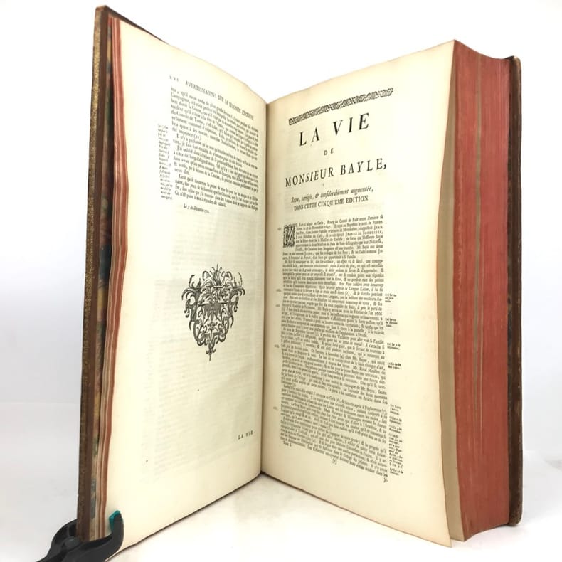 4 volumes in-folio (40 x 25,5 cm), veau blond (reliure de l’époque), dos à nerfs orné, pièces de titre et de tomaison en maroquin grenat, triple filet à froid encadrant les plats, roulette dorée sur les coupes, tranches rouges, [16]-cxx-719-[1] ; [4]-915-[1] ; [4]-831-[1] ; [4]-804 pages (complet). Coins usés, mors fendus, taches sur les plats, coiffe du tome IV découverte avec tranchefile quasi détachée, quelques rousseurs éparses. État correct. À noter : feuillets Mmmm2 et Mmmm3 inversés au tome I. Nouvelle édition, la cinquième, de cet imposant dictionnaire. Elle comprend l’inscription manuscrite suivante sur le contreplat du tome I : “Cet ouvrage a été condamné par des décrets du 22 décembre 1700 et du 12 mars 1703.” Rédigé par Pierre Bayle (1647-1706), philosophe et auteur français, il a pour ambition de rivaliser - voire de corriger - le célèbre dictionnaire de Louis Moréri, publié pour la première fois en 1674. Bayle y mêle différents articles historiques, mais aussi anecdotiques, qu’il enrichit richement de commentaires et de notes critiques issues de ses propres réflexions. Bon exemplaire.