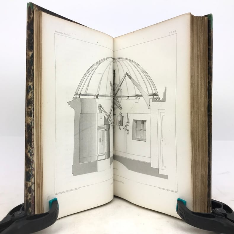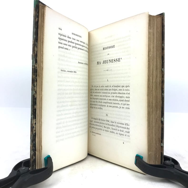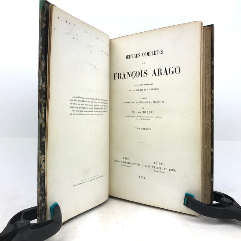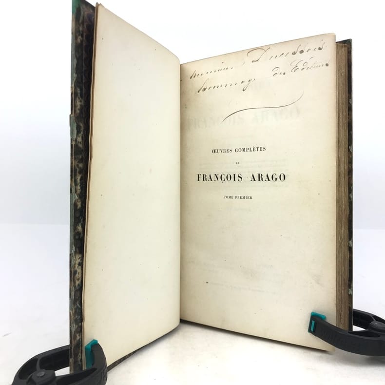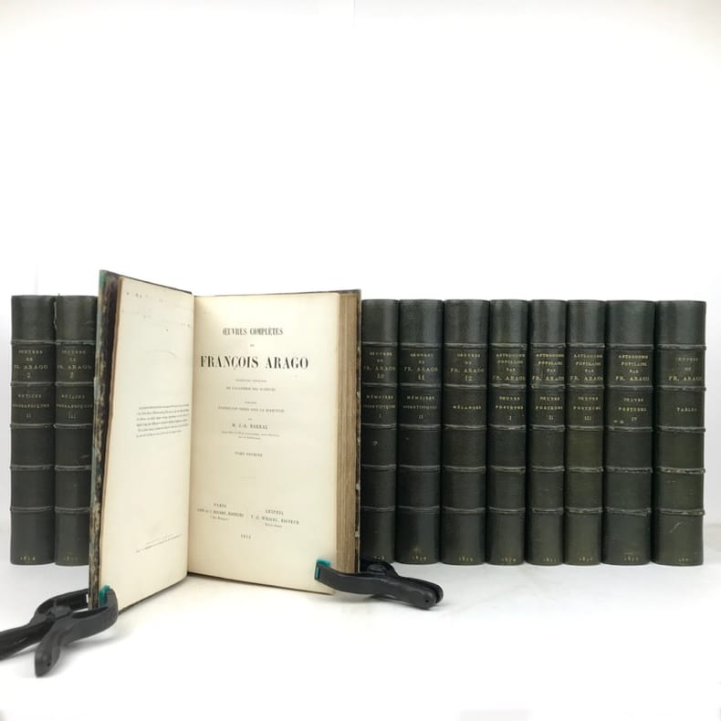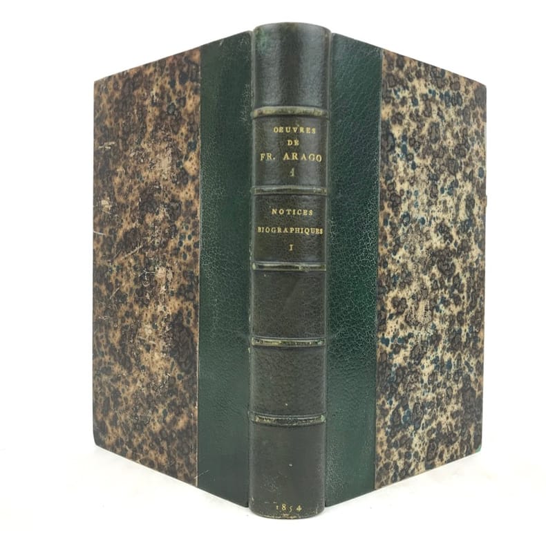 17 volumes in-8 (22 cm x 13 cm), demi-maroquin vert (reliure de l’époque signée Thibaron), dos à nerfs, tête dorée, envoi de l’éditeur sur la page de faux-titre à Decessois, vraisemblablement imprimeur parisien. [8]-xxxii-638 ; [8]-703-1 bl. ; [8]-628 ; [4]-iv-[4]-715-1 bl. ; [8]-671-[1] ; [8]-705-[1] ; [8]-610 ; [8]-658 ; [8]-644 ; [8]-602 ; [4]-756 ; [8]-740 ; [4]-xii-559-1 bl. ; [4]-554 ; [4]-635-1 bl. ; [4]-854-[2] ; [4]-cclxiii-[1]-646-[1]-1 bl. pages (complet). Quelques mouillures. Bon état. Première édition collective illustrée d’un frontispice, de 24 gravures hors-texte ainsi que de nombreuses in-texte. François Arago est un astronome, physicien et homme politique français (1786-1853). Connu notamment pour sa participation à la mesure de l’arc du méridien terrestre en Espagne, il fut professeur à l’École polytechnique, puis directeur de l’Observatoire de Paris. Par ses contributions à la physique et à l'astronomie, ainsi que par ses talents d'organisateur et de vulgarisateur, François Arago a fortement marqué de son empreinte le développement scientifique du xixe siècle. Il fut aussi une figure de la politique, aux convictions républicaines affichées, qui milita pour le progrès technique et le progrès social. Agréable exemplaire.