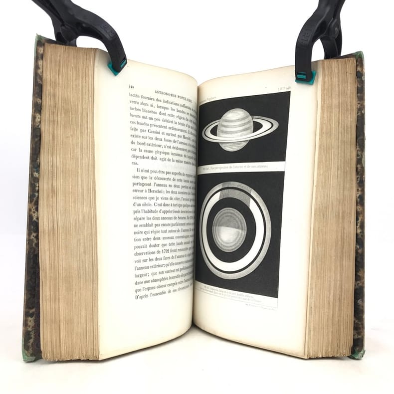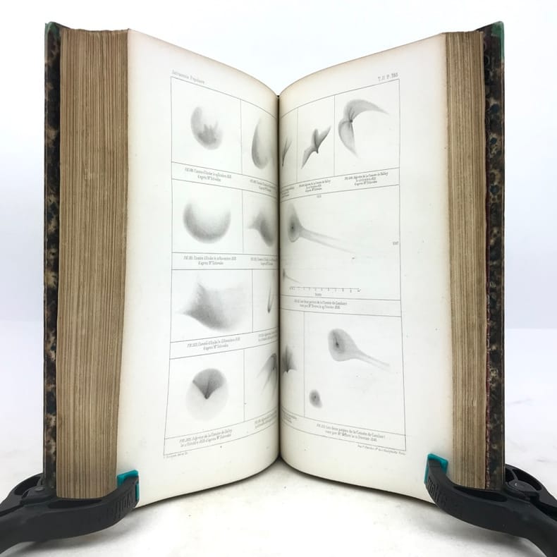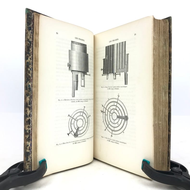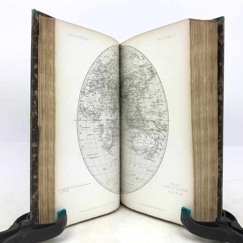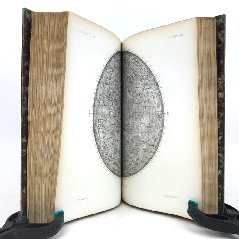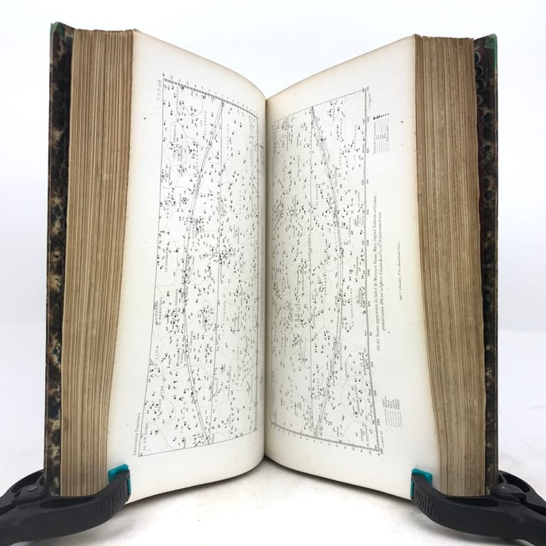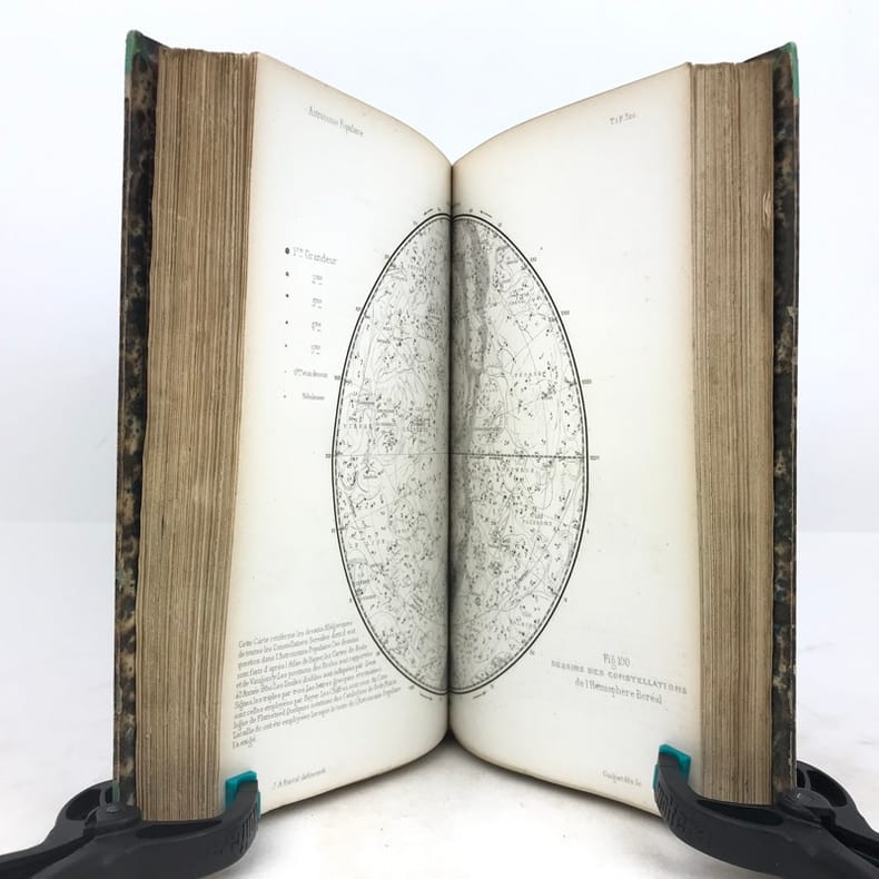 17 volumes in-8 (22 cm x 13 cm), demi-maroquin vert (reliure de l’époque signée Thibaron), dos à nerfs, tête dorée, envoi de l’éditeur sur la page de faux-titre à Decessois, vraisemblablement imprimeur parisien. [8]-xxxii-638 ; [8]-703-1 bl. ; [8]-628 ; [4]-iv-[4]-715-1 bl. ; [8]-671-[1] ; [8]-705-[1] ; [8]-610 ; [8]-658 ; [8]-644 ; [8]-602 ; [4]-756 ; [8]-740 ; [4]-xii-559-1 bl. ; [4]-554 ; [4]-635-1 bl. ; [4]-854-[2] ; [4]-cclxiii-[1]-646-[1]-1 bl. pages (complet). Quelques mouillures. Bon état. Première édition collective illustrée d’un frontispice, de 24 gravures hors-texte ainsi que de nombreuses in-texte. François Arago est un astronome, physicien et homme politique français (1786-1853). Connu notamment pour sa participation à la mesure de l’arc du méridien terrestre en Espagne, il fut professeur à l’École polytechnique, puis directeur de l’Observatoire de Paris. Par ses contributions à la physique et à l'astronomie, ainsi que par ses talents d'organisateur et de vulgarisateur, François Arago a fortement marqué de son empreinte le développement scientifique du xixe siècle. Il fut aussi une figure de la politique, aux convictions républicaines affichées, qui milita pour le progrès technique et le progrès social. Agréable exemplaire.