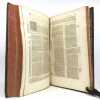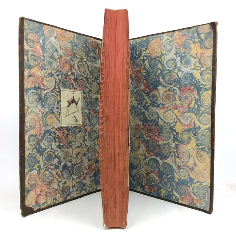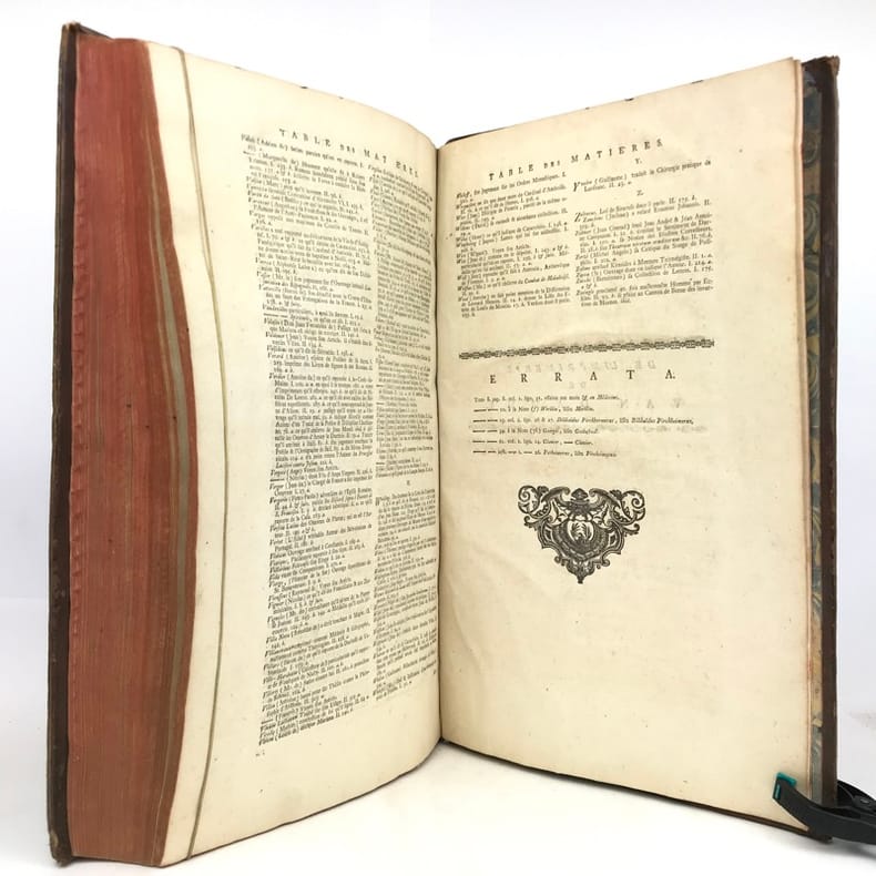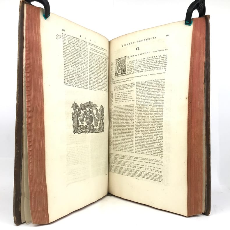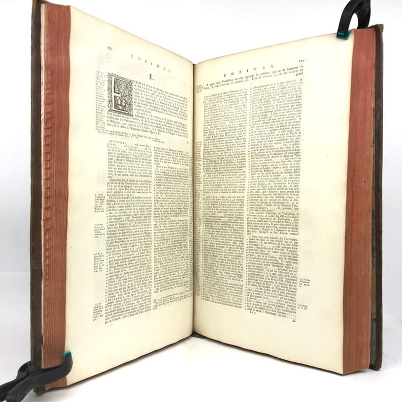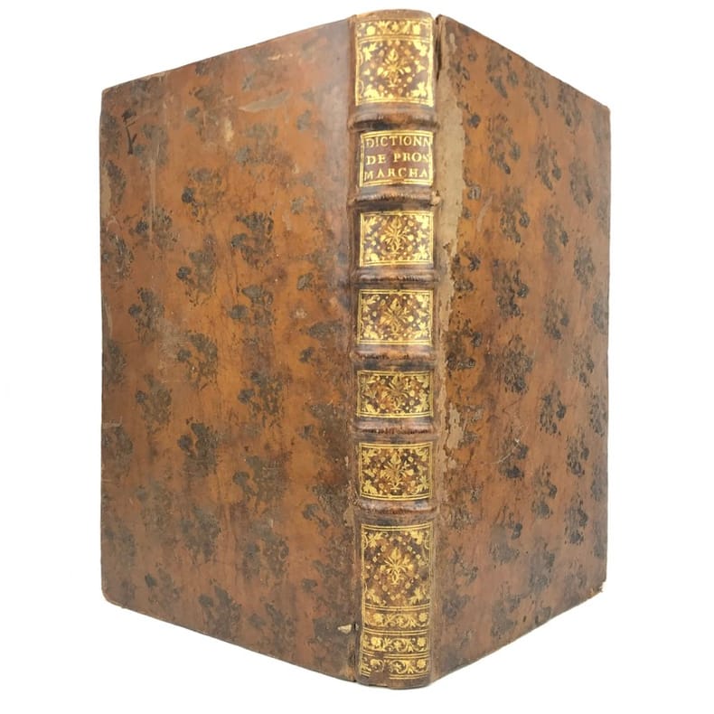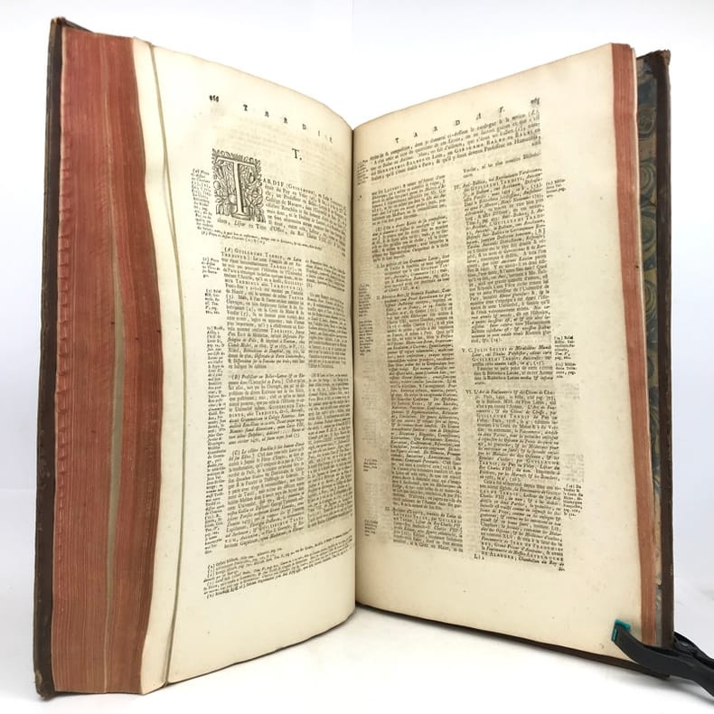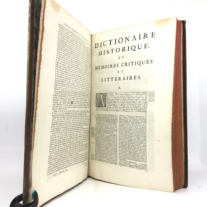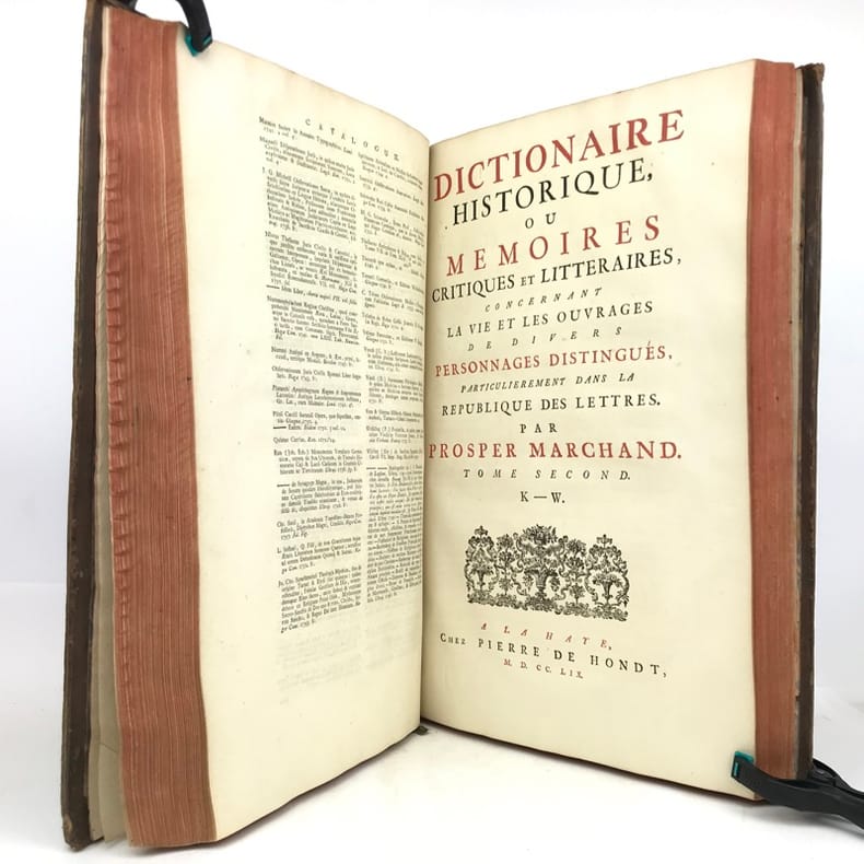 2 tomes en 1 volume in-folio (40,5 cm x 25,5 cm), veau brun (reliure de l’époque), dos à nerfs, tranches rouges, titre à l’encre rouge et noire, ex-libris de Jacques Laget contrecollé sur le contreplat, texte sur deux colonnes, [8]-330-[10]-328-[28] pages (complet). Frottements à la reliure, coiffes accidentées, 1 mors fendu (5 cm), manque de cuir à un nerfs, coins abîmés, quelques mouillures. Nouvelle édition du Dictionnaire historique commencé par Bayle, illustrée d’une planche hors-texte, ainsi que de quelques vignettes. Décédé à Rotterdam en 1706, Pierre Bayle, auteur du Dictionnaire historique, lègue des ébauches d’articles rédigés pour un futur supplément à son éditeur Reinier Leers ; lequel les cède aux libraires imprimeurs de Rotterdam, Fritsch et Bohm. En 1714, ces derniers confient l’élaboration d’une nouvelle édition enrichie de l’œuvre de Bayle à Prosper Marchand. Cet ancien libraire est un bibliophile reconnu ainsi qu’un correspondant de Nouvelles de la République des lettres, le journal créé par Bayle. Installé à La Haye, il se consacre à l’écriture, engageant ponctuellement sa plume et son expérience dans différentes entreprises éditoriales. La tâche qui lui est confiée par Fritsch et Bohm s’avéra très ardue. En effet, Bayle, qui ne reproduisait pas in extenso les citations reprises dans ses notes, se contentait d’indiquer les références des ouvrages de sa propre bibliothèque. Certains livres ayant disparu, Marchand ne fut pas en mesure de combler toutes les lacunes, qui seront alors signalées par la mention “Articles omis”. La reprise d’un texte incomplet incitera plus tard les critiques à soupçonner l’écrivain d’avoir amendé, voire inventé, le contenu de certains articles de Bayle. Après six années de travail acharné, la troisième édition du Dictionnaire historique et critique voit le jour en 1720, mais la plupart des critiques le considéreront avec réserve et circonspection, malgré les efforts déployés par son auteur. Agréable exemplaire.