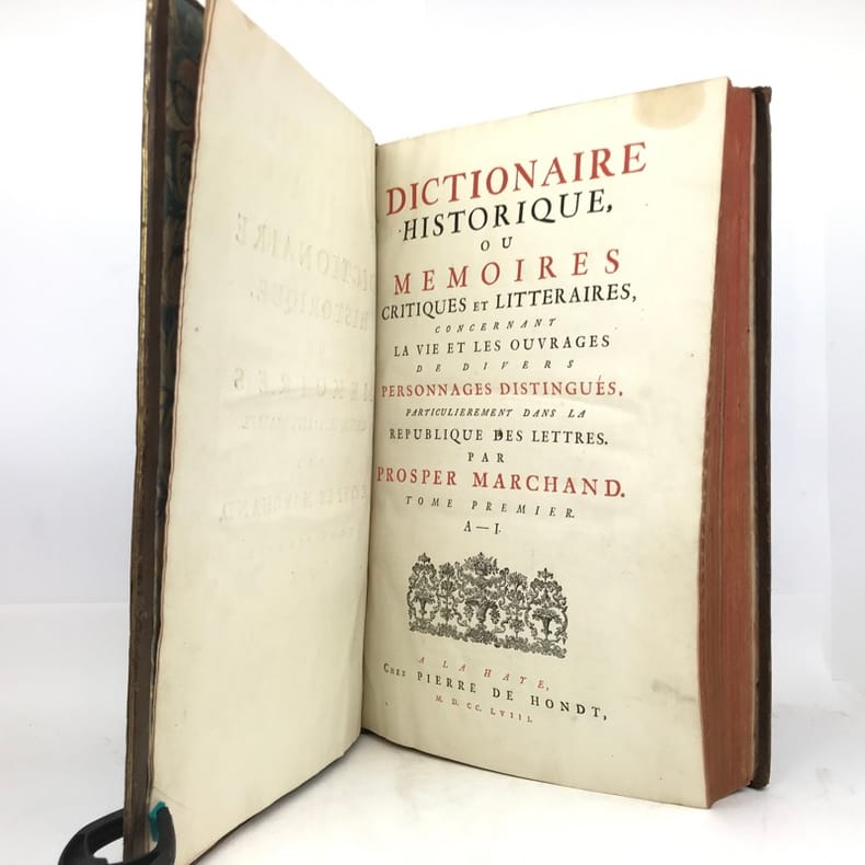 Edition originale et unique de ce dictionnaire critique rédigé par le bibliographe et libraire Prosper Marchand dans l'esprit du Dictionnaire de Bayle dont il peut servir de complément. Agréable exemplaire. Quérard V, 510.