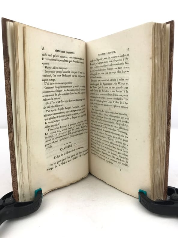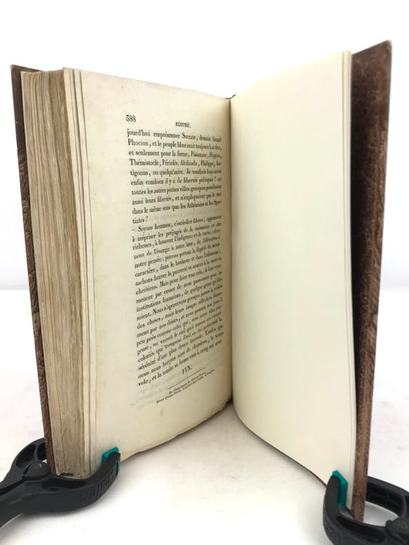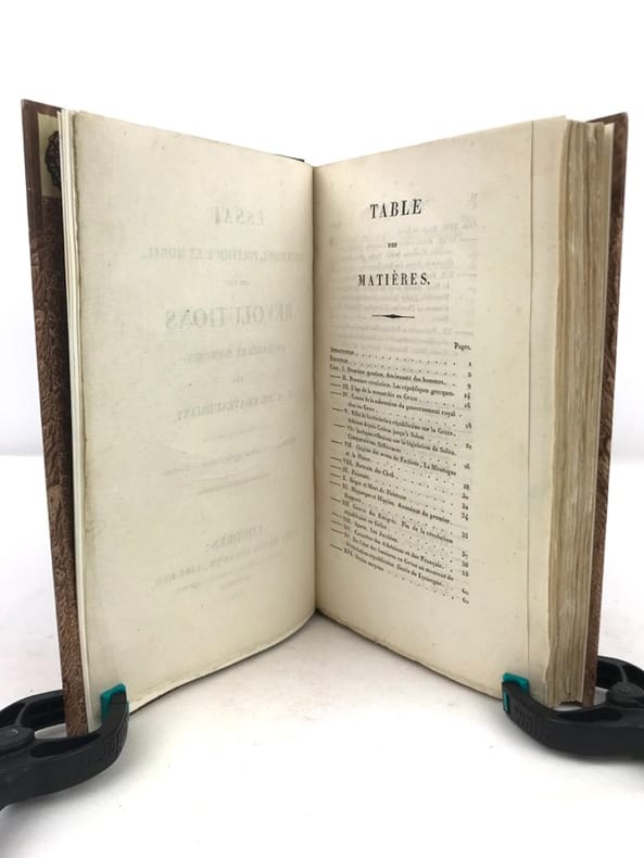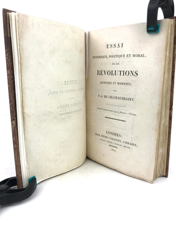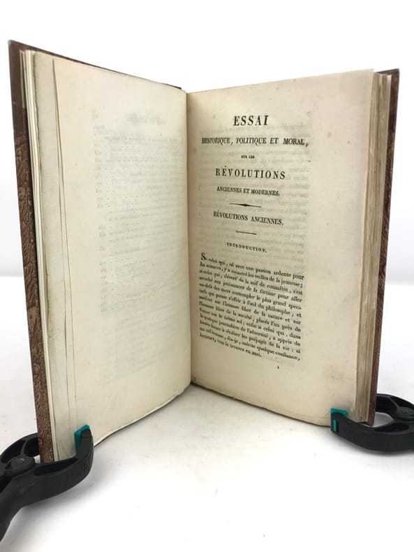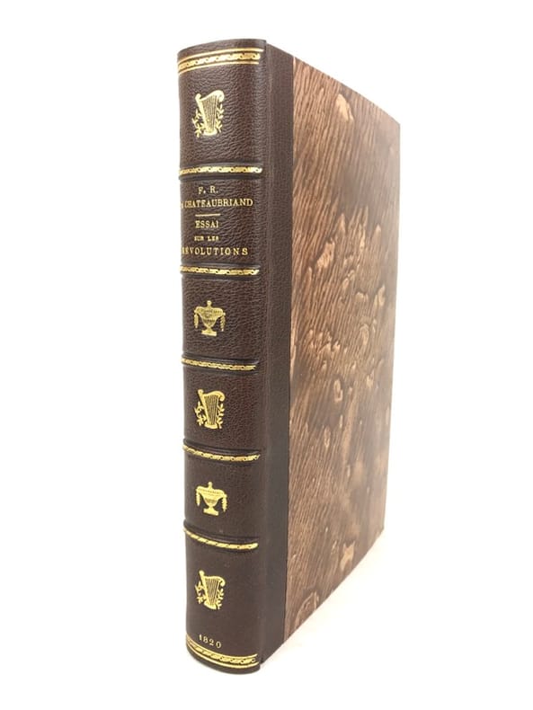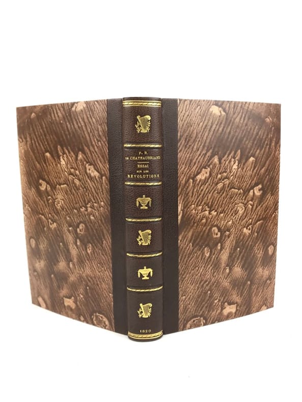 1 volume in-8, non rogné (21 x 13 cm), demi-maroquin brun (reliure moderne), dos à nerfs orné de filets, roulettes et de fleurons dorés, ex-libris contrecollé sur le contre plat de l’Abbaye Ste Marie de Maumont. vii-1bl.-388 pages (complet). Quelques pâles rousseurs éparses, mouillures et salissures marginales à quelques feuillets, parfois avec atteinte au texte sans gêne de lecture. Bon état. Nouvelle édition de cet essai publié pour la première fois en 1797. François-René, vicomte de Chateaubriand (1768-1848) écrivain, mémorialiste et homme politique français. Il est considéré comme l'un des précurseurs et pionniers du romantisme français et l'un des grands noms de la littérature française. Exemplaire portant la coquille : Chateaubriant sur le titre. Bel exemplaire.