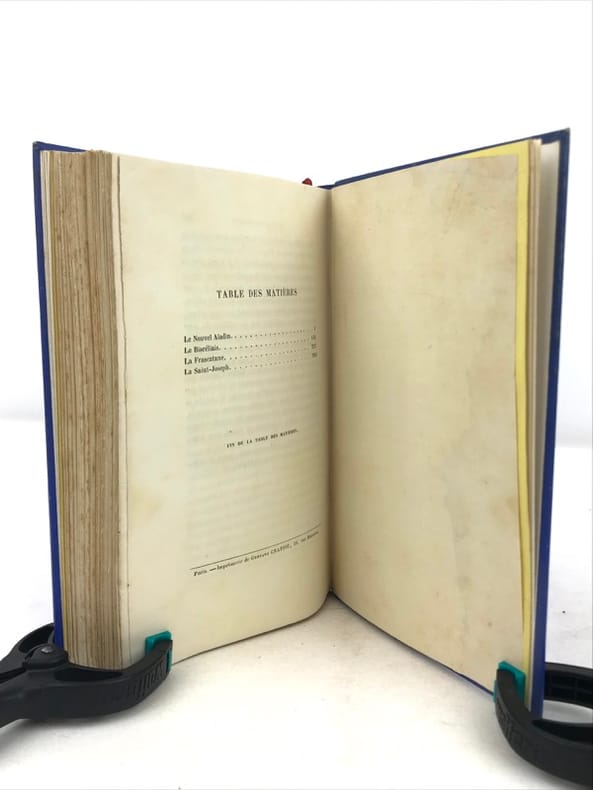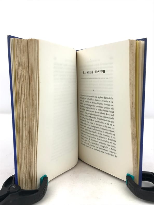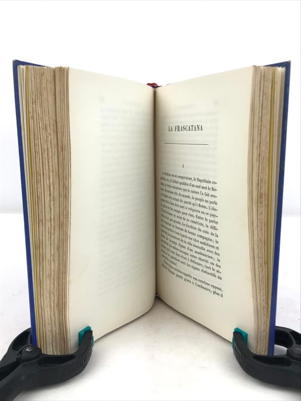 Paris, Charpentier, , Paris, Charpentier, 1853 ; in-12, , demi-chagrin vert, nerfs, caissons et beau décor doré aux petits fers, tranches jaspées (Reliure de l’époque). - 2 ff., 343 pp., (1p.). - « Venise a toujours été le pays des histoires merveilleuses ; en voici une qui me fut racontée dans un café de la place Saint-Marc, par un de ces rôdeurs nocturnes… » Histoire vénitienne donc pour le premier récit (p. 1 à 129) - Le deuxième récit est napolitain, le troisième romain et, avec le dernier, on retrouve Naples. Bel exemplaire, bien relié à l’époque. Dos très légèrement passé. Ex-libris de la Bibliothèque de Belay (XIXe s.)."