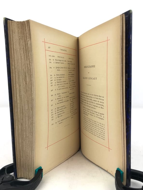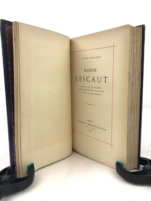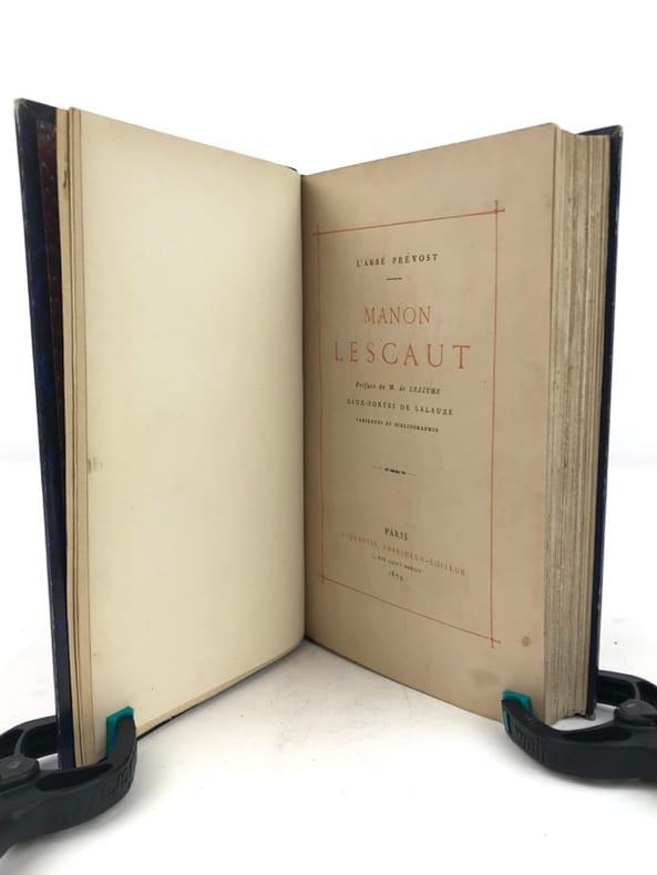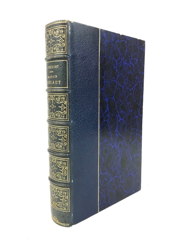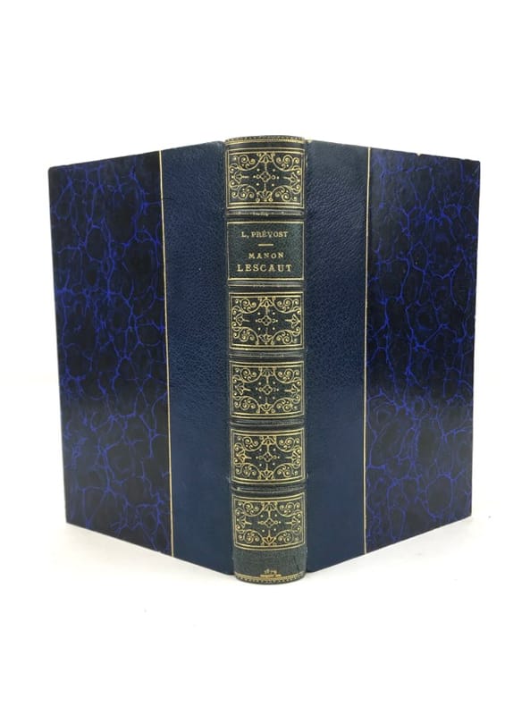 1 volume in-8 (20,5 cm x 12 cm), demi-maroquin bleu (reliure de l’époque signée Becquet), dos à nerfs orné, couverture conservée, texte encadré d’un filet rouge. [6]-365-[3] pages (complet). Frottements à la reliure, rousseurs aux gardes. État très correct. Nouvelle édition illustrée de deux portraits de l’auteur en frontispice, ainsi que de 13 planches hors-texte à l’eau-forte de Lalauze. L’Histoire de Manon Lescaut fait partie d’un ensemble plus vaste, Mémoires et aventures d’un homme de qualité. Des Grieux raconte comment la rencontre de Manon Lescaut a brisé son existence. Alors qu’il se destinait à devenir prêtre, un coup de foudre lui fait renoncer à tout : honneur, fortune, rang social. Pour elle, il va désobéir à son père, renier ses amis et connaître une totale déchéance. Manon est déportée en Louisiane pour ses mauvaises mœurs. Des Grieux va la suivre dans le Nouveau Monde… Ce roman est jugé immoral et frappé par la censure. Les deux jeunes héros, dont la passion amoureuse enfreint toutes les conventions et ruine leurs vies, apparaissent comme les victimes d’une société. Bel exemplaire.