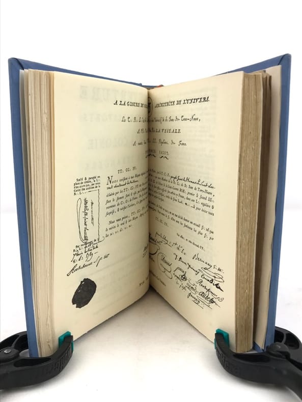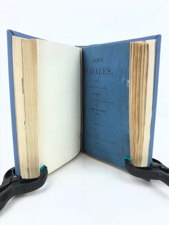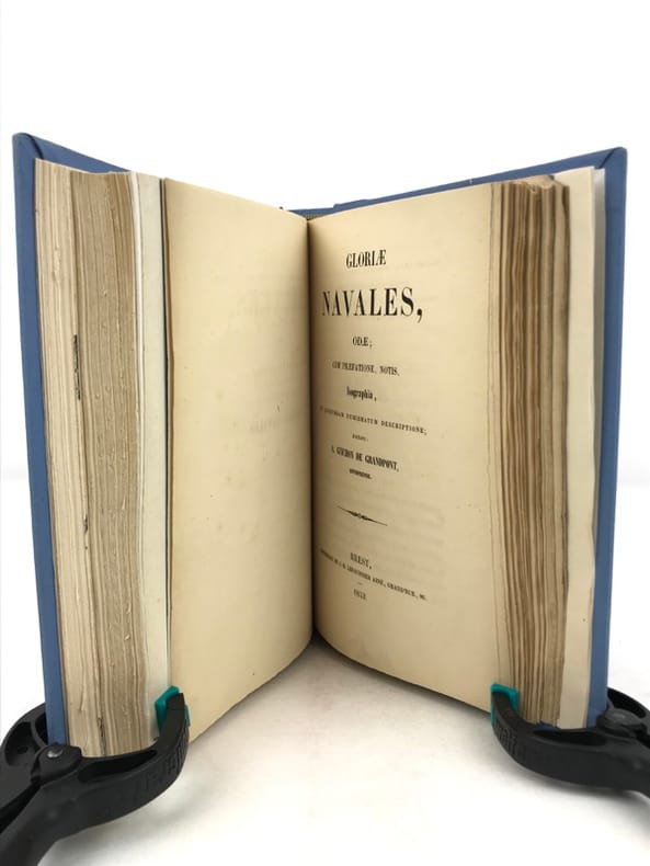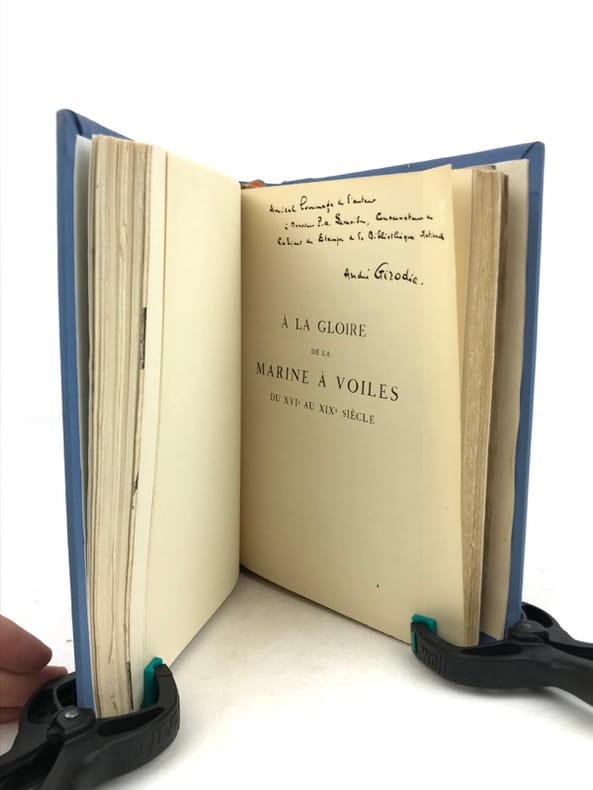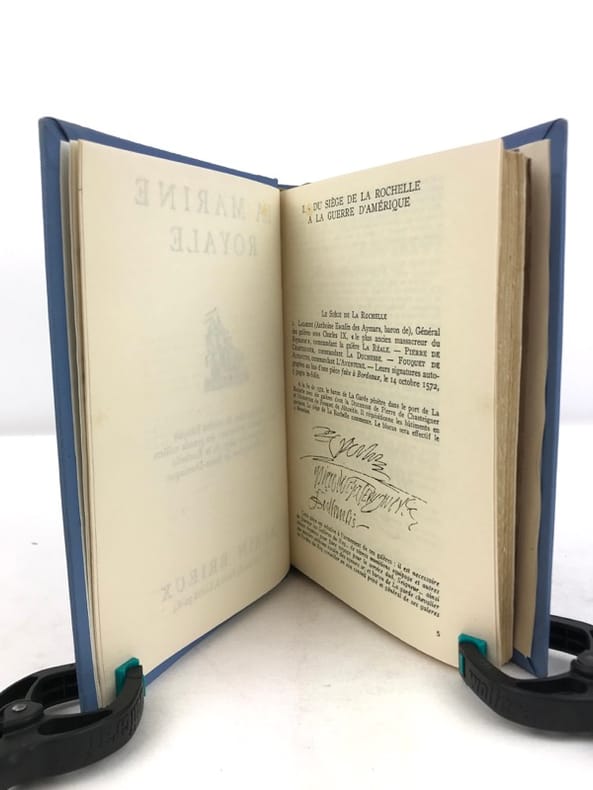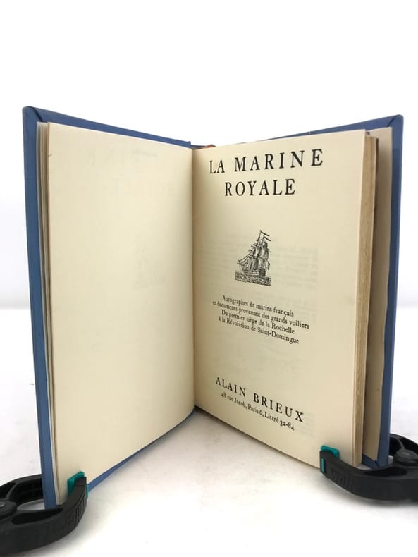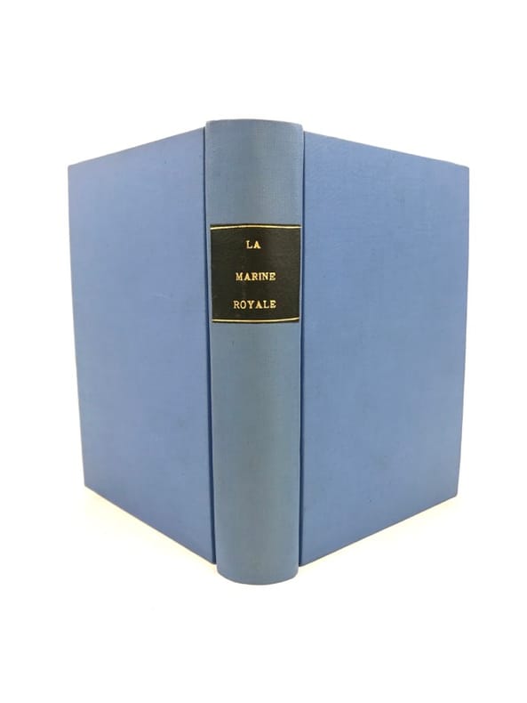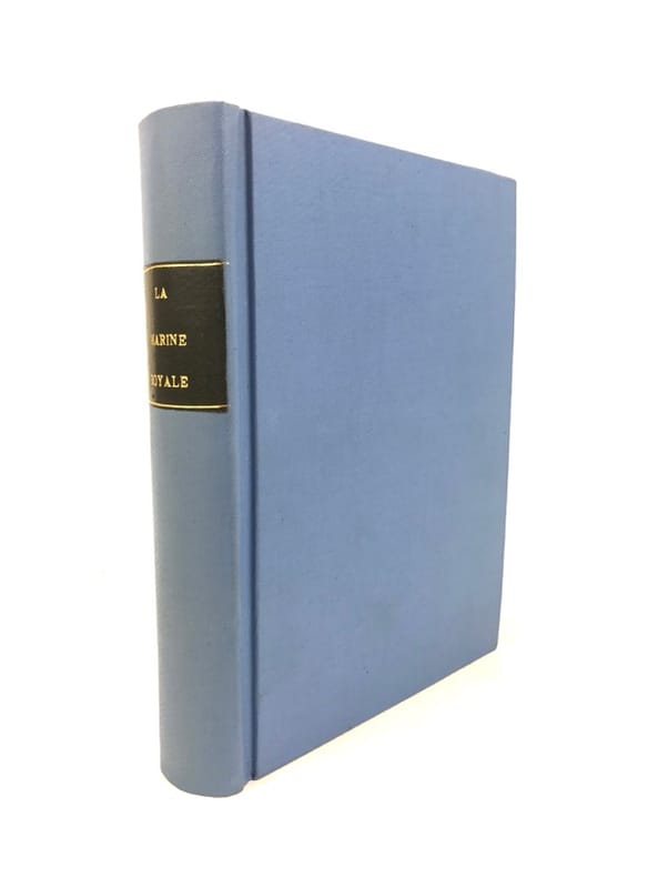3 textes en 1 volume in-12 (18,5 cm x 13 cm), toile bleue à la bradel, pièce de titre noire, couverture conservée, envoi de l’auteur du deuxième texte sur la page de faux-titre. 59-[1]-xxiii-192-xii-124-26-[2] pages (complet). Feuillets jaunis. Bon état. Éditions originales illustrées de planches fac-similé. Recueil factice composé de trois textes sur la Marine Royale, nom donné à la marine de guerre française sous la monarchie. Elle a eu l'appellation de Marine royale de sa création en 1624 jusqu'à la chute de la monarchie en 1848. Elle est appelée Marine impériale sous les deux empires, et Marine nationale sous les régimes républicains. Agréable exemplaire.