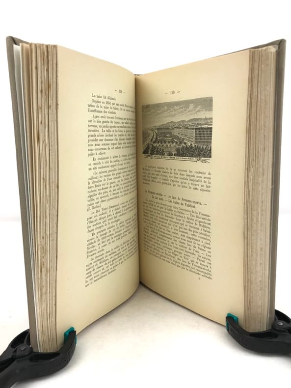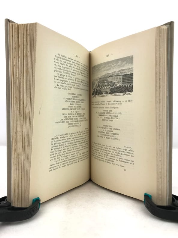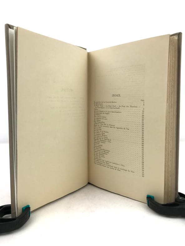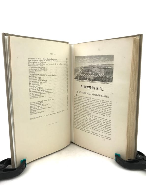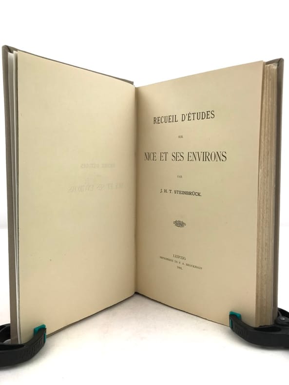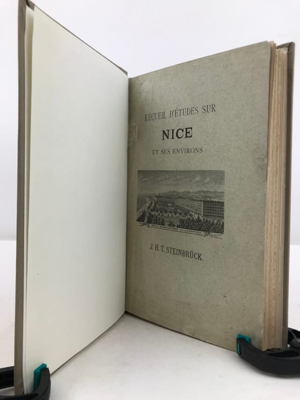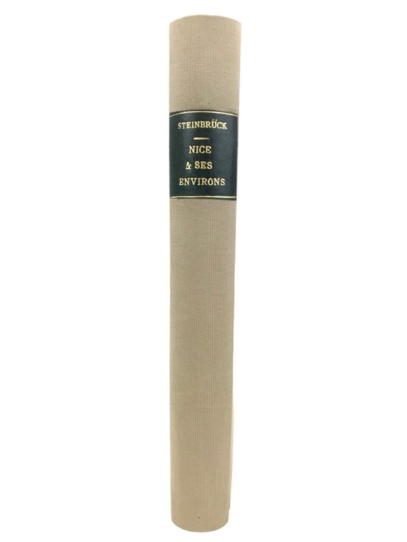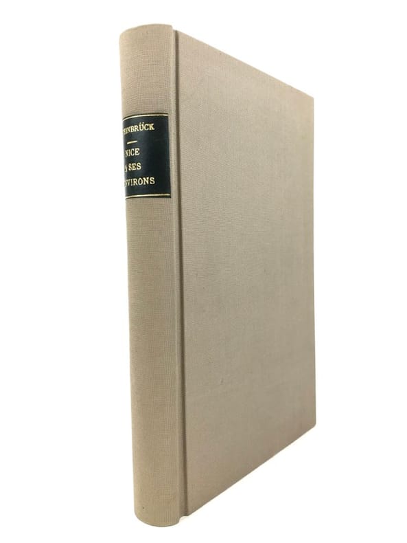 1 volume in-8 (22,5 x 14 cm), percaline grise (reliure à la Bradel), couverture conservée, dos lisse avec pièce de titre en basane noire, viii-413-[1] pages (complet). Bon état. ÉDITION ORIGINALE de cette monographie sur la ville de Nice, illustrée de quelques vignettes in-texte. J. H. T. Steinbrück, directeur de l’Hôtel d’Angleterre - hôtel de luxe situé sur la Promenade des Anglais de 1862 à 1909 -, souhaite ici faire découvrir cette ville de la Côte d’Azur, à travers son Histoire et sa géographie. Il prend soin de rédiger une partie du texte en anglais, et une autre en allemand, afin de le rendre lisible à divers lecteurs étrangers. Rare exemplaire.
