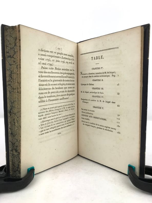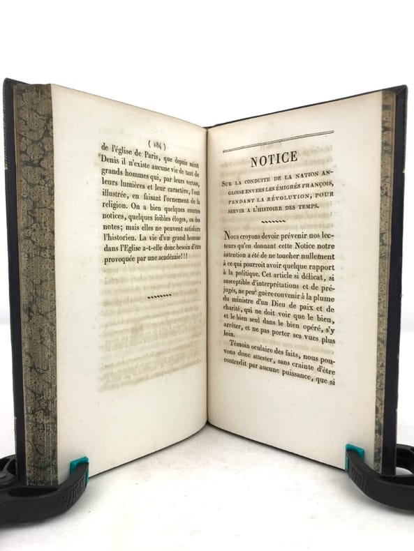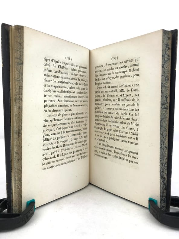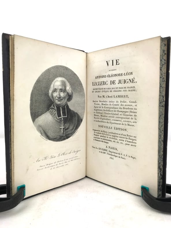 1 volume in-8 (20 cm x 12,5 cm), basane bleue (reliure de l’époque), dos lisse à motifs dorés, filet doré en encadrement des plats, motifs centraux marqués à froid sur les plats, tranches marbrées. [4]-xiii-[3]-222-[1]-1 bl. pages (complet). Légers frottements à la reliure, feuillets ternis, claires rousseurs. État très correct. Nouvelle édition illustrée d’un portrait de l’archevêque. Antoine Éléonor Léon Leclerc de Juigné de Neuchelles (1728-1811) est un évêque français qui exerça sa charge au xviiie siècle. Archevêque de Paris, il fut élu député du clergé aux États généraux de 1789. Agréable exemplaire.