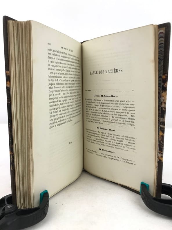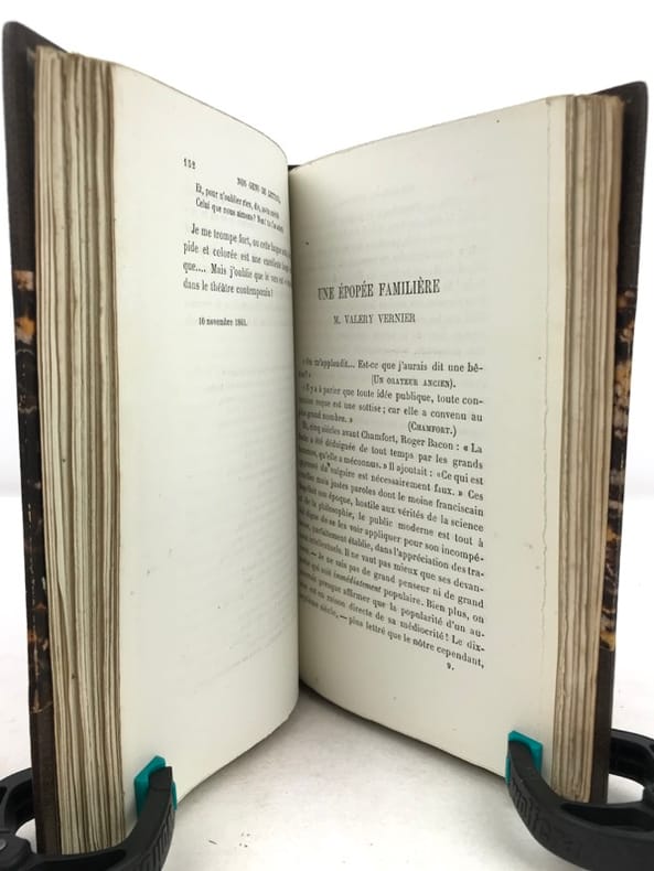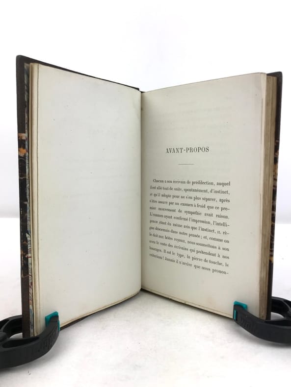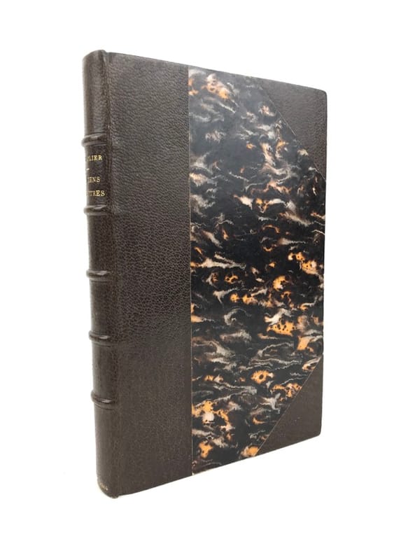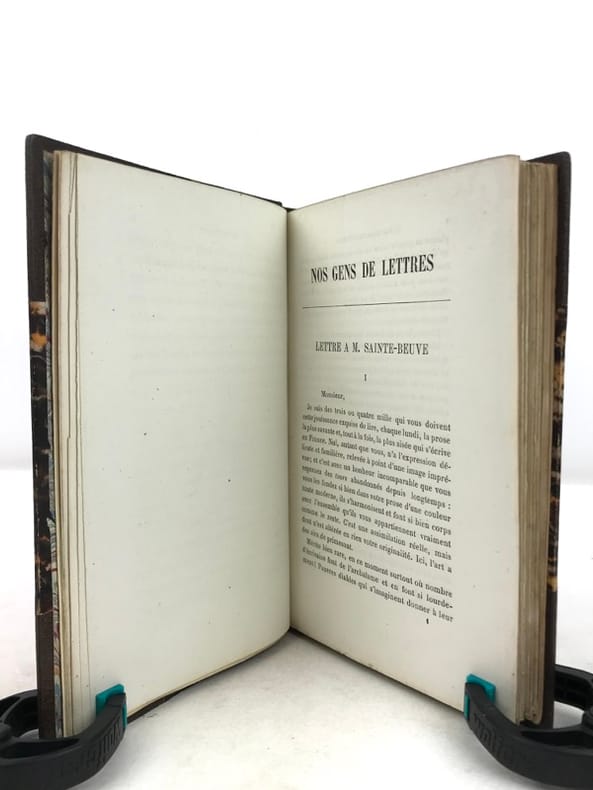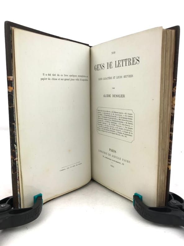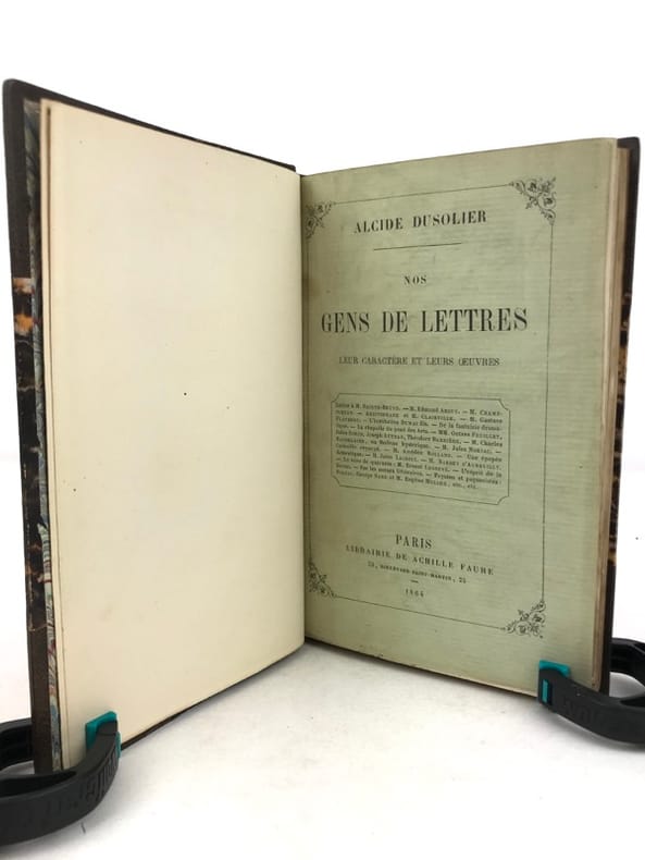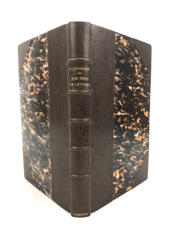 1 volume in-8 (18,5 cm x 11,5 cm), demi-chagrin brun à coins (reliure de l’époque signée Reymann), dos à nerfs, couverture conservée, xi-1 bl.-292 pages (complet). Rares piqûres. ÉDITION ORIGINALE. François Alexis Alcide Dusolier, (1836-191), est un écrivain, journaliste et un homme politique français. Il dresse ici le portrait de nombreux écrivains du XIXème : Sainte-Beuve, Dumas, Clairville, ou encore Baudelaire. Agréable exemplaire.