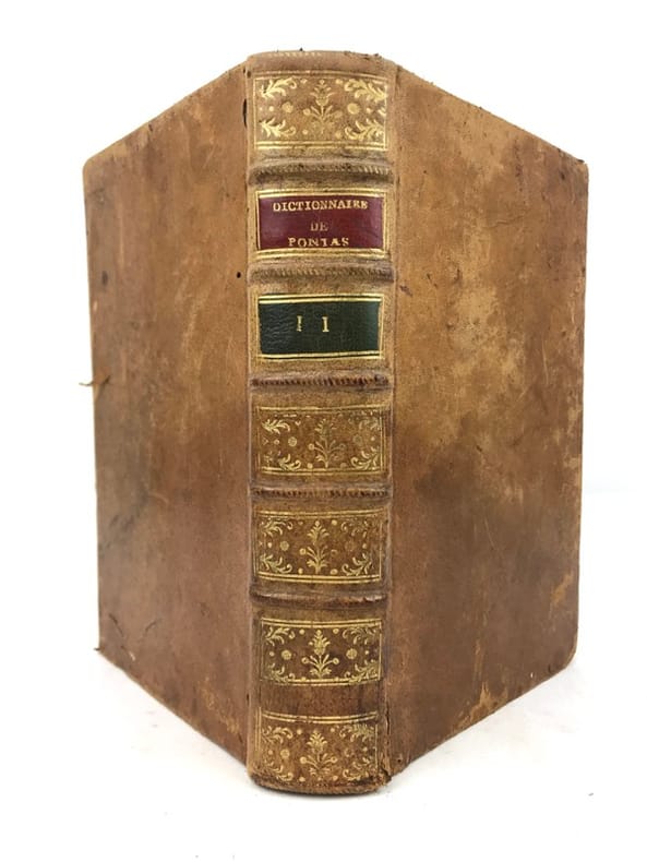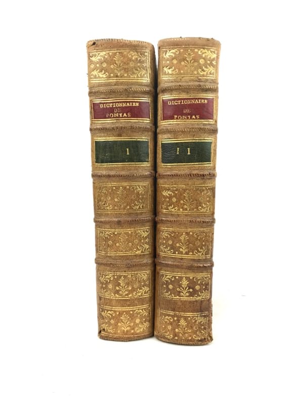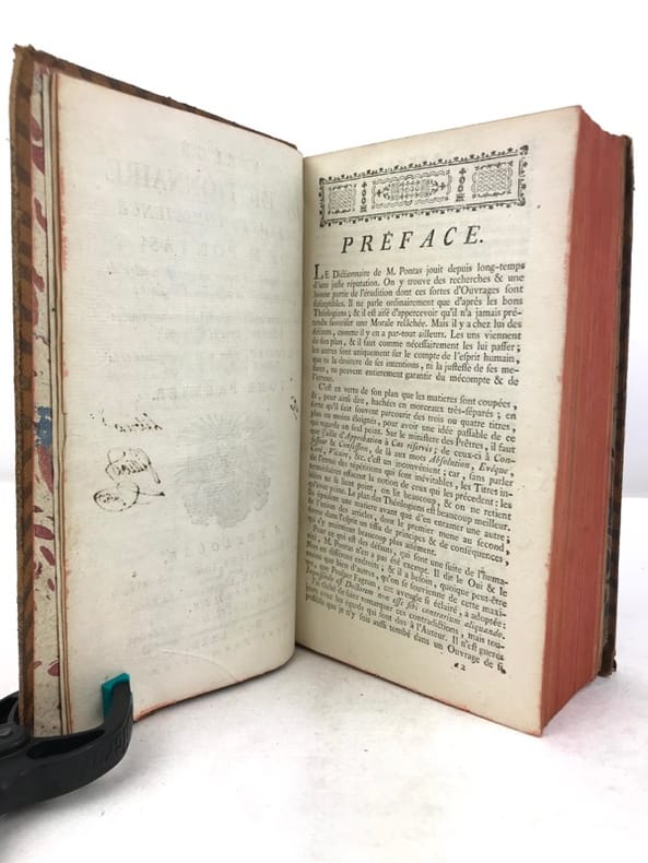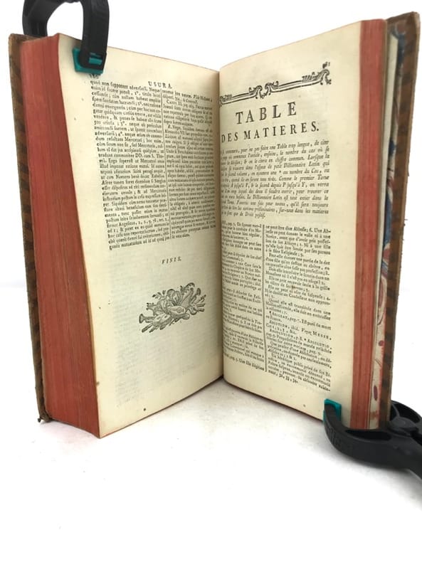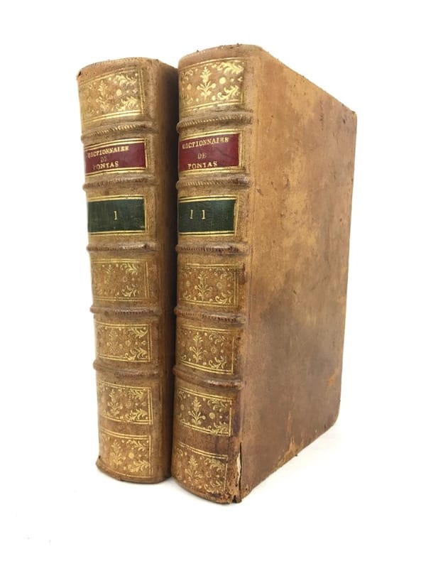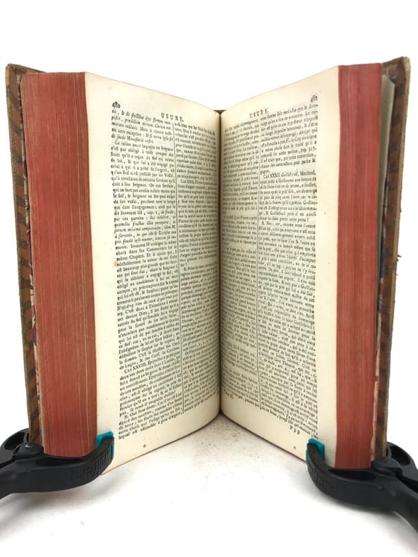 1764 Paris, chez les Libraires associés , 1764 ; 2 volumes in-4°, plein veau fauve marbré de l' époque, dos à nerfs, compartiments de double filet doré, ornés de fleurons et petits fers dorés, titre doré sur étiquette de maroquin vieux rouge, tomaison sur étiquette de maroquin brun, tranches rouges ; XIIpp. , 566 col. (texte sur 2 colonnes) ,740 col. ( texte sur 2 colonnes ) ; (4)pp., 1386 col. ( texte sur 2 colonnes) et 3pp.( addition, approbation, privilège ) placées entre les col. 1354 et 1355.